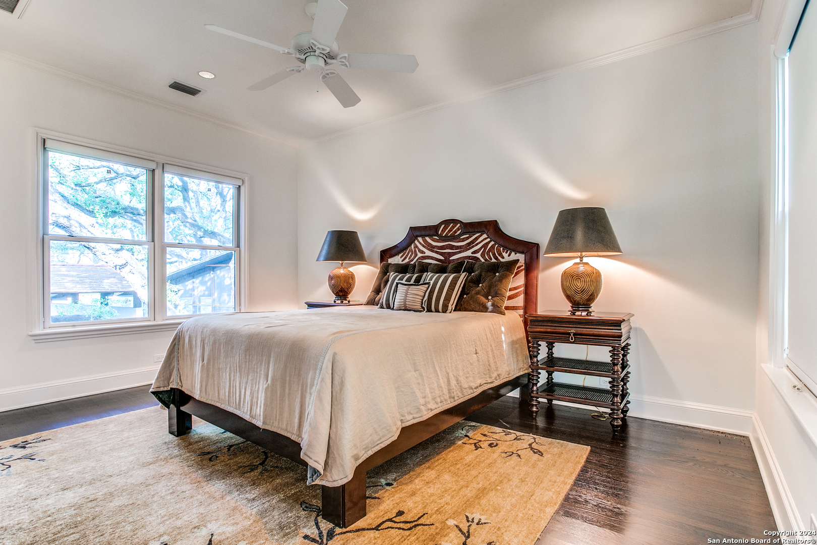 Stunning duplex in old Alamo Heights. Completely updated inside & out. Top floor unit with incredible downtown views on rooftop deck. Updated features include custom cabinets, wood floors, marble bath, 9ft ceilings, and charm galore. Living area is open to kitchen that has all SS appliances, Miele coffee machine, gas cooking, and island breakfast bar. Floor to ceiling double paned windows in living room. Loft opens to rooftop deck with gas grill.