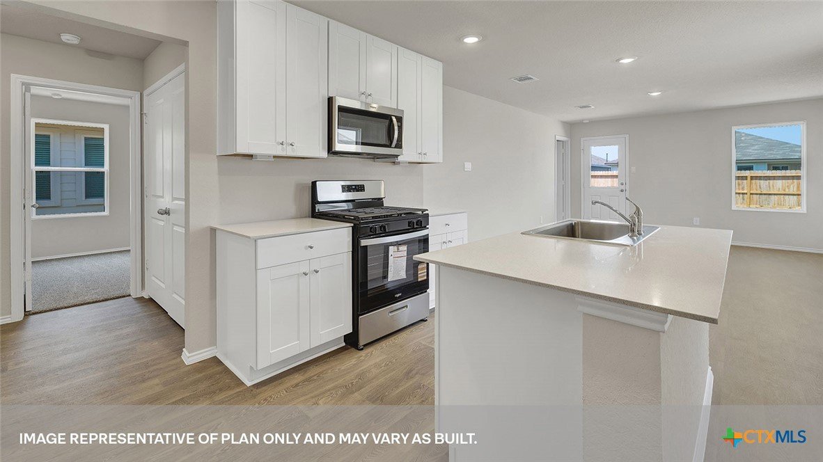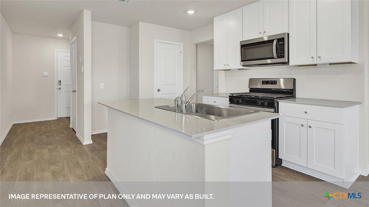FEBRUARY ESTIMATED COMPLETION. The Atlanta is one of our one-story floorplans featured in our Sunset Oaks community in Maxwell, Texas. This 1,156 square foot home includes 3 bedrooms, 2 bathrooms and a 2-car garage. Our homes in Sunset Oaks feature our modern farmhouse exterior. Step inside the Atlanta and enter the heart of the home, the open concept living space. The kitchen, dining and living room are intentionally designed for everyday living and entertaining. The kitchen features an island with a stainless-steel sink, quartz countertops, 42’ upper ‘picture frame’ cabinets, a pantry closet, and stainless-steel appliances, including a gas range. The secondary bedrooms are located off the kitchen, as well as a secondary bathroom and utility room. The bedrooms include carpet and closets with wood shelving. The secondary bathroom has a shower/tub combination and a cultured marble vanity with trench sink. The primary bedroom is tucked away at the back of the home and includes an attached bathroom. Stretch out at the end of the day in this owner’s retreat, which includes a walk-in shower, cultured marble vanity with trench sink and a large walk-in closet. This home features our America’s Smart Home base package, which includes the Video Front Doorbell, Front Door Deadbolt Lock, Home Hub, Thermostat, and Deako® Smart Switches.