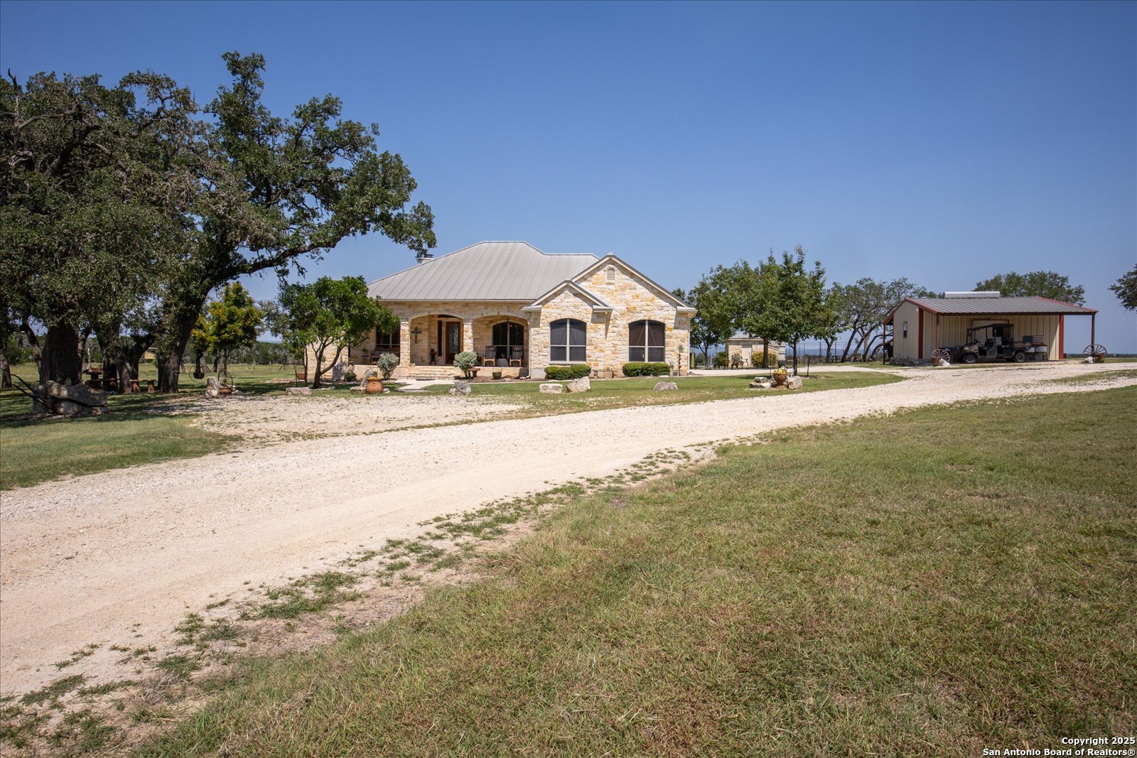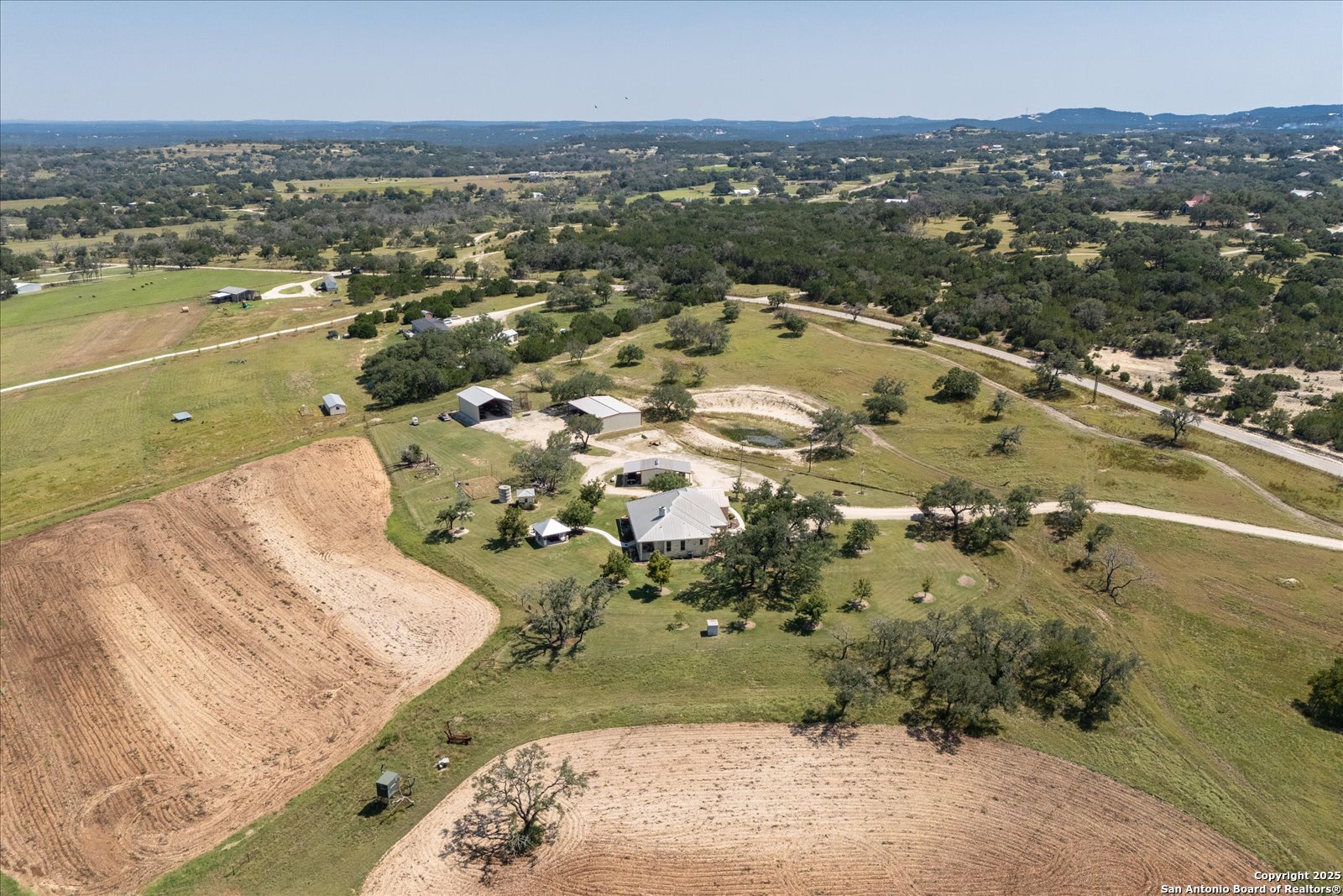 Experience Hill Country living at its finest with this unrestricted ranch property just 15 minutes from Boerne and the historic town of Comfort. Set behind a private electric gate, this property offers sweeping Hill Country views, wide-open spaces, and the perfect blend of comfort and functionality. The custom-built single-story home by Kevin Katzer welcomes you in. This beautiful home has a stunning floor to ceiling rock surround propane/wood burning fire place in the living room that sets the tone for conversations and cozy winter days. An open kitchen concept with oversized island has built in stainless appliances complete with warming drawer. The primary suite is separated from the other bedrooms and has outdoor access to the patio and includes a spacious en-suite bathroom. Double vanities, jetted tub and walk in shower. Laundry room with storage, sink and window for light. Step outside to a covered patio with seating and room for all the fun conversations! A pergola with built in sink, twinkling lights and and a round fire pit-ideal for evenings under the Texas sky. Designed with both recreation and ranching in mind, the property is fully fenced and cross-fenced, making it ready for livestock or horses. Two large barns (40x60) with enclosed storage area, a (30x45) with RV hookup, and a spacious 24x24 workshop (complete with bathroom) all feature electric service, providing ample space for storage, projects, and ranch operations. An agricultural exemption keeps property taxes low, spray foam insulation adds to the low electric bills, all adding long-term value to this remarkable Hill Country retreat. Whether you're seeking quiet country living, generational living opportunity, a property to work the land, an equestrian space, or simply a peaceful escape with modern conveniences nearby, this property offers it all. Get your showing scheduled today!