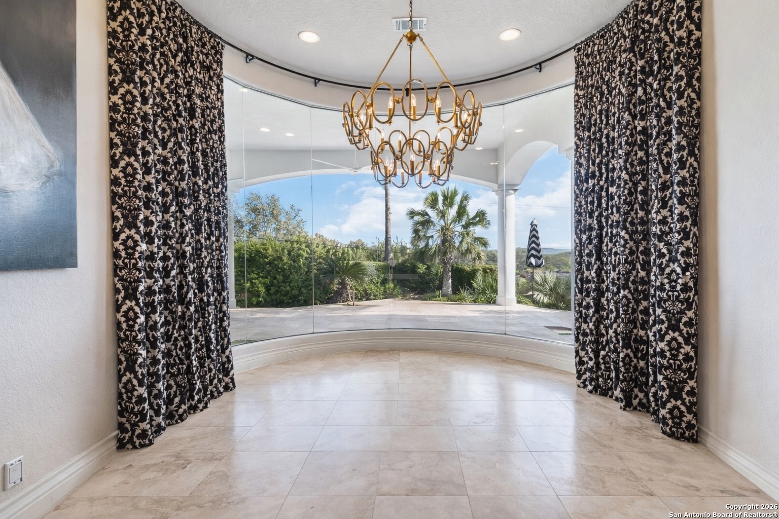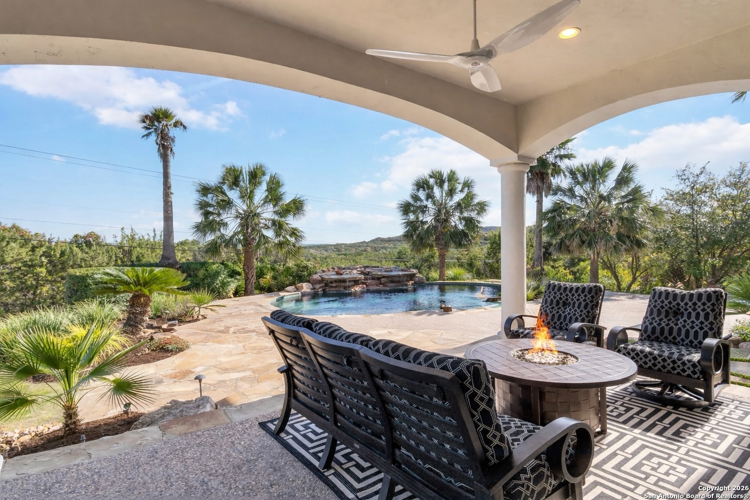 Welcome to your stunning retreat in the prestigious Dominion community! Situated on a rare, spacious property with excellent privacy and east facing rear entertaining, this extraordinary home offers breathtaking views from the main living area and every bedroom, creating the perfect setting for an unparalleled lifestyle. Meticulously designed, the open floor plan welcomes you with awe-inspiring east facing views of Camp Bullis, seamlessly blending indoor and outdoor living. The living room opens to a large patio, complete with a resort-style pool, perfect for relaxation and entertaining. Adjacent is the state-of-the-art Chef's kitchen, equipped with top-tier appliances, custom cabinetry, and premium countertops, catering to the most discerning culinary enthusiast. Designed with the entertainer in mind, the home boasts striking designer glass windows that flood the space with natural light while enhancing a peaceful yet sophisticated atmosphere. The main level master suite is a private oasis, featuring a spacious sitting area, jaw-dropping views, and a luxurious en-suite bath adorned with chic designer finishes. The bath includes a steam shower, garden tub, and expansive walk-in closets, offering a serene retreat. The second level transforms into an entertainment hub, complete with a large media and game room. This level also includes two spacious bedroom suites and a screened-in patio, providing one of a kind views to enjoy at any time of day. Wake up to endless sunrises and experience the epitome of luxury living. This estate offers a lifestyle that feels like a year round vacation. Welcome to your dream home. (This home has been meticulously maintained with many upgrades including a commercial grade whole home back up generator direct connected)
