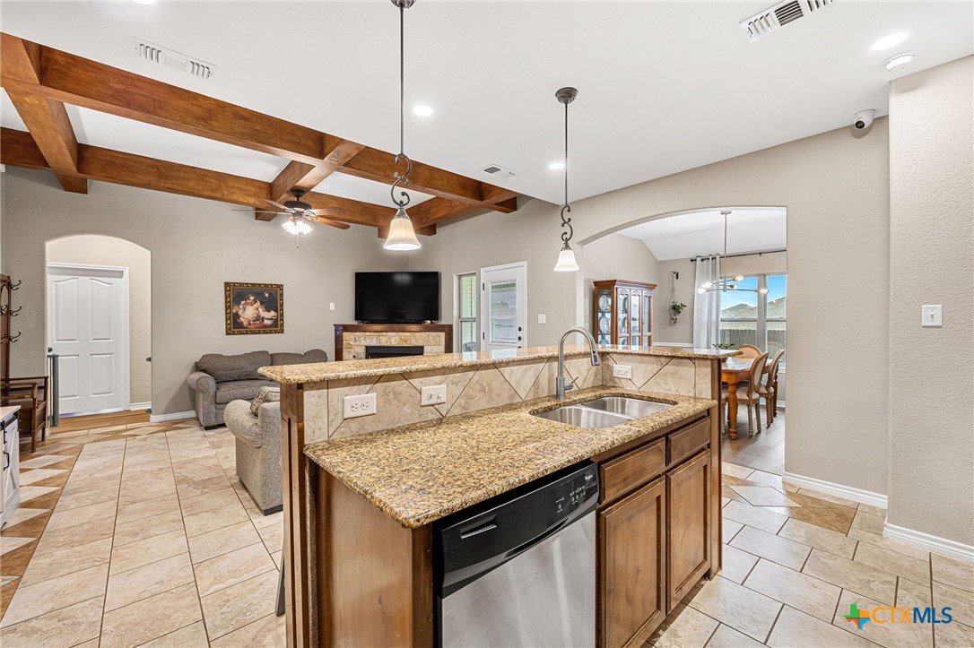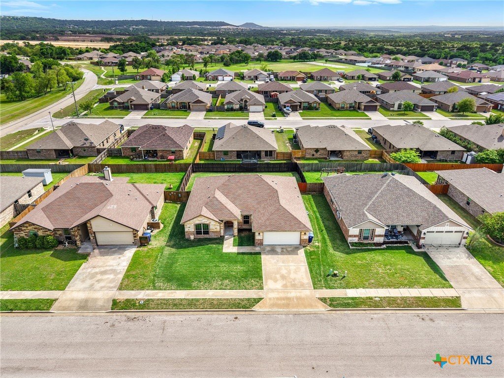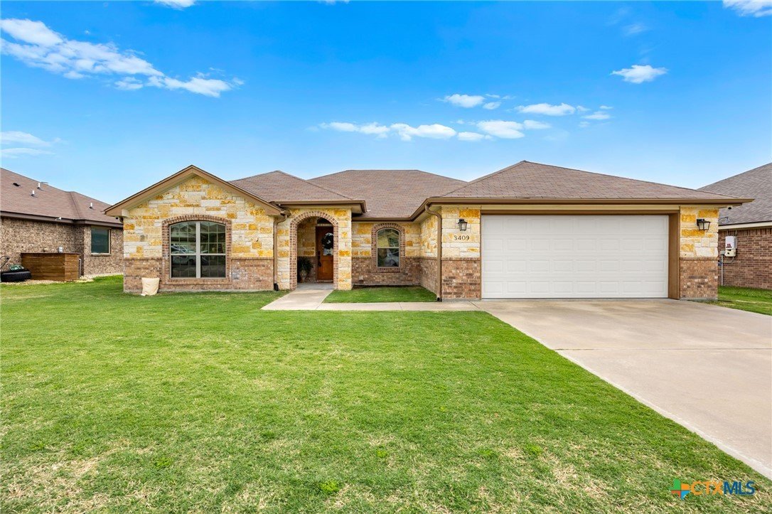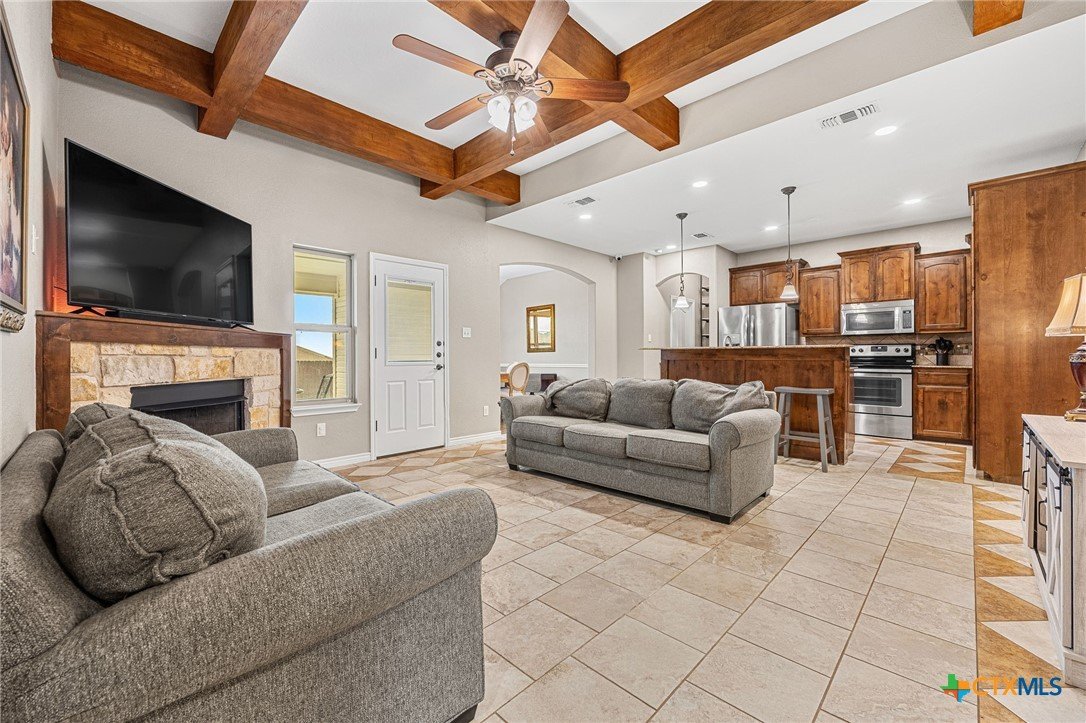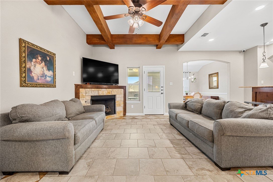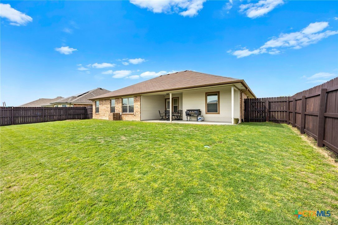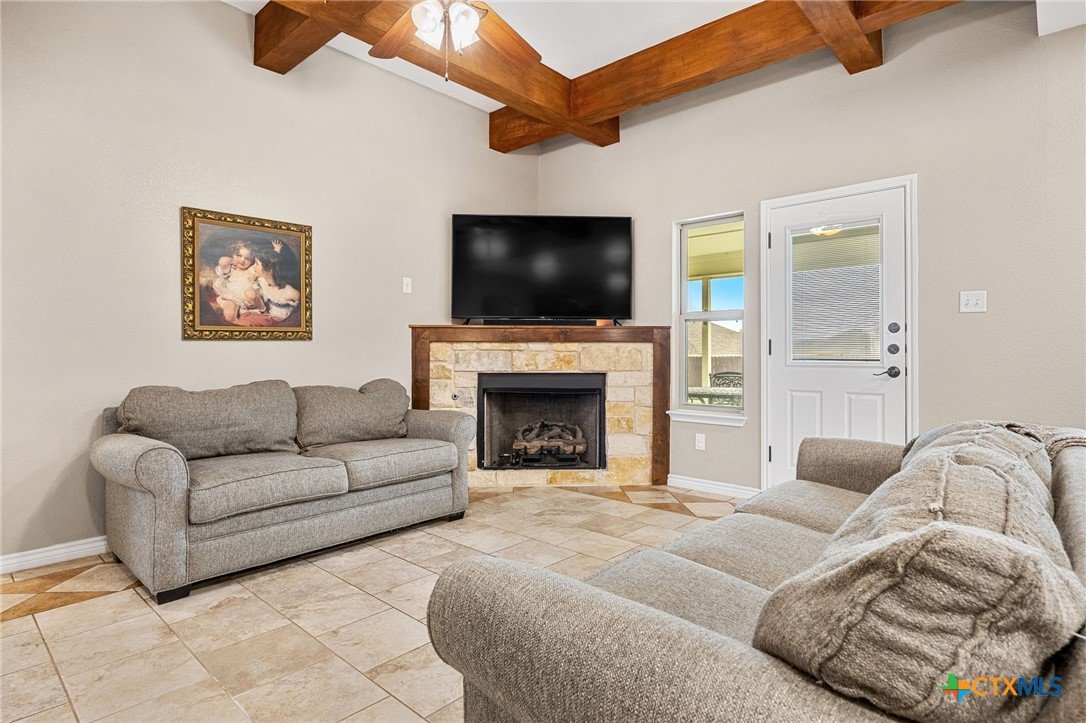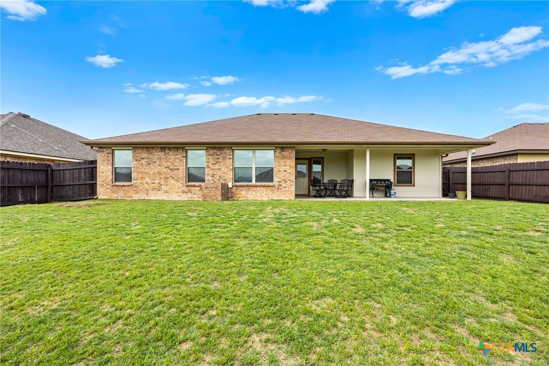Thoughtfully designed and beautifully maintained, this all brick 4-bedroom, 2-bath home offers comfort, style, and convenience in a prime Copperas Cove location—just minutes from schools, shopping, dining, entertainment, and Fort Hood. The open-concept floor plan is enhanced by a striking coffered ceiling and a cozy wood-burning fireplace with a stone surround, creating a warm and inviting living space. Elegant tile flooring with decorative accents flows throughout the main areas. The kitchen is a standout, featuring granite countertops, upgraded cabinetry, a breakfast bar, and a bright breakfast area—perfect for both everyday living and entertaining. The spacious primary suite offers a walk-in closet, ceiling fan, and a luxurious en suite bathroom complete with a large garden tub, oversized walk-in shower, and dual vanities. In addition to the primary suite, the home features three well-appointed guest bedrooms and a full bathroom, providing ample space and flexibility for family, guests, or a home office. Step outside to enjoy the private backyard, where a covered patio provides the ideal setting for relaxing evenings, weekend gatherings, or family fun. This home combines thoughtful design and desirable features in a location that truly delivers.