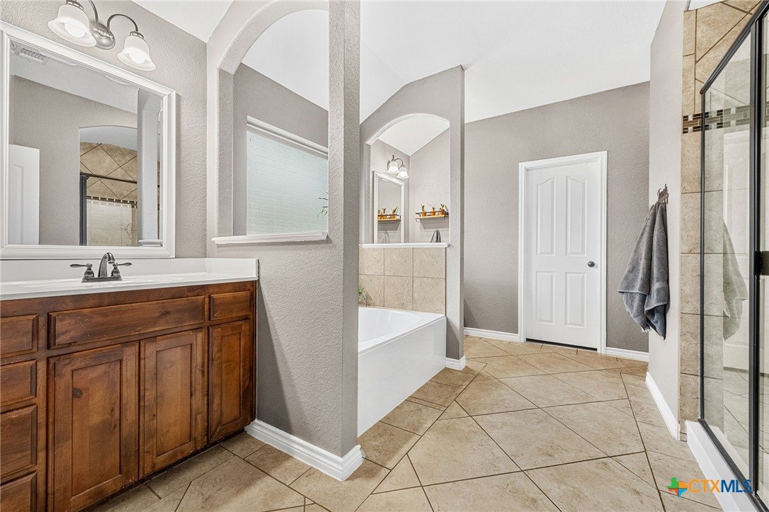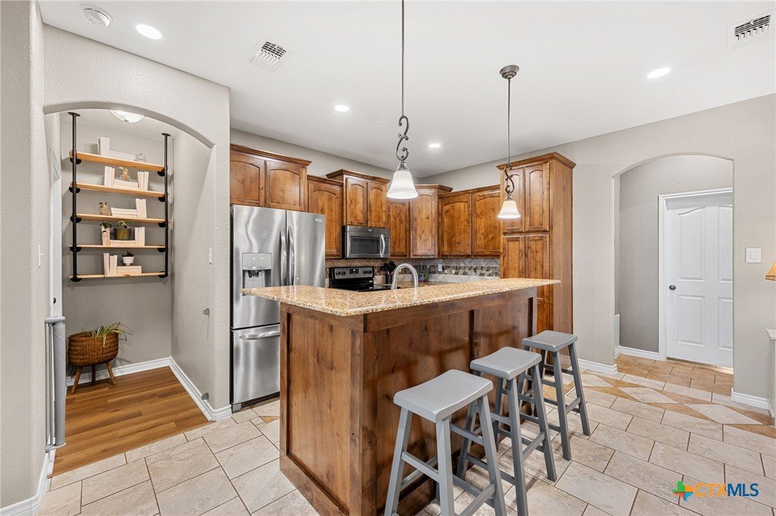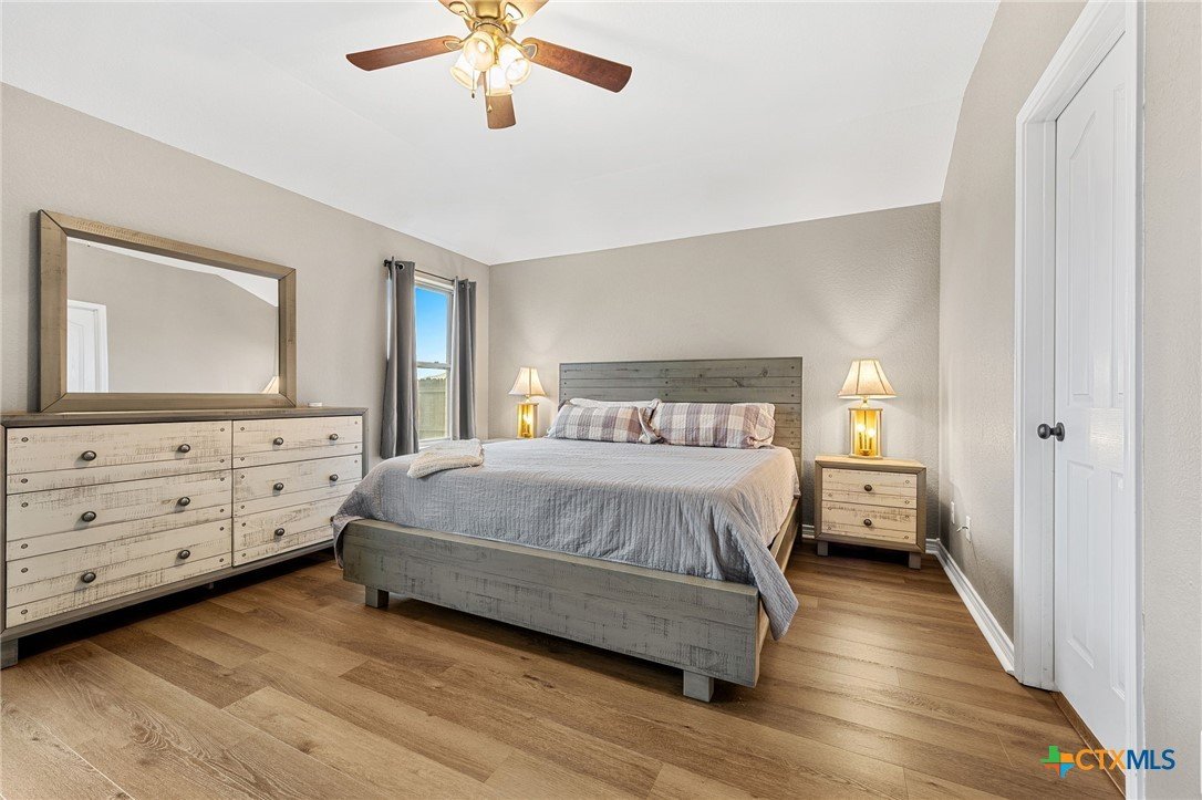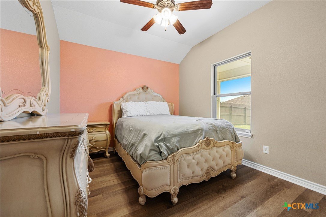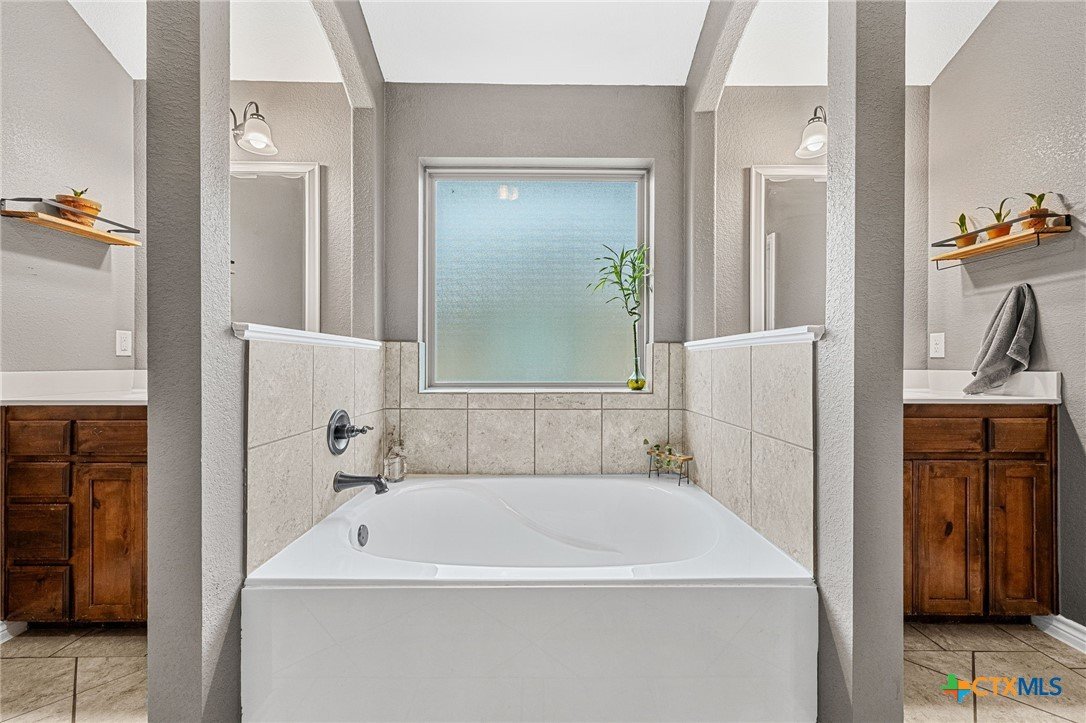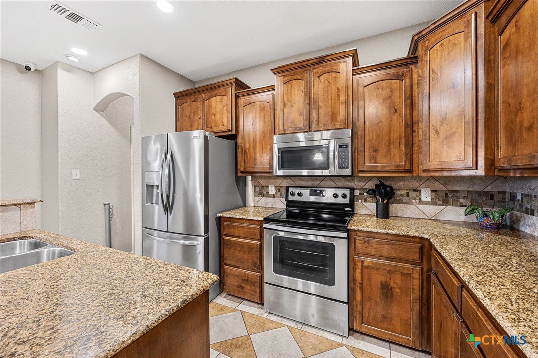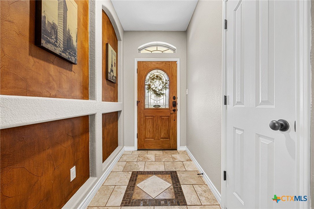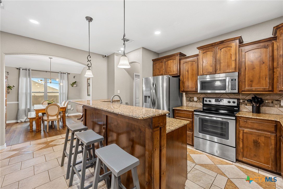 Thoughtfully designed and beautifully maintained, this all brick 4-bedroom, 2-bath home offers comfort, style, and convenience in a prime Copperas Cove location—just minutes from schools, shopping, dining, entertainment, and Fort Hood. The open-concept floor plan is enhanced by a striking coffered ceiling and a cozy wood-burning fireplace with a stone surround, creating a warm and inviting living space. Elegant tile flooring with decorative accents flows throughout the main areas. The kitchen is a standout, featuring granite countertops, upgraded cabinetry, a breakfast bar, and a bright breakfast area—perfect for both everyday living and entertaining. The spacious primary suite offers a walk-in closet, ceiling fan, and a luxurious en suite bathroom complete with a large garden tub, oversized walk-in shower, and dual vanities. In addition to the primary suite, the home features three well-appointed guest bedrooms and a full bathroom, providing ample space and flexibility for family, guests, or a home office. Step outside to enjoy the private backyard, where a covered patio provides the ideal setting for relaxing evenings, weekend gatherings, or family fun. This home combines thoughtful design and desirable features in a location that truly delivers.