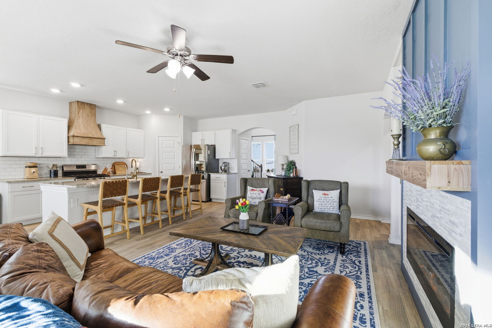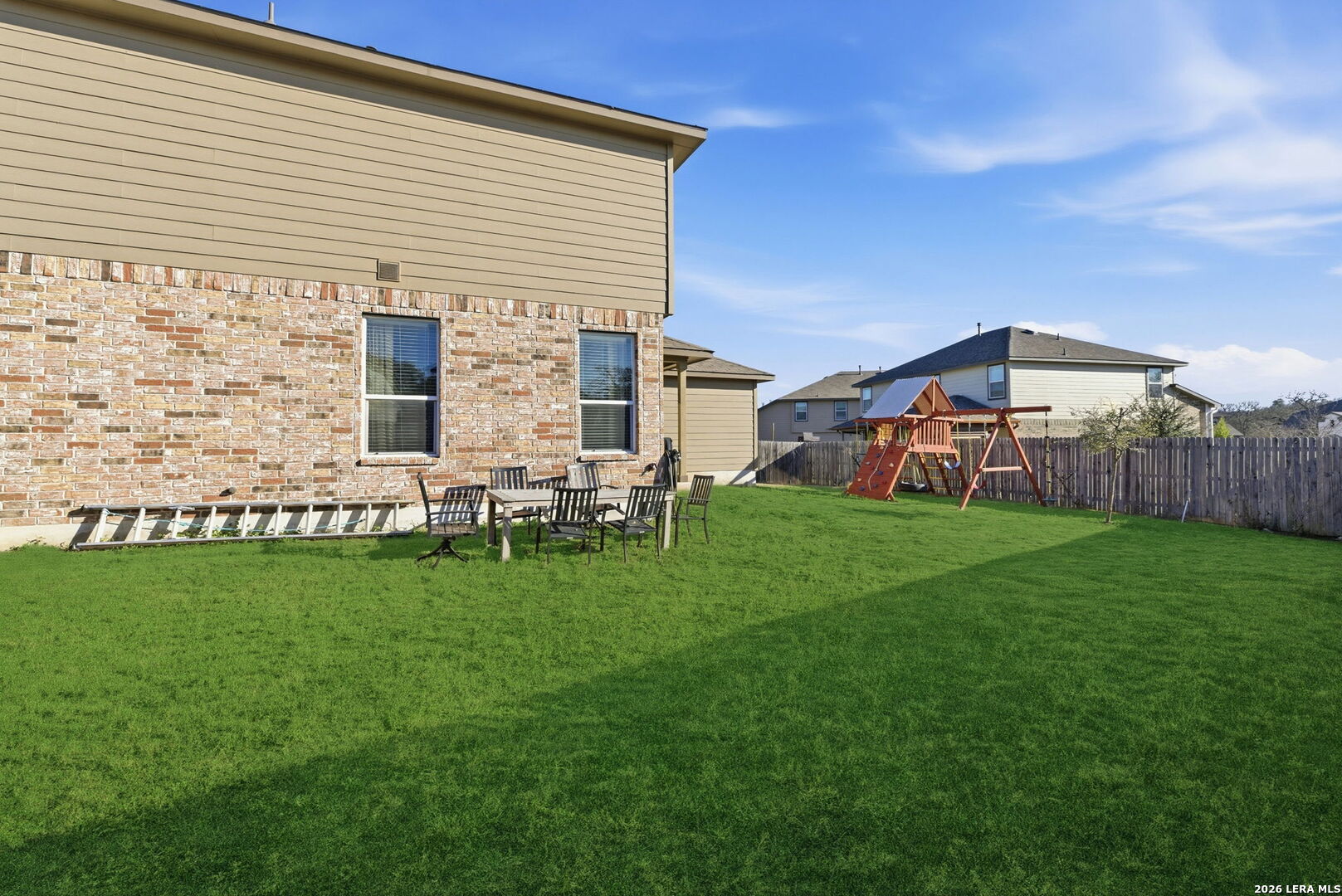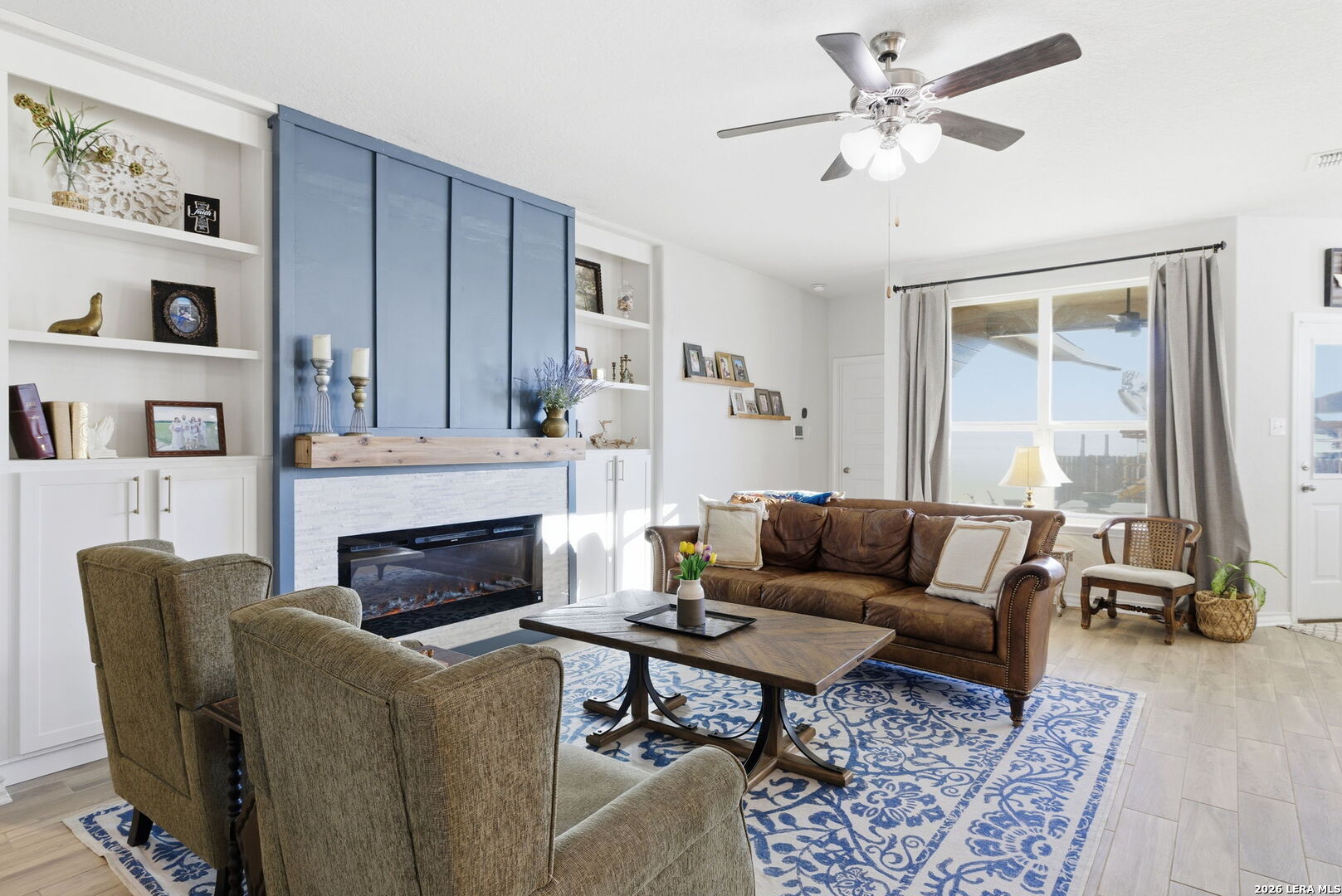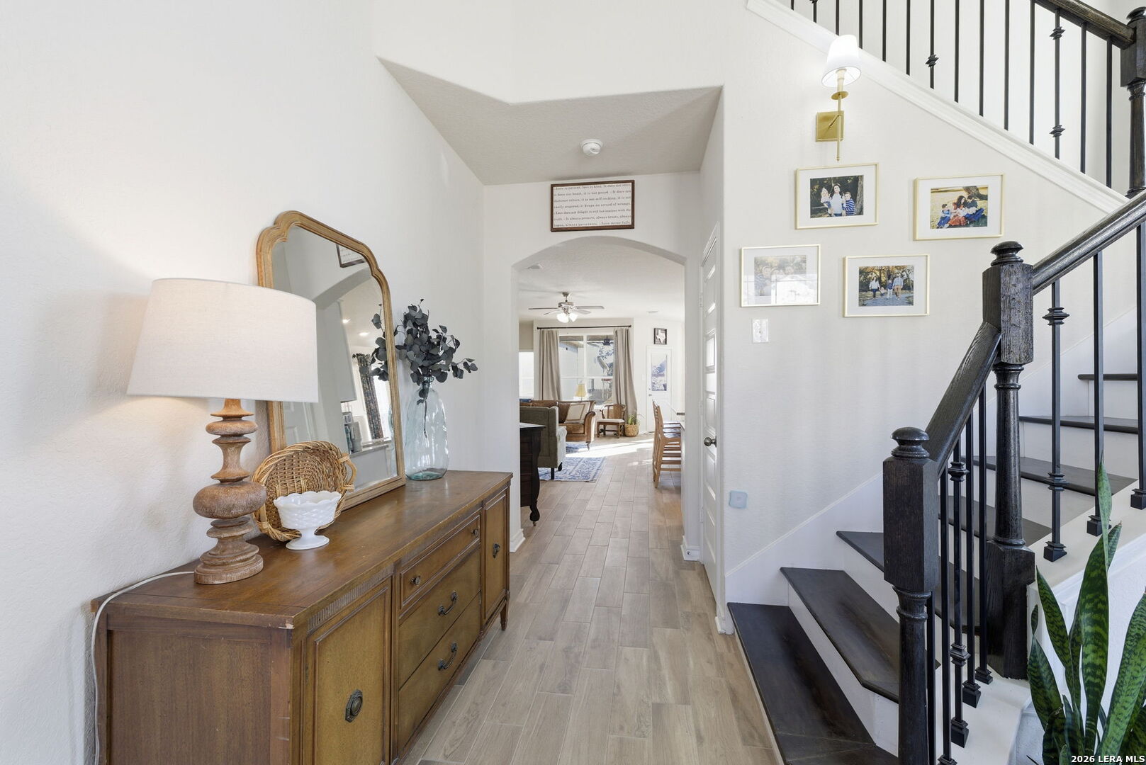Located in sought-after Copper Canyon and just a five-minute walk to neighborhood amenities, this beautifully upgraded 5-bedroom, 3.5-bath residence offers 2,869 square feet of thoughtfully curated living space on a spacious 1/4-acre corner lot. From the charming stone exterior to the inviting front porch, the home makes a striking first impression. The moment you step inside, soaring ceilings and abundant natural light create a bright, uplifting atmosphere. Inside, porcelain wood-look tile spans the entire first floor, creating warmth, durability, and visual continuity. The open-concept layout is anchored by a stunning living room featuring a custom electric fireplace with 42" built-ins, blending warmth and architectural detail while providing functional storage. The kitchen has been tastefully elevated with granite countertops, stainless steel appliances, decorative brass handles and a custom decorative wood hood vent that serves as a beautiful focal point. Adjacent to the kitchen, the dining space is enhanced by a designer light fixture and a custom decorative plate rack, adding character and charm to everyday gatherings. Spacious primary suite featuring vaulted ceilings, abundant natural light, and warm porcelain tile for a bright, airy feel. The room comfortably accommodates large furniture. The en-suite bath offers a spa-like retreat with a soaking tub framed by elegant tile surround, and custom Quartz double vanity with updated gold fixtures, lighting and framed mirrors. Large windows enhance the space with natural light, creating a clean, relaxing atmosphere perfect for unwinding. Upstairs feels like an entirely separate sanctuary, offering a private retreat from the main living areas. The expansive family room is anchored by a custom built-in, blending thoughtful organization with refined design and elevating the space beautifully. The solid wood staircase adds richness and craftsmanship rarely found in this price range. All bathrooms have been thoughtfully updated with refined finishes. The secondary bedrooms are generously sized and feature walk-in closets along with ceiling fans for year-round comfort. Each of the four bedrooms includes access to a Jack-and-Jill bathroom, offering excellent functionality and convenience for secondary living spaces Outdoors, the covered patio overlooks the expansive backyard, offering ample room for a future pool, garden, or entertaining space - a rare benefit of the oversized corner lot. One of the most exceptional aspects of this home is the community, numerous monthly events offered for all members of your family to enjoy. This home offers intentional upgrades throughout, generous living spaces, and a prime location, at an exceptional value!