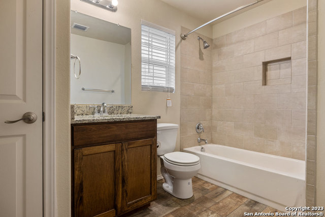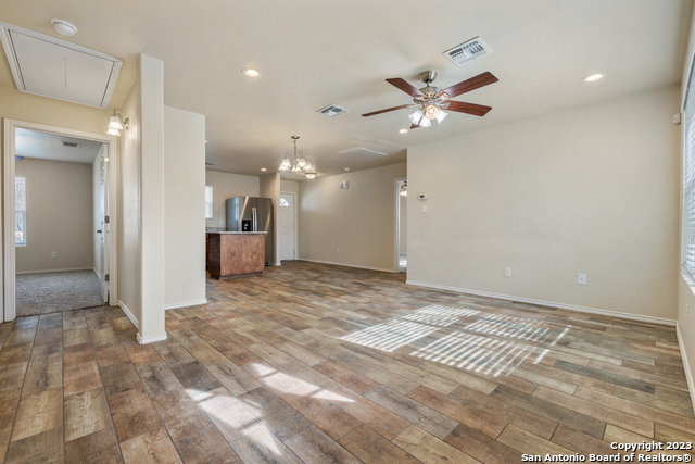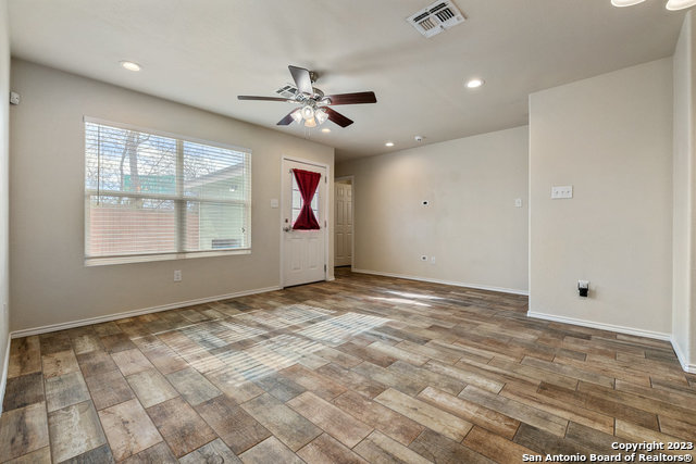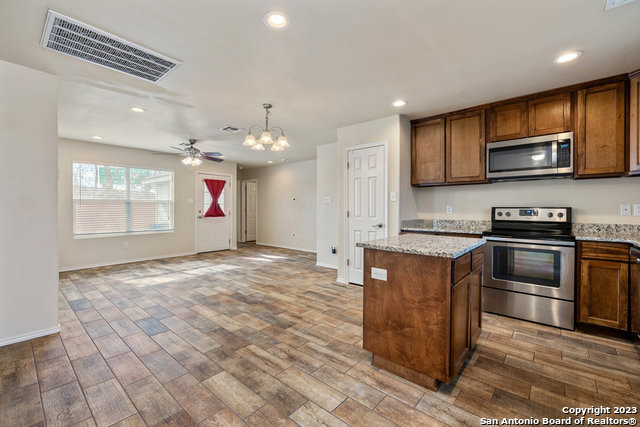 3 bedroom/ 2 bath home features matching stainless steel appliances including: refrigerator. microwave oven, dishwasher, garbage disposal electric range/oven. Granite counter tops and island in kitchen area. Open-Floor Plan, Faux Wood Blinds, Pre-wired for Security, Close to ATT center and downtown San Antonio, and major highways to travel all throughout San Antonio