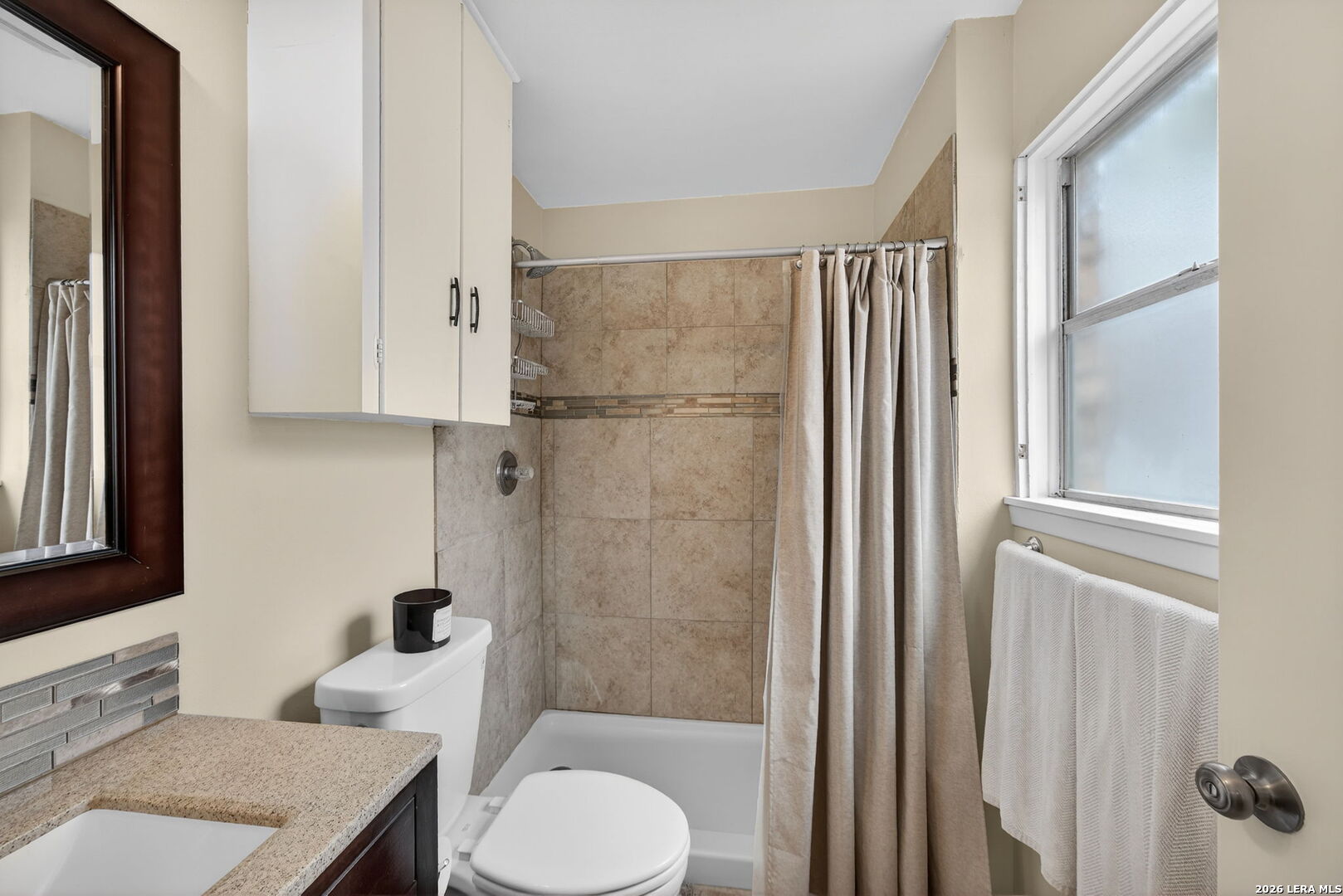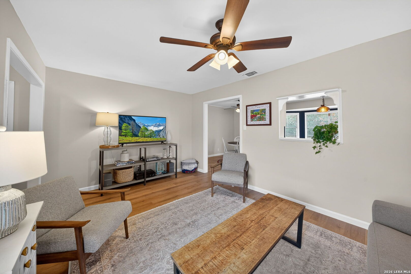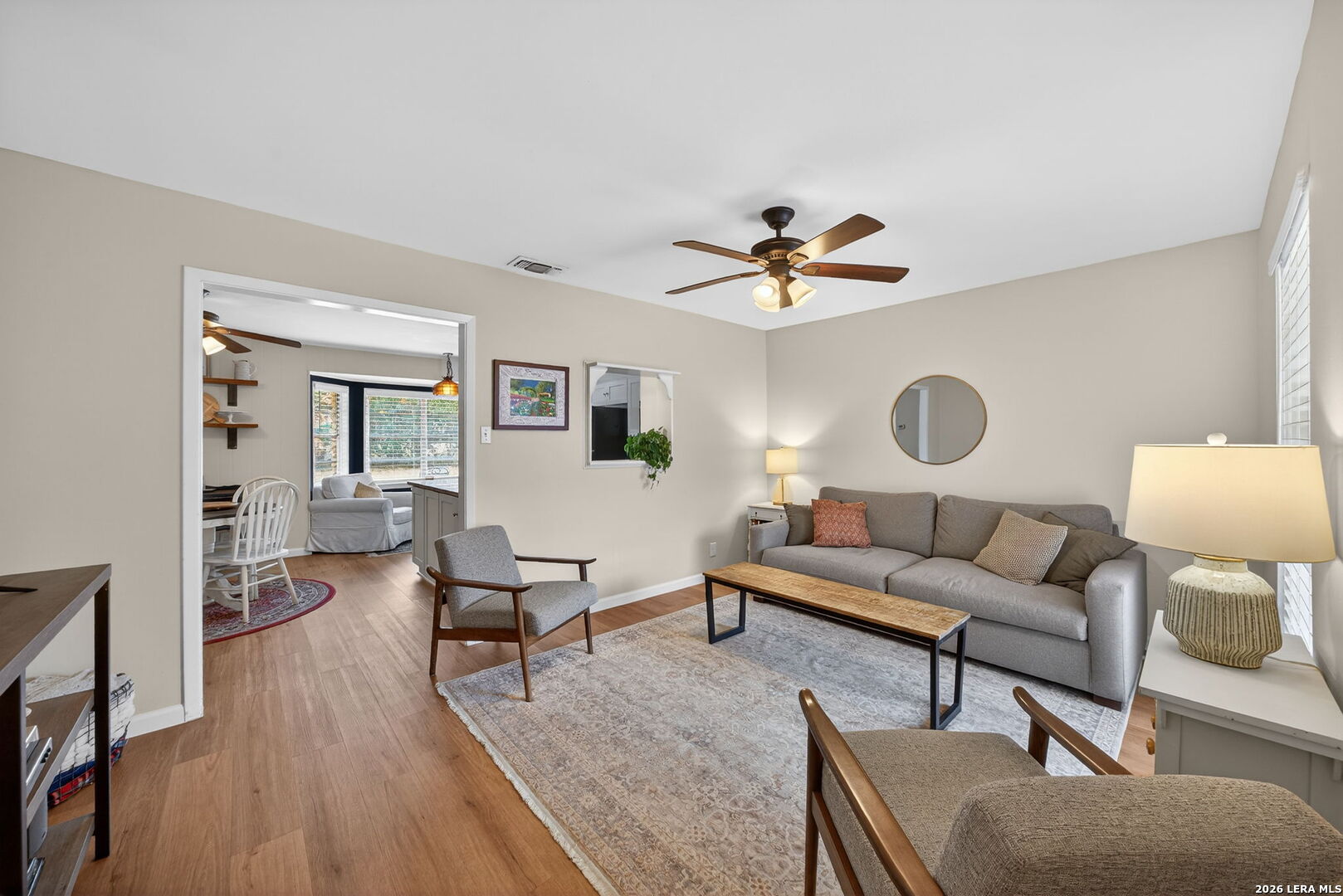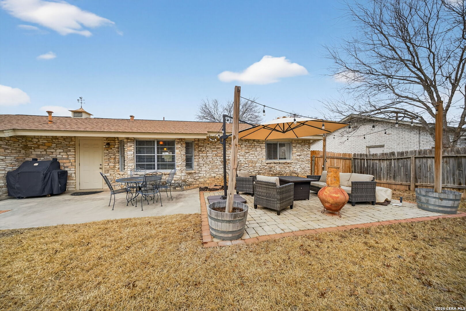 Welcome to this beautifully maintained single-story home in the established and centrally located community of Colonies North. Nestled on an +/- 0.199-acre lot with mature trees, this 3-bedroom, 2-bath home offers the perfect combination of comfort, functionality, and convenience. From the moment you arrive, the four sides stone exterior and inviting covered front porch create timeless curb appeal. Inside, you'll find a bright and open floor plan where the spacious living area flows effortlessly into the kitchen and dining space, making it ideal for everyday living and entertaining guests. Enjoy low maintenance living with no carpet throughout. Durable laminate flooring runs through the living areas, kitchen, and all bedrooms, with ceramic tile in both bathrooms. The kitchen features granite countertops, updated cabinetry, and plenty of storage space for all your needs. The primary suite offers a large walk-in closet and a private ensuite bath complete with single vanity and tub shower combination. Two generously sized secondary bedrooms provide flexibility for guests, a home office, or hobbies. Step outside to your private backyard retreat featuring a large patio with plenty of room for outdoor dining, relaxing, or weekend gatherings. Conveniently located with quick access to I-10, Loop 1604, Loop 410, and Wurzbach Parkway, and just minutes from HEB, The Colonnade, USAA, and an abundance of dining, shopping, and entertainment options. This home truly delivers on location, layout, and easy living. Schedule your private showing today and come see everything it has to offer.