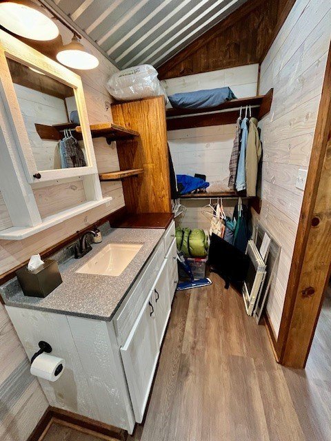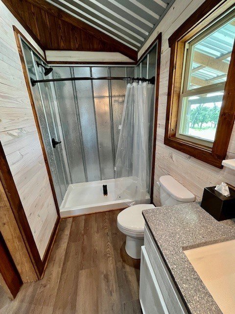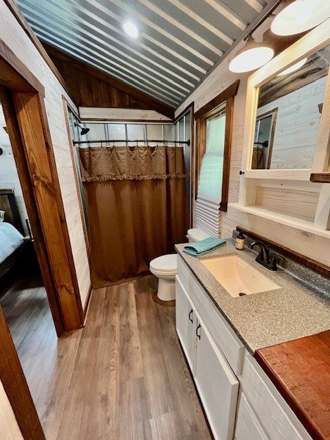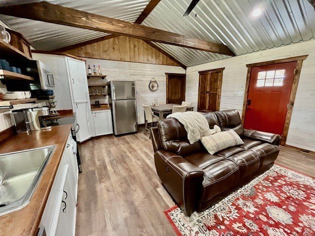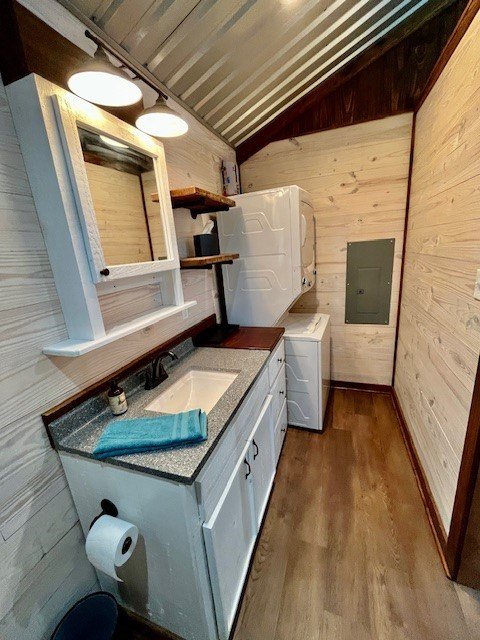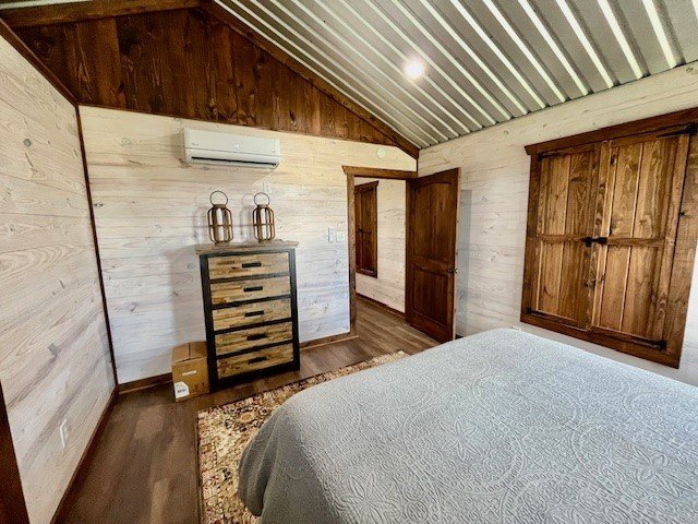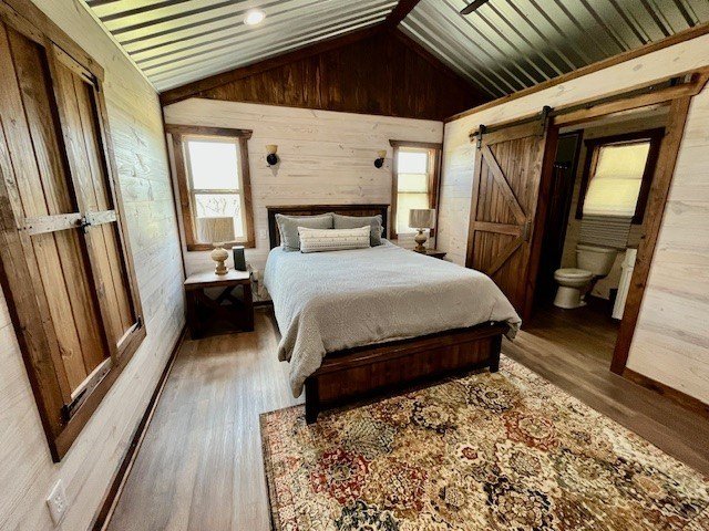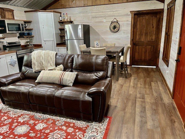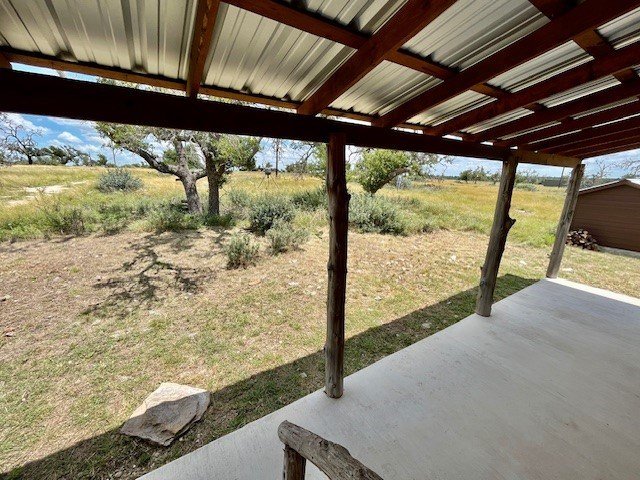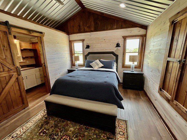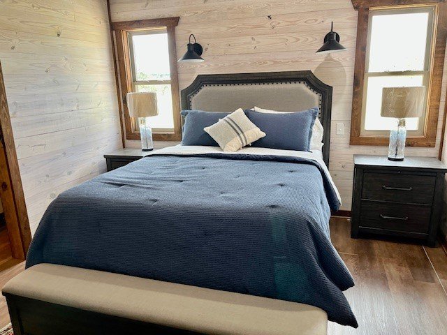 Very nice furnished cabin with kitchen appliances, living room furniture that can be used for STR. Living room has beamed timbers with metal ceiling, vinyl plank flooring, large island, electric fireplace, TV, and other furniture. The bedrooms have a barn door going into the bathroom. Metal ceiling and special wood shutters highlight the house. Shower is constructed of metal. Other bathroom has similar shower, and washer and dryer. Front and back covered porches, well with wellhouse and septic system. Views from back porch with seasonal creek and water hole. This was built to be the guest house or for B&B. Minimum sq ft required in restrictions is 1400 sq ft for main house and 700 sq ft for guest house and B&B's.