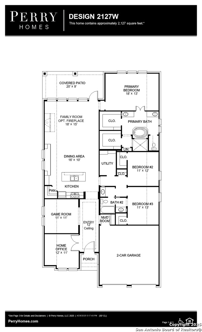 Welcoming entry framed by home office and game room both with French doors. Family room with a wall of windows opens to kitchen and dining area. Island kitchen with built-in seating space, 5-burner gas cooktop and a corner walk-in pantry. Secluded primary suite features three large windows. Primary bathroom offers a French door entry, dual vanities, two walk-in closets, garden tub and a separate glass enclosed shower. Secondary bedrooms offer walk-in closets. A Hollywood bathroom and a utility room completes this design. Covered backyard patio and 5-zone sprinkler system. Mud room just off the two-car garage.