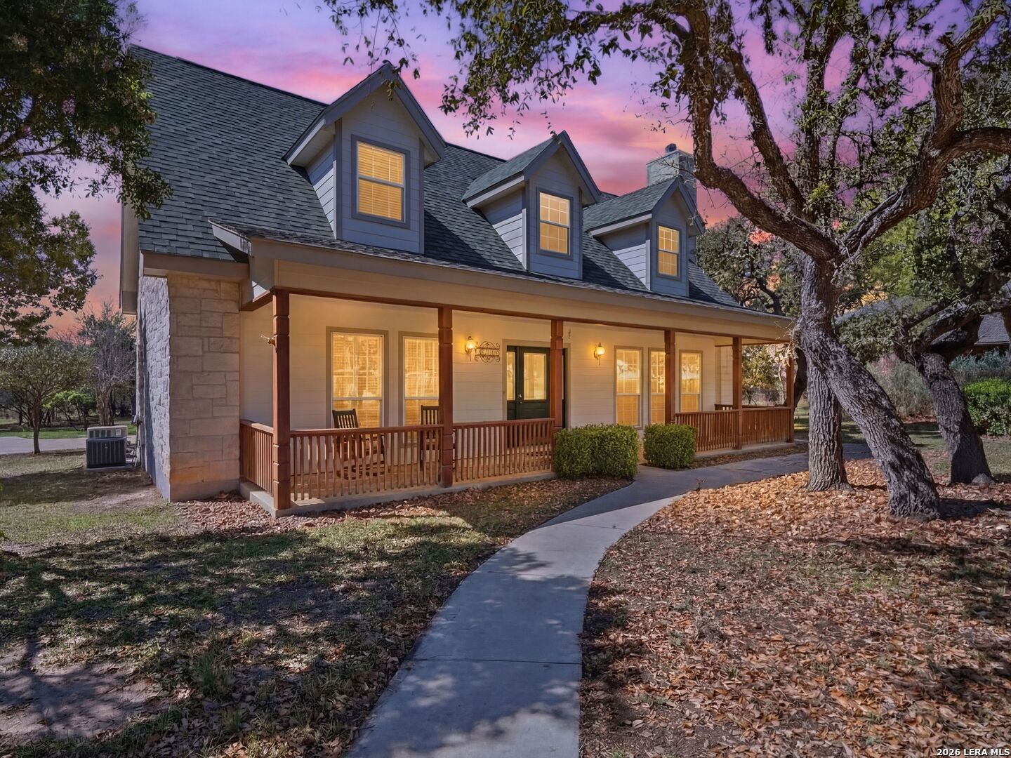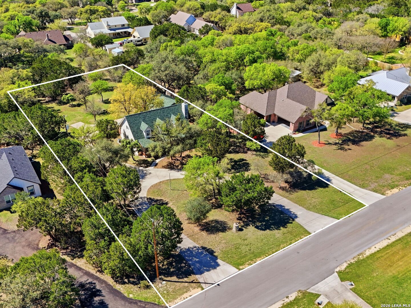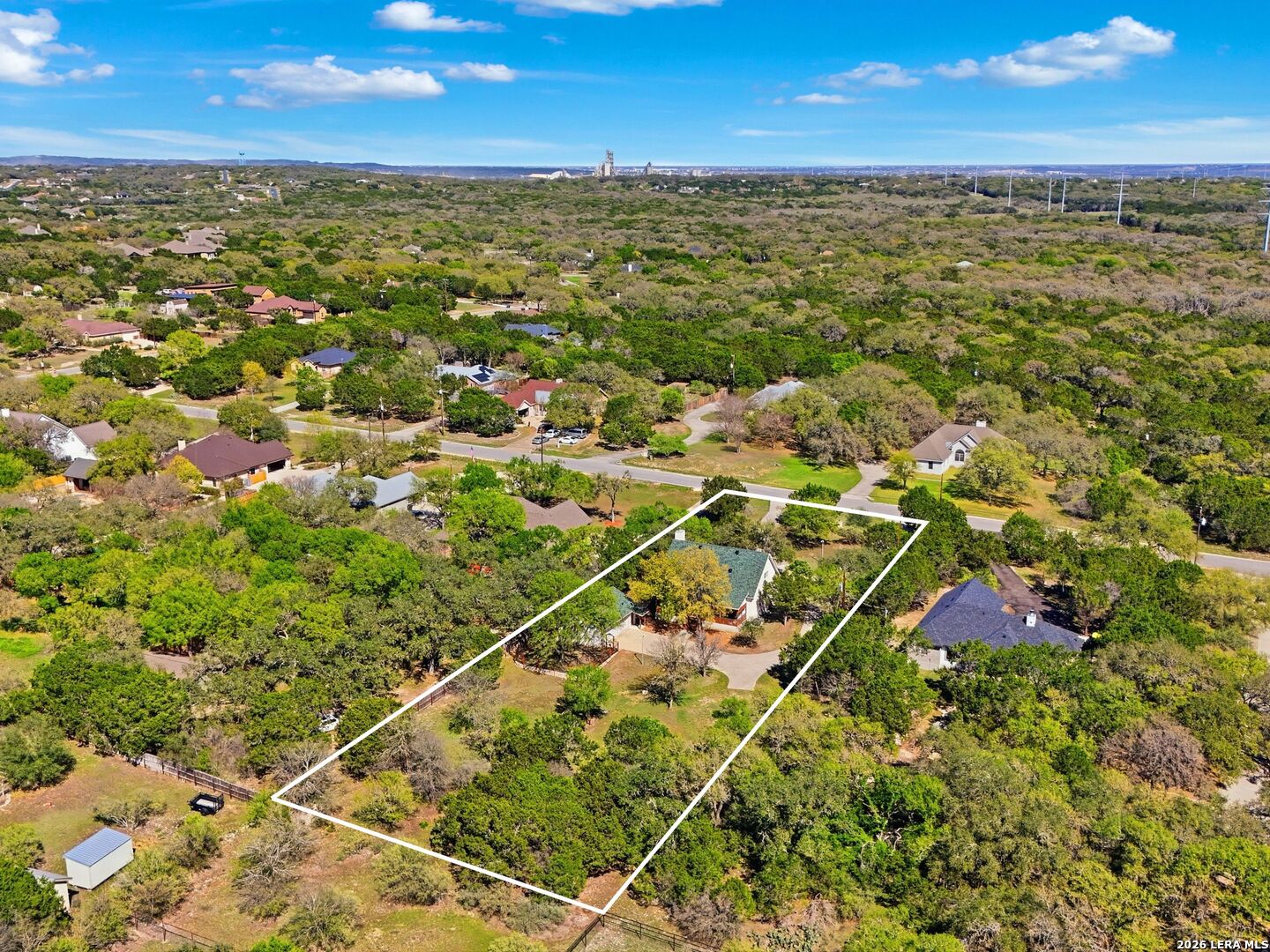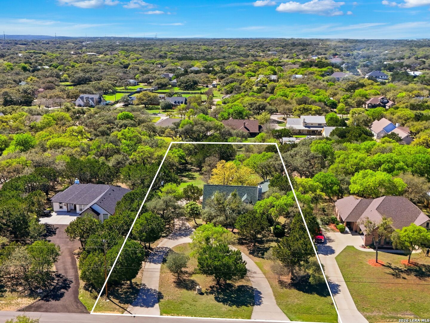 Set on a full acre in The Pinnacle, this well-maintained property offers a rare combination of space, privacy, and flexibility just minutes from New Braunfels. Mature trees frame the home and create a peaceful setting, while a circular driveway and oversized garage add both convenience and curb appeal. Inside, the home features an open and comfortable layout with high ceilings, abundant natural light, and a wood-burning fireplace anchoring the main living area. The kitchen offers generous cabinet and counter space, a breakfast area, and easy flow into both the dining and living spaces. The primary suite is located on the main level with a spacious layout, large walk-in closet, and full bath. Upstairs, two oversized secondary bedrooms and additional flexible space provide options for office, hobbies, or a second living area. The outdoor space is a standout, with a full acre of usable land, mature oaks, and room to expand outdoor living, recreation, or storage. The oversized garage and additional parking provide excellent flexibility. Located in a community with amenities including park/playground, trails, and tennis courts, this property offers a balance of quiet living with convenient access to town.