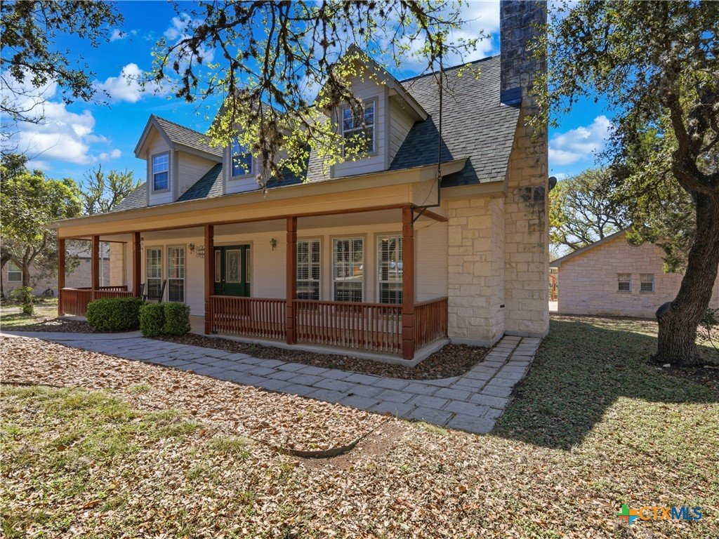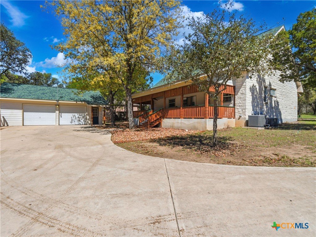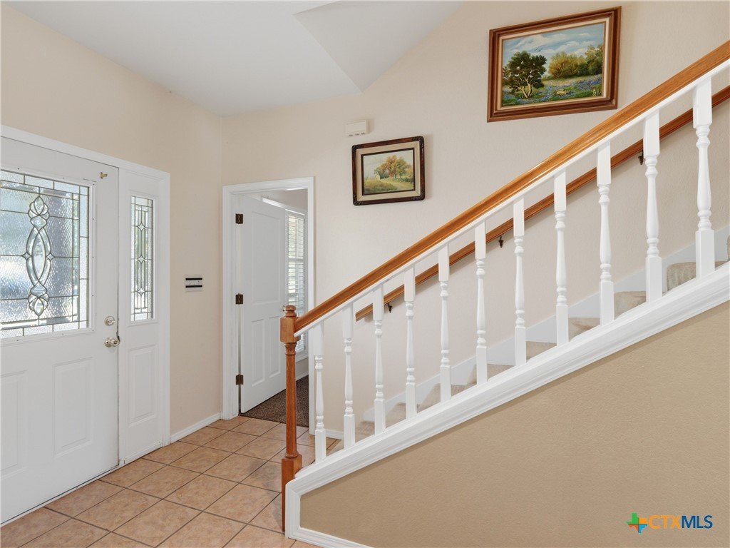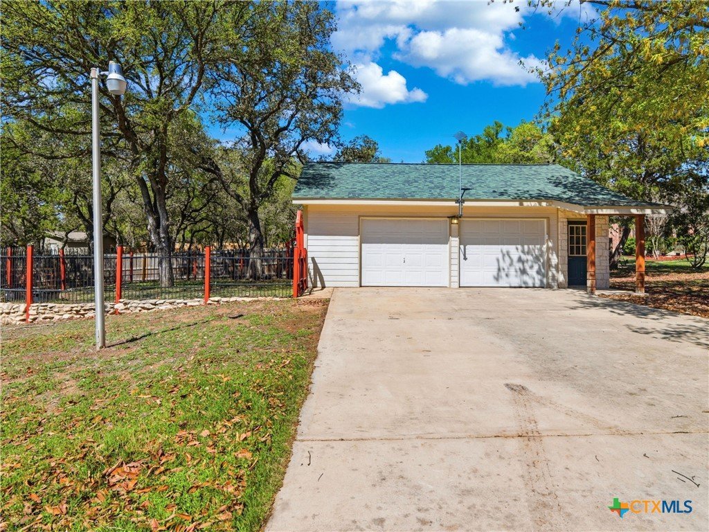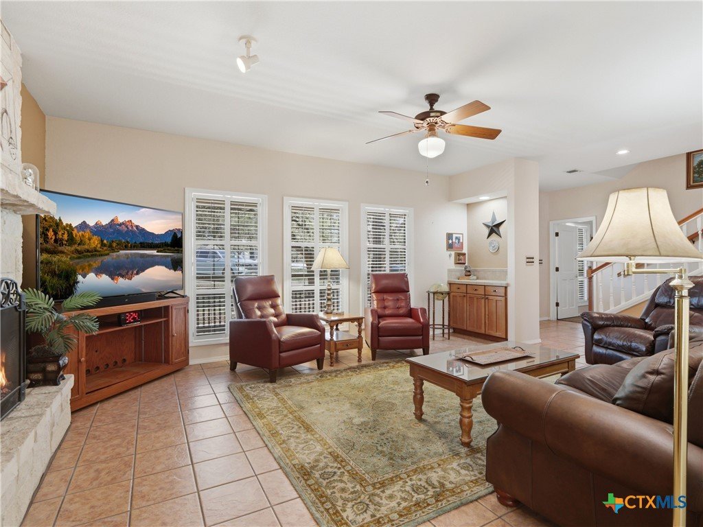 Set on a full acre in The Pinnacle, this well-maintained property offers a rare combination of space, privacy, and flexibility just minutes from New Braunfels. Mature trees frame the home and create a peaceful setting, while a circular driveway and oversized garage add both convenience and curb appeal. Inside, the home features an open and comfortable layout with high ceilings, abundant natural light, and a wood-burning fireplace anchoring the main living area. The kitchen offers generous cabinet and counter space, a breakfast area, and easy flow into both the dining and living spaces. The primary suite is located on the main level with a spacious layout, large walk-in closet, and full bath. Upstairs, two oversized secondary bedrooms and additional flexible space provide options for office, hobbies, or a second living area. The outdoor space is a standout, with a full acre of usable land, mature oaks, and room to expand outdoor living, recreation, or storage. The oversized garage and additional parking provide excellent flexibility. Located in a community with amenities including park/playground, trails, and tennis courts, this property offers a balance of quiet living with convenient access to town.