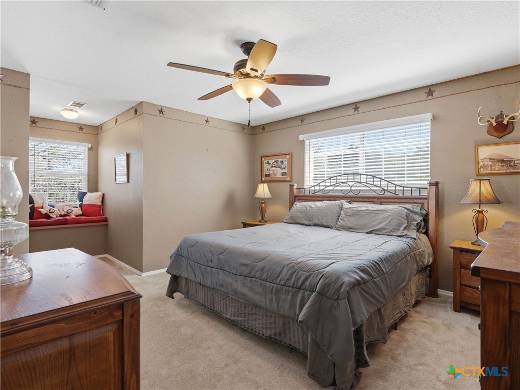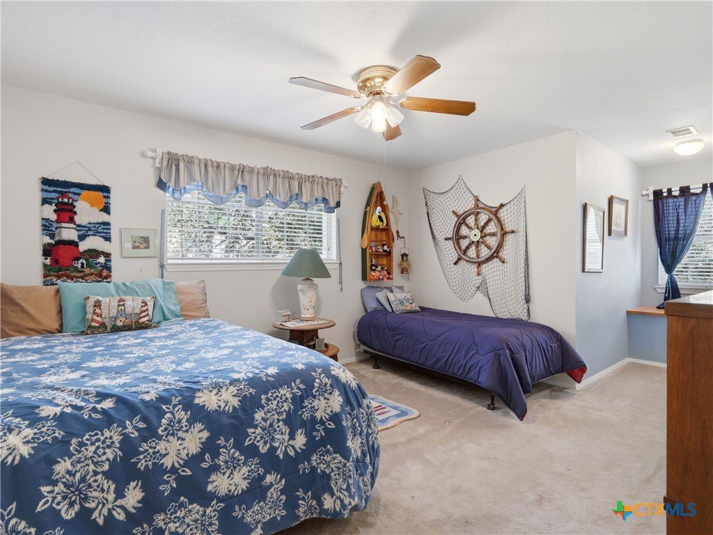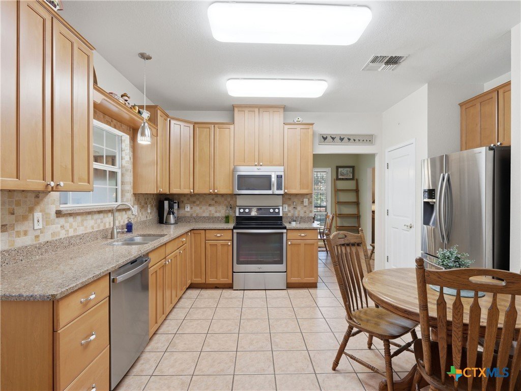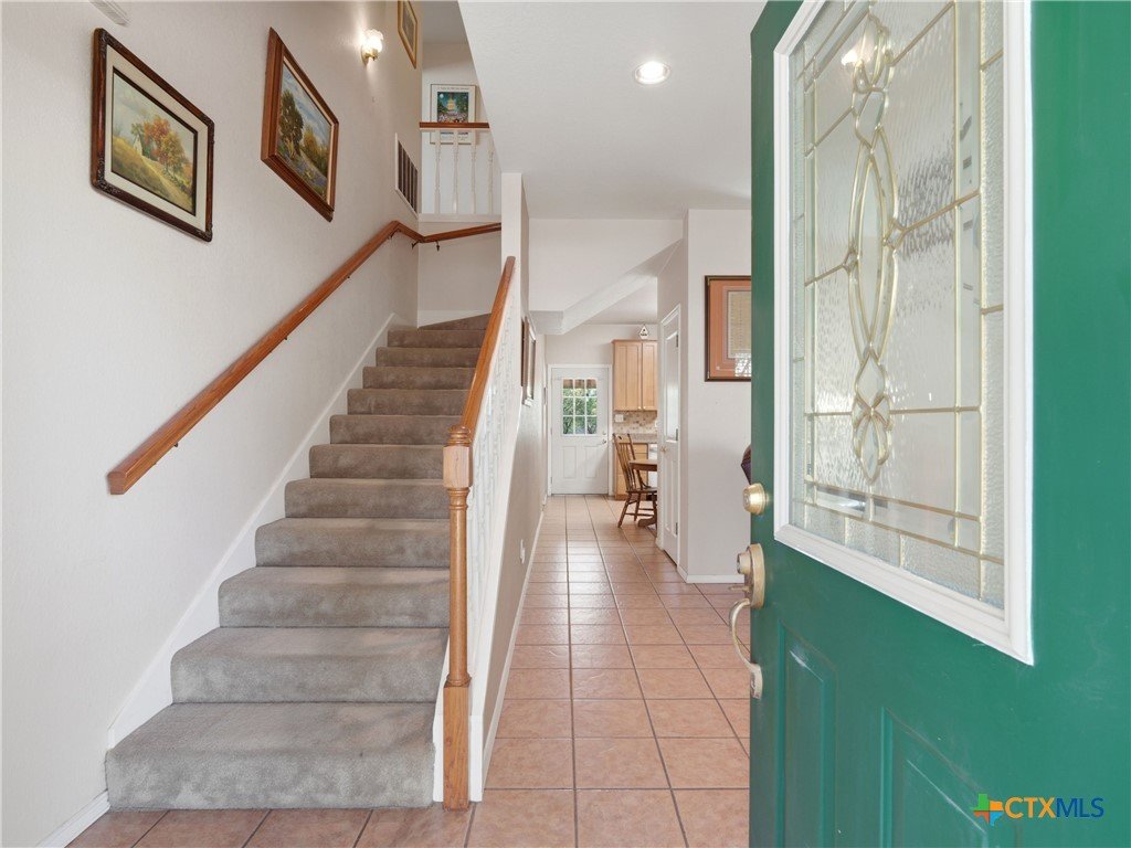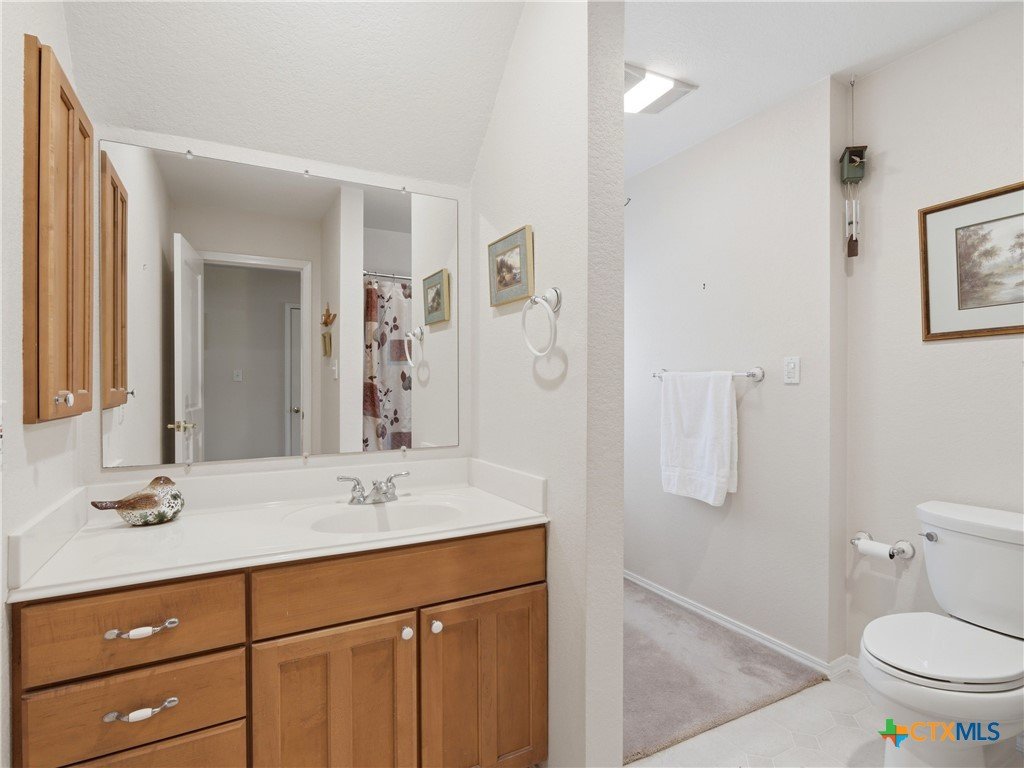 Set on a full acre in The Pinnacle, this well-maintained property offers a rare combination of space, privacy, and flexibility just minutes from New Braunfels. Mature trees frame the home and create a peaceful setting, while a circular driveway and oversized garage add both convenience and curb appeal. Inside, the home features an open and comfortable layout with high ceilings, abundant natural light, and a wood-burning fireplace anchoring the main living area. The kitchen offers generous cabinet and counter space, a breakfast area, and easy flow into both the dining and living spaces. The primary suite is located on the main level with a spacious layout, large walk-in closet, and full bath. Upstairs, two oversized secondary bedrooms and additional flexible space provide options for office, hobbies, or a second living area. The outdoor space is a standout, with a full acre of usable land, mature oaks, and room to expand outdoor living, recreation, or storage. The oversized garage and additional parking provide excellent flexibility. Located in a community with amenities including park/playground, trails, and tennis courts, this property offers a balance of quiet living with convenient access to town.