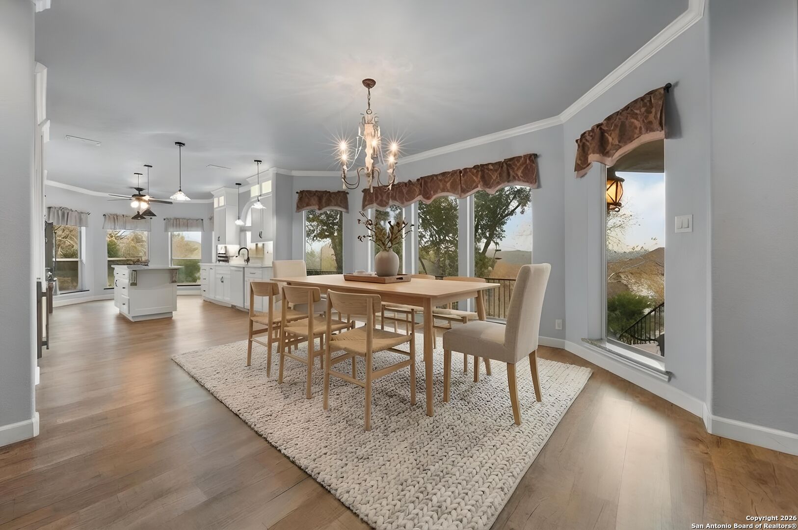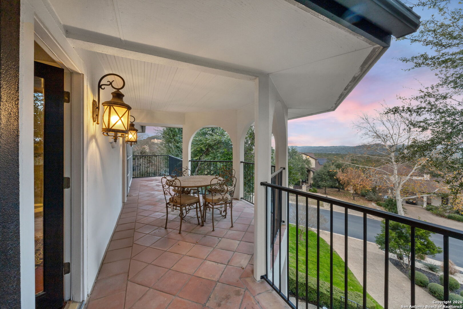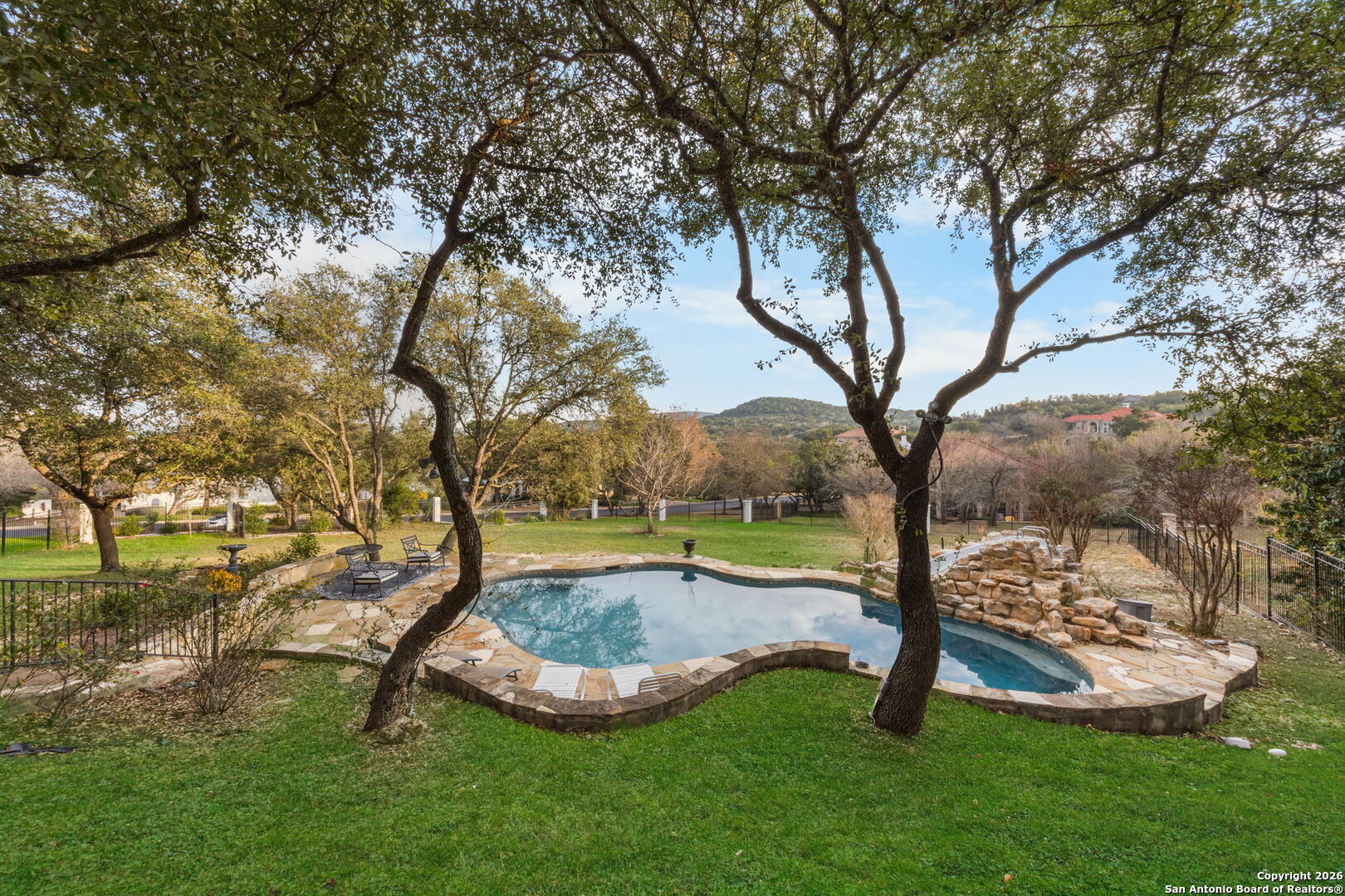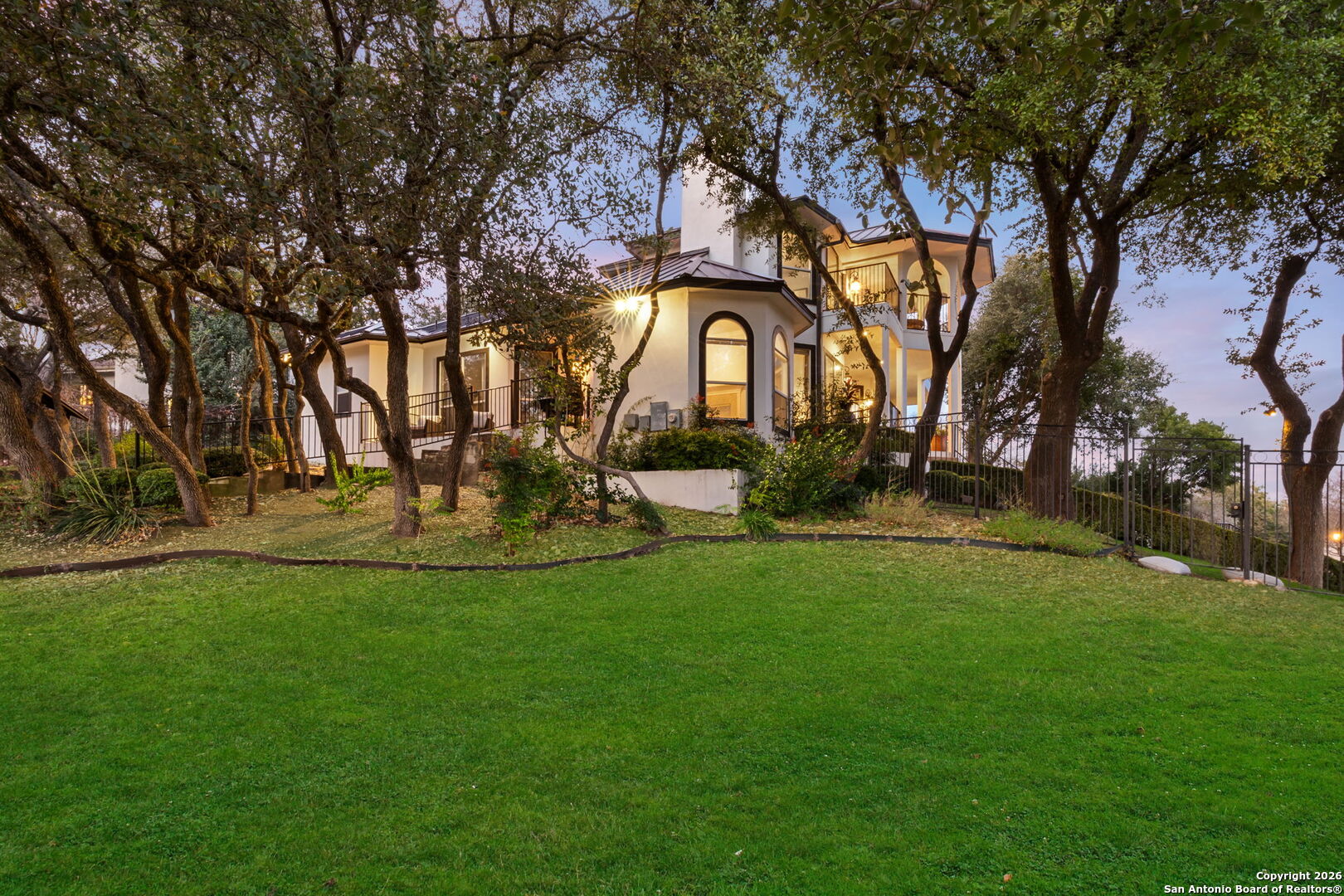 Through the guarded gates of The Dominion, this home immediately stands out for its elevated position, privacy, and unobstructed views. Set high above the surrounding landscape, the scenery stretches for miles and can be enjoyed from nearly every room. A dramatic stairwell entrance and high ceilings throughout create an open, light-filled entry. Recent updates and custom craftsmanship are evident throughout, with natural light carrying seamlessly through the home. The open-concept kitchen connects effortlessly to the main living spaces, making it both functional and ideal for entertaining. In addition to four bedrooms and four-and-a-half baths, the home includes a dedicated office, media room, and game room-offering flexibility for work, hosting, or everyday living. The primary suite is privately elevated, spacious, and designed as a true retreat, featuring separate vanities, a soaking tub, and a walk-in shower. Outside, the nearly one-acre lot provides a rare sense of seclusion. A pool and resort-style outdoor living areas are surrounded by meticulously maintained landscaping, creating a private, peaceful setting. A three-car garage and gated, guarded security complete the experience, all while remaining just minutes from major highways, dining, and retail. This home offers space, privacy, views, and resort-style living within one of San Antonio's most sought-after communities.