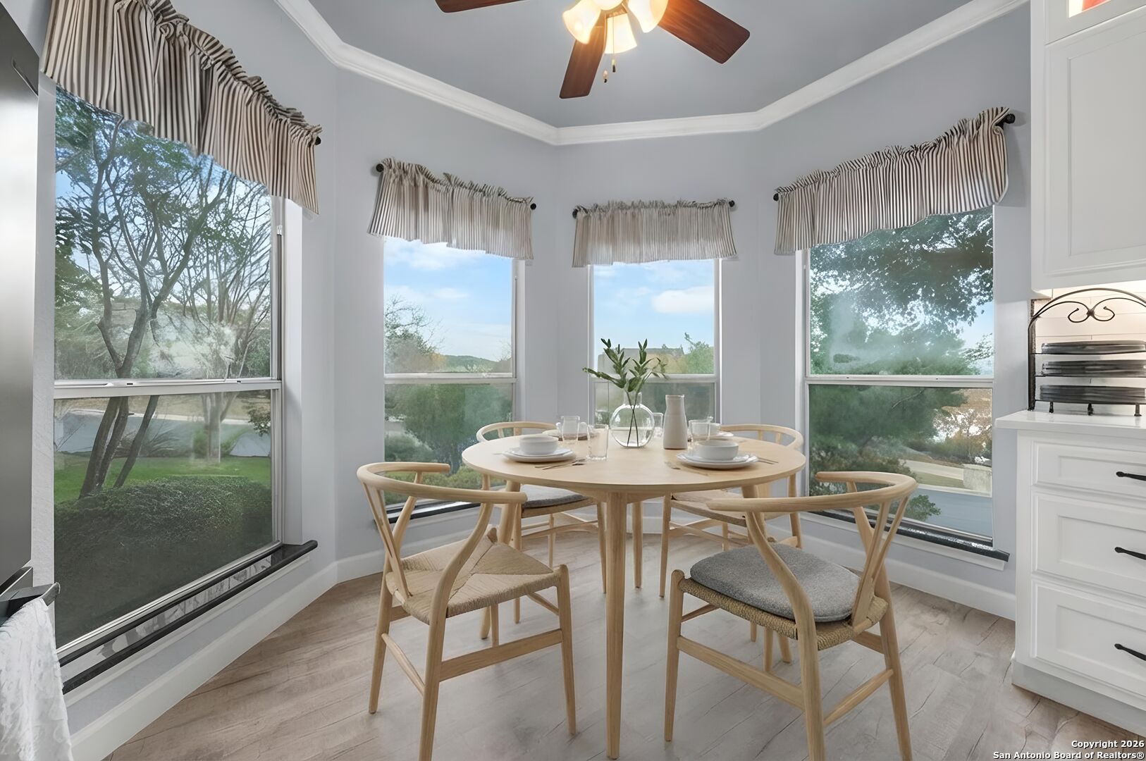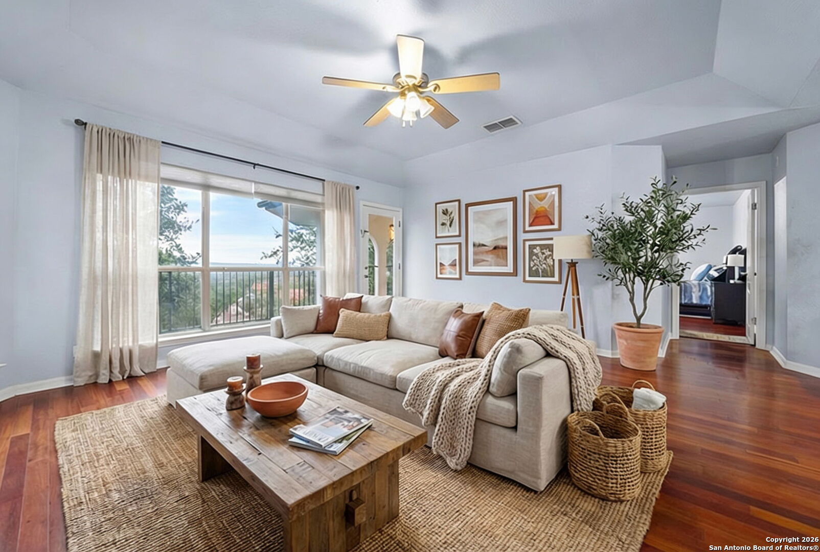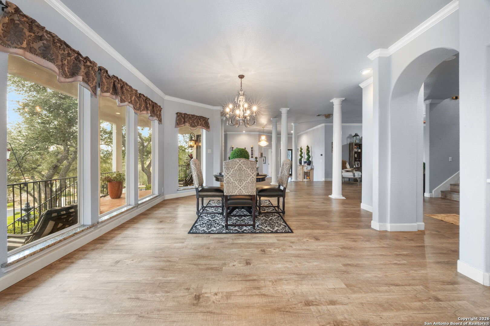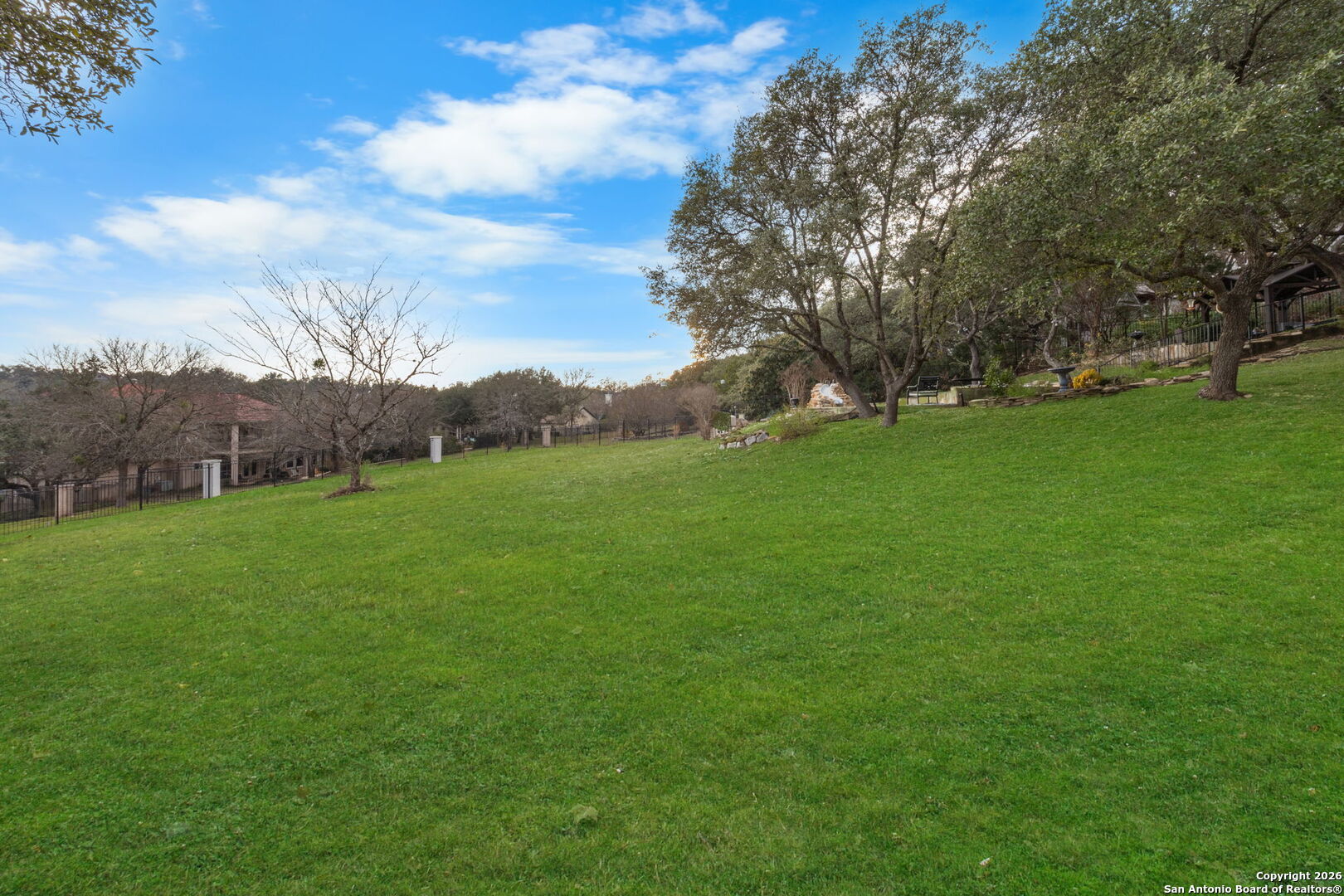 Through the guarded gates of The Dominion, this home immediately stands out for its elevated position, privacy, and unobstructed views. Set high above the surrounding landscape, the scenery stretches for miles and can be enjoyed from nearly every room. A dramatic stairwell entrance and high ceilings throughout create an open, light-filled entry. Recent updates and custom craftsmanship are evident throughout, with natural light carrying seamlessly through the home. The open-concept kitchen connects effortlessly to the main living spaces, making it both functional and ideal for entertaining. In addition to four bedrooms and four-and-a-half baths, the home includes a dedicated office, media room, and game room-offering flexibility for work, hosting, or everyday living. The primary suite is privately elevated, spacious, and designed as a true retreat, featuring separate vanities, a soaking tub, and a walk-in shower. Outside, the nearly one-acre lot provides a rare sense of seclusion. A pool and resort-style outdoor living areas are surrounded by meticulously maintained landscaping, creating a private, peaceful setting. A three-car garage and gated, guarded security complete the experience, all while remaining just minutes from major highways, dining, and retail. This home offers space, privacy, views, and resort-style living within one of San Antonio's most sought-after communities.