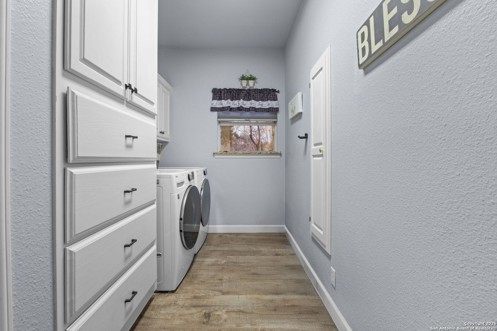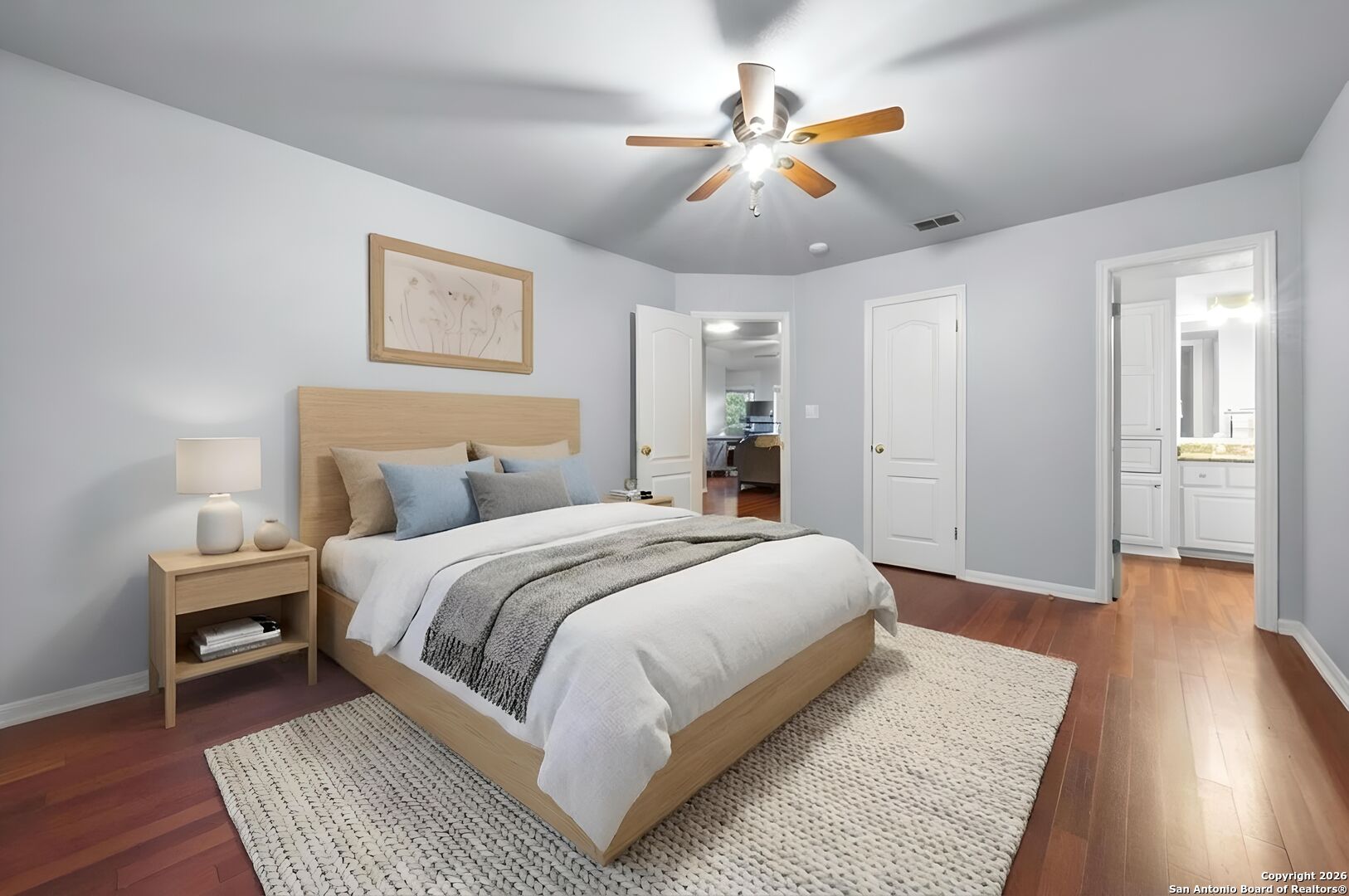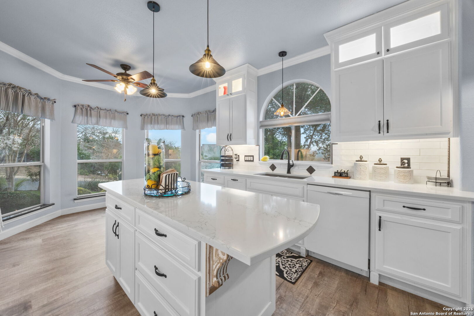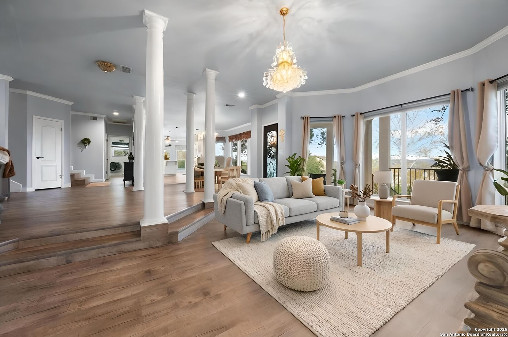 Through the guarded gates of The Dominion, this home immediately stands out for its elevated position, privacy, and unobstructed views. Set high above the surrounding landscape, the scenery stretches for miles and can be enjoyed from nearly every room. A dramatic stairwell entrance and high ceilings throughout create an open, light-filled entry. Recent updates and custom craftsmanship are evident throughout, with natural light carrying seamlessly through the home. The open-concept kitchen connects effortlessly to the main living spaces, making it both functional and ideal for entertaining. In addition to four bedrooms and four-and-a-half baths, the home includes a dedicated office, media room, and game room-offering flexibility for work, hosting, or everyday living. The primary suite is privately elevated, spacious, and designed as a true retreat, featuring separate vanities, a soaking tub, and a walk-in shower. Outside, the nearly one-acre lot provides a rare sense of seclusion. A pool and resort-style outdoor living areas are surrounded by meticulously maintained landscaping, creating a private, peaceful setting. A three-car garage and gated, guarded security complete the experience, all while remaining just minutes from major highways, dining, and retail. This home offers space, privacy, views, and resort-style living within one of San Antonio's most sought-after communities.