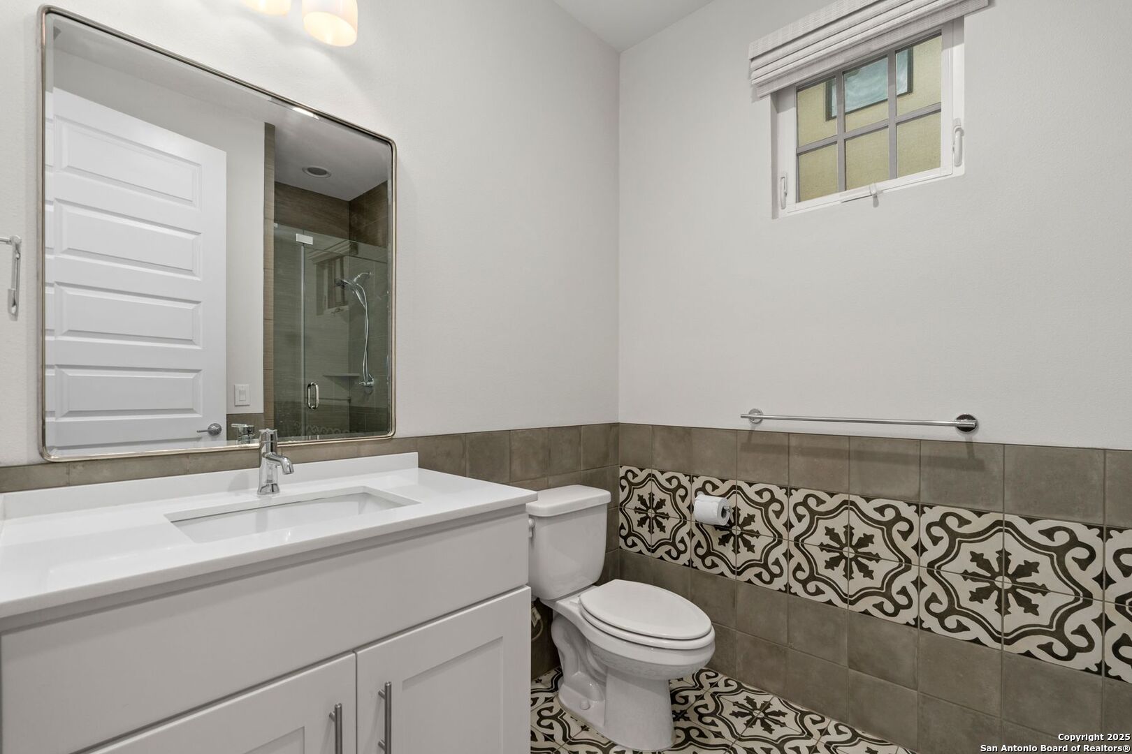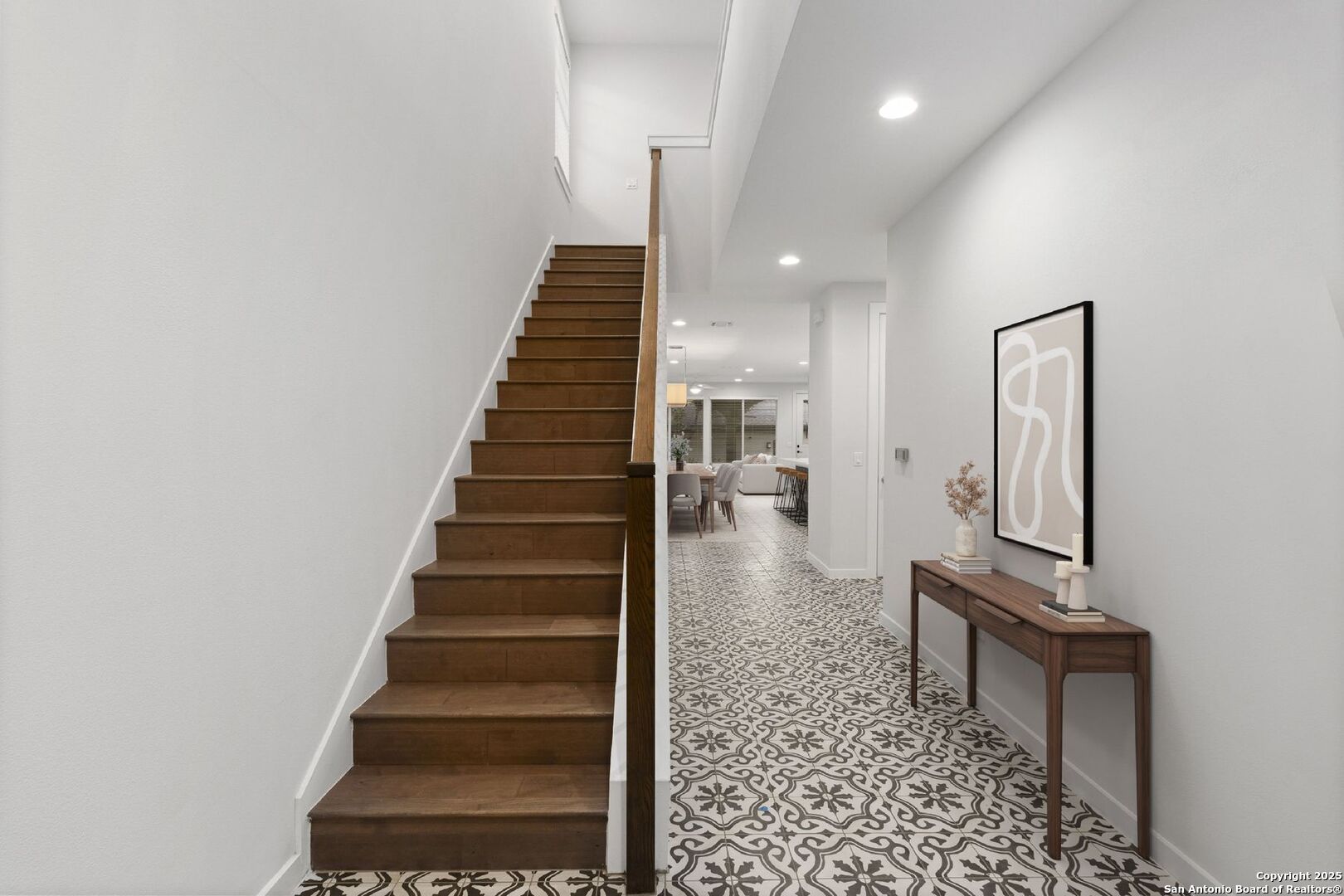 Nestled in the highly sought-after Olmos Park neighborhood, this stylish garden home offers an open-concept layout filled with natural light, soaring ceilings, and designer finishes, creating an inviting space that's both elegant and functional. At the heart of the home, the kitchen impresses with an oversized island, custom cabinetry, stainless steel appliances, white quartzite counters, and a walk-in pantry. Perfect for entertaining, the kitchen flows seamlessly into the dining and living areas. A comfortable secondary bedroom with a full bath is conveniently located on the main level, offering flexibility for guests or a home office. Upstairs, you'll find the spacious primary suite, designed as a private retreat with a spa-like bathroom featuring a double vanity, walk-in shower, and generous walk-in closet. Two additional well-sized bedrooms and another full bathroom provide ample space for family or guests, while the conveniently located utility room adds everyday convenience. The thoughtful layout ensures comfort, privacy, and functionality for all. The low-maintenance backyard is designed for relaxation, featuring a covered patio. A rear-entry garage, accessible from the alley, ensures both convenience and privacy. This property offers the perfect balance of style, comfort, and location, just minutes from restaurants, shopping, and the charm of Olmos Park living.