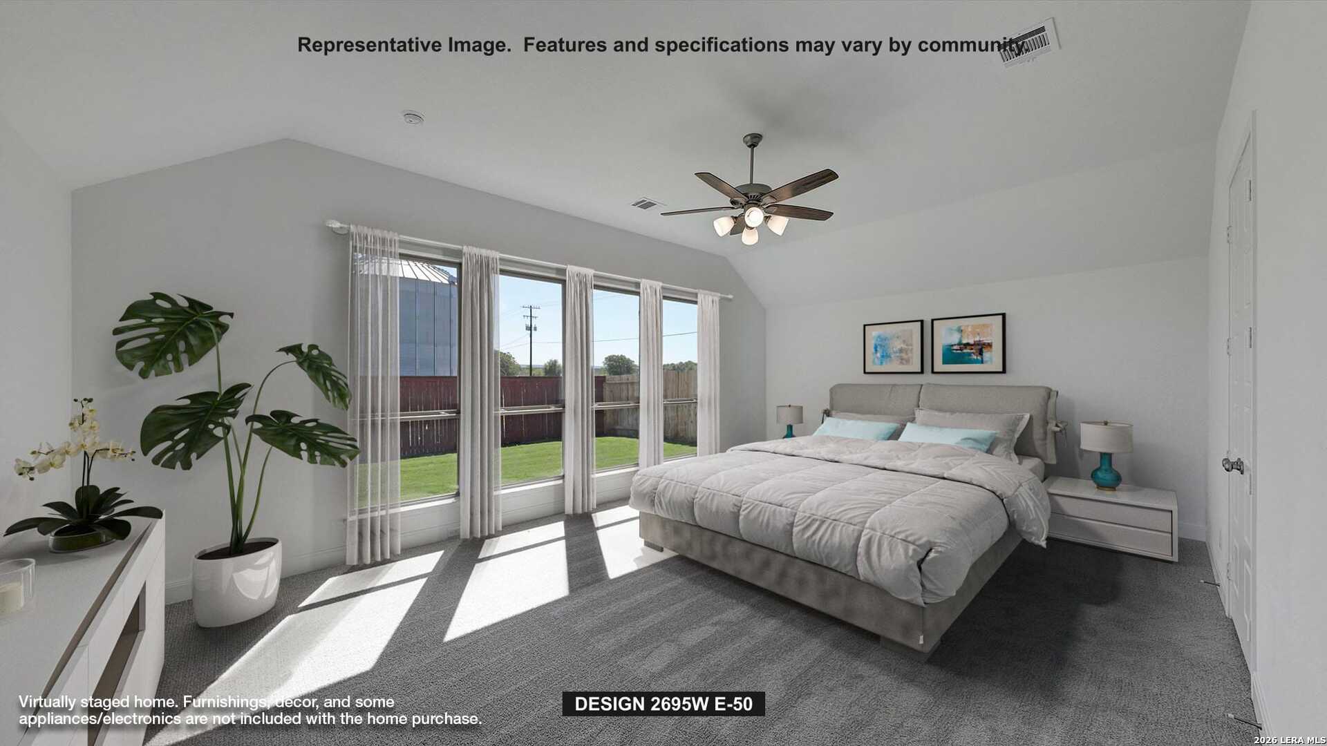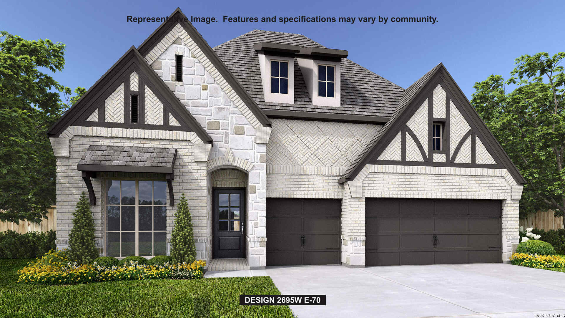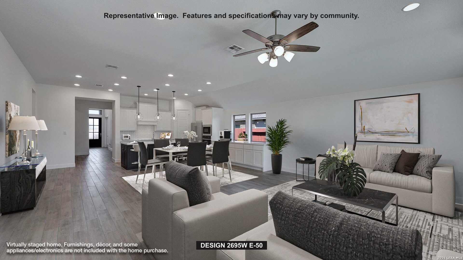 Home office with French doors set at entry with 12-foot ceiling. Extended entry highlights coffered ceiling. Open kitchen features generous counter space, corner walk-in pantry and island with built-in seating space. Dining area flows into open family room with wall of windows. Primary suite includes bedroom with wall of windows. Dual vanities, garden tub, separate glass-enclosed shower and two large walk-in closets in primary bath. A guest suite with private bath adds to this four-bedroom home. Covered backyard patio. Mud room off three-car garage.