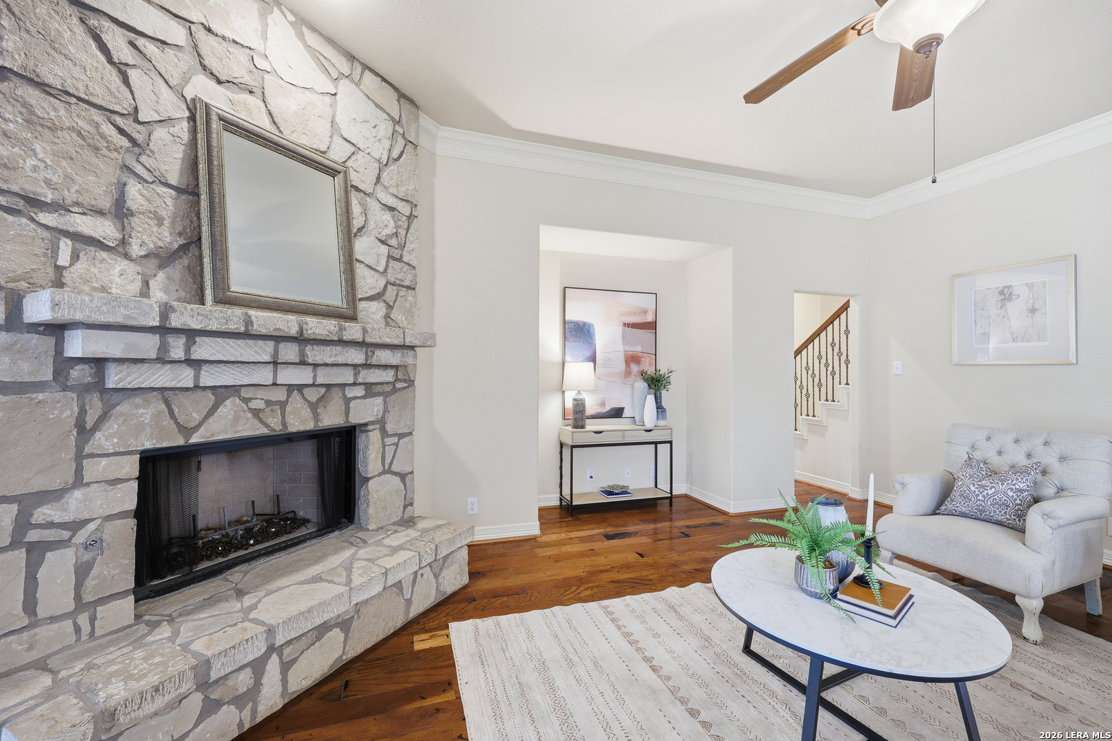 Gorgeous home in sought-after Cibolo Canyons, loaded with upgrades and designed for both comfort and entertaining! Enjoy inviting covered front and back porches, plus a private upstairs balcony perfect for relaxing evenings. The thoughtfully designed floor plan features all bedrooms downstairs, offering convenience and privacy, while the upstairs boasts a spacious game room and dedicated media room-ideal for entertaining or movie nights. The gourmet kitchen is a chef's dream, complete with a large island, stylish pendant lighting, and plenty of space for gathering. The living room showcases a stunning rock fireplace and abundant natural light, creating a warm and welcoming atmosphere. Retreat to spacious bedrooms and enjoy beautiful wood flooring in the main living areas and primary suite. This home truly combines elegance, functionality, and comfort. Come experience everything this exceptional home has to offer!