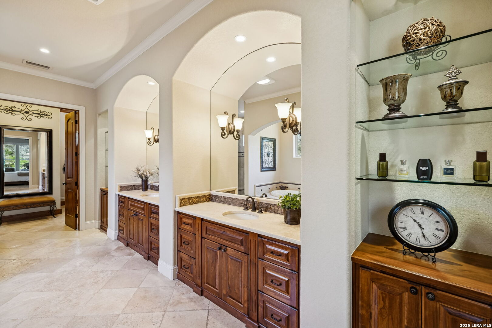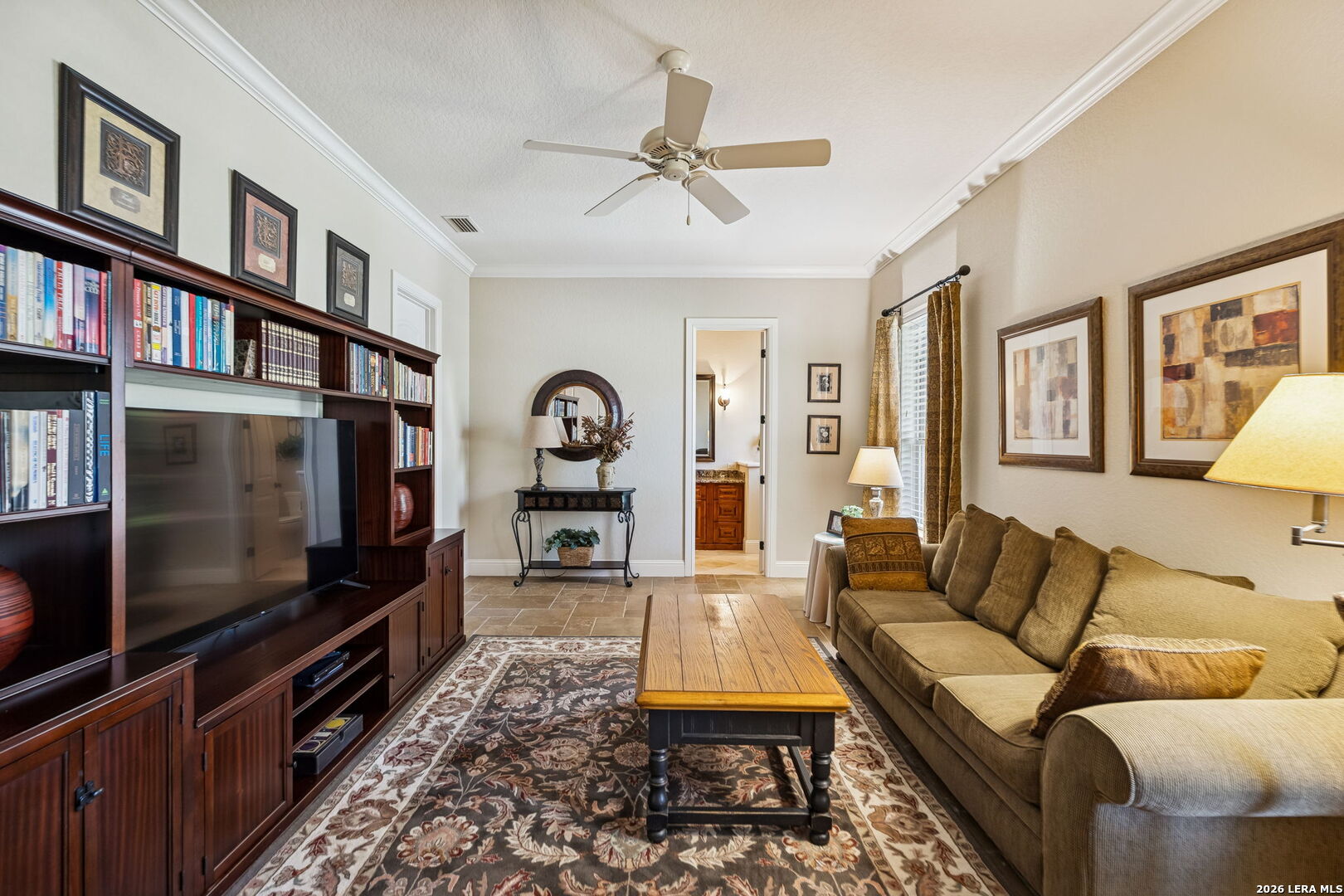 River access. Gated privacy. Hill Country craftsmanship. This Riverforest home blends exceptional construction with one of the area's most desirable lifestyles-private access to the Guadalupe River, scenic walking trails, and neighborhood amenities including a clubhouse and sport courts. And when you're ready for a night out, historic Gruene is less than 10 minutes away, putting live music, dining, and shopping close to home. Outdoor living shines with a covered patio featuring a wood ceiling, recessed lighting, built-in speakers, and electric motorized blinds-a true year-round retreat. The outdoor kitchen offers granite counters and tile backsplash, while a built-in stone gas firepit and professionally landscaped yard with accent lighting create the perfect evening gathering space. Inside, quality craftsmanship carries throughout with travertine floors, hand-troweled walls, crown molding, and custom cabinetry. The living room features a coffered ceiling, stone fireplace, and built-ins, with large doors opening to the patio for seamless indoor-outdoor entertaining. The gourmet kitchen includes granite countertops, a large island, custom cabinetry, a seven-burner gas cooktop, and walk-in pantry. A dedicated study with built-ins offers a great work-from-home space. The primary suite features tray ceilings and a spa-style bath with dual vanities, soaking tub, walk-in shower, and custom closet. Finished with a Spanish tile roof and a three-car garage, this home delivers the relaxed Guadalupe River lifestyle Riverforest is known for.