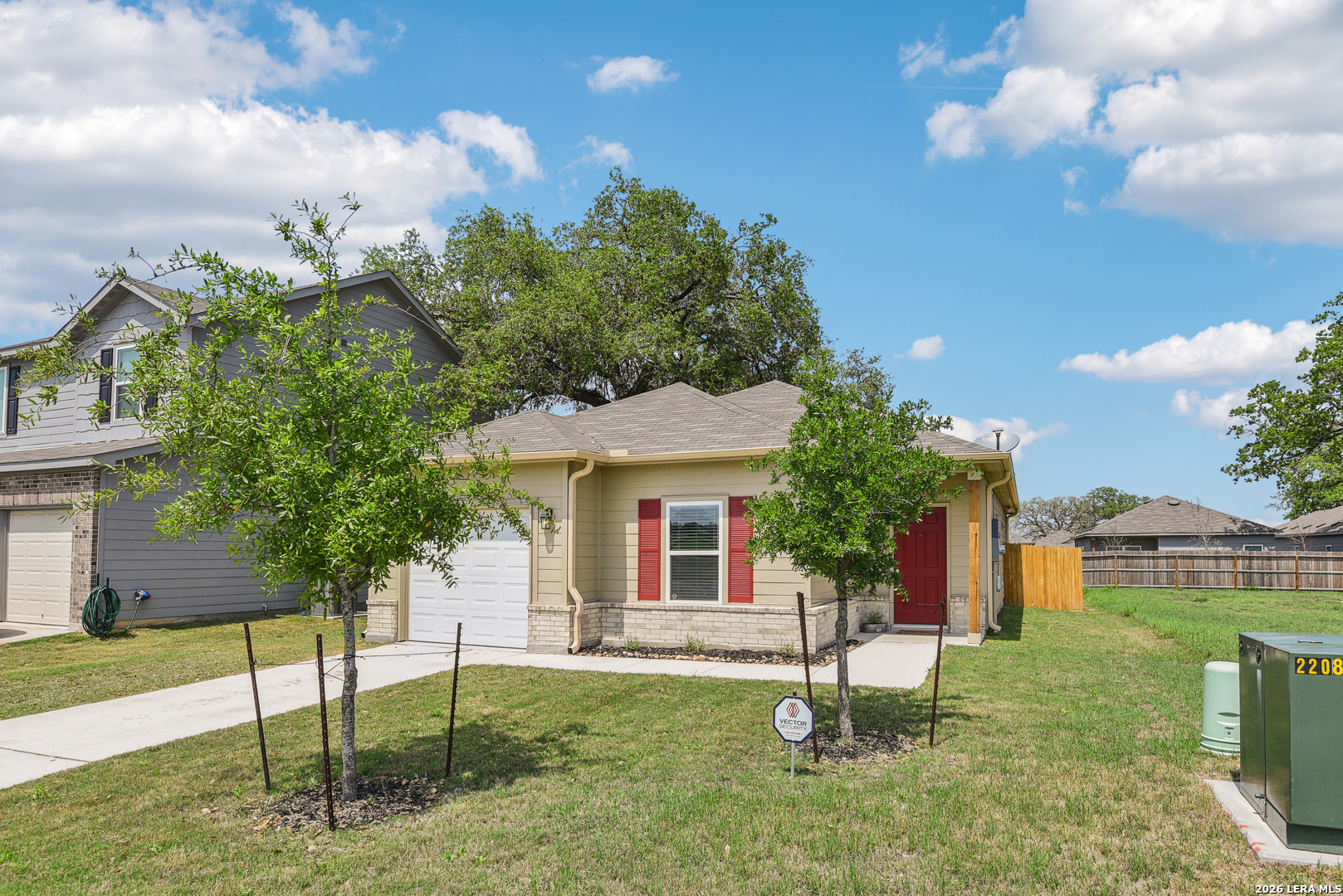 Welcome to this charming house that's certainly a cut above the rest! Nestled in a serene and peaceful neighborhood just beyond the bustling city limits of San Antonio, this "Better than New" home offers a perfect blend of comfort and modernity. Step inside and be enchanted by the open floor plan, boasting 3 cozy bedrooms and 2 well-appointed bathrooms. This home comes packed with upgrades that surpass the standard offerings of new home builders. Revel in the luxury of 9-foot ceilings that exude a sense of spaciousness, elegant granite countertops that elevate the kitchen, and luxurious vinyl plank flooring that graces every room, including the bathrooms and bedrooms. Further enhancing the charm are upgraded fixtures, a generously sized walk-in shower for your indulgence, convenient blinds, an automatic garage door opener for added ease, gutters for practicality, a water softener and filtration system for premium water quality, and a security system complete with security cameras for peace of mind. This single-story abode is strategically situated for your convenience, with quick access to S. Loop 1604 and less than a mile away from IH-37, offering seamless connections to major highways. Not to mention, you'll find it incredibly easy to reach the Toyota Manufacturing plant, making commuting a breeze. Surrounded by a wealth of amenities, this home is a haven of tranquility. Enjoy being in proximity to Southside High School, Toyota Motor Manufacturing, Texas, Inc., and the picturesque Victor Braunig Lake, each offering a unique experience just a stone's throw away. Don't miss this opportunity to make this delightful house your new home sweet home. Say goodbye to the ordinary and embrace the extraordinary with this meticulously crafted dwelling. Visit soon and let this home work its magic on you!