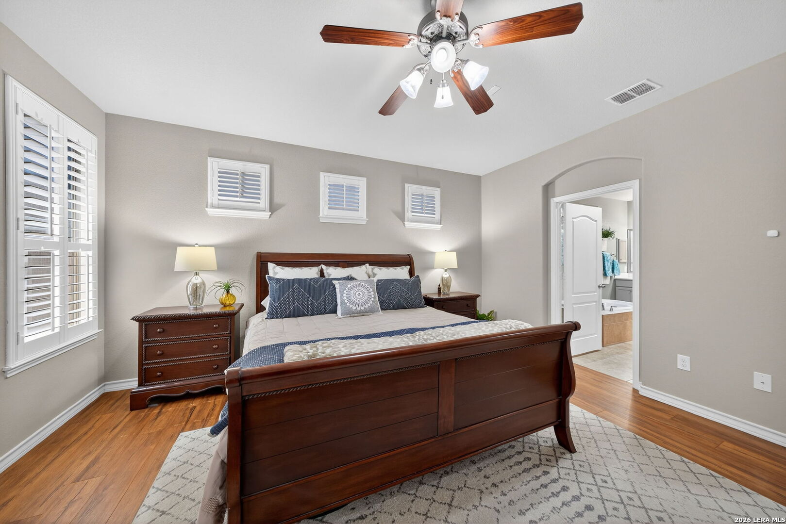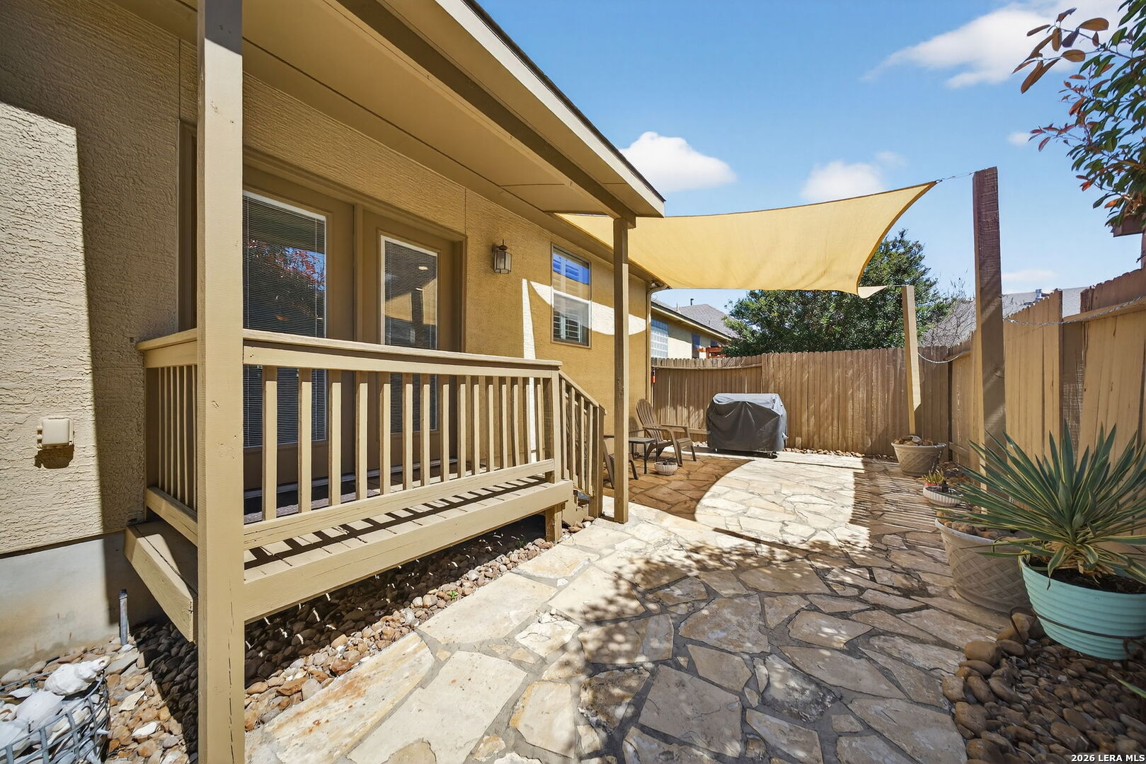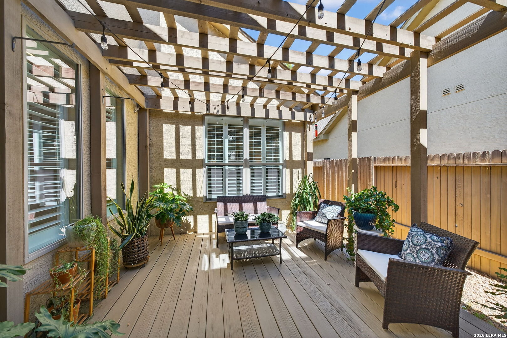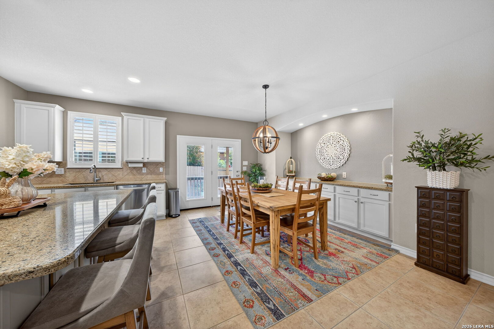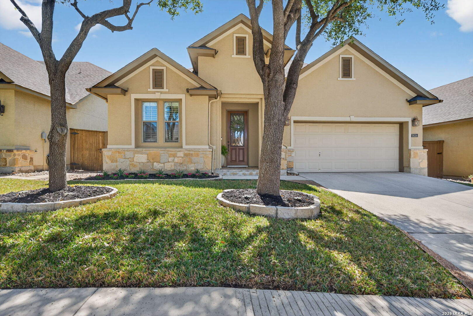 Rare Find! ONE STORY home exceptionally well cared for and totally "Move In Ready." Super low maintenance- perfect for the "Lock & Leave" homeowner. Well maintained, quiet and secure gated community. 3 Bedrooms, 3 Full Baths, 2 Car Garage. 2,110 Sq. Ft. Open Floor Plan loaded with natural light. Oversized Living Room overlooking island Kitchen with granite counters, stainless steel appliances, double ovens and gas cooking. Elegant built-in buffet in 16' x 11' Breakfast Area. Master Suite includes walk-in shower, whirlpool garden tub & spacious walk-in closet. Tile Floors in most areas with wood grain texture laminate flooring in Bedrooms. No carpet. Plantation Shutters. Enjoy the classy exterior arbor covered sitting space just off the Living Room. HOA dues include front yard lawn service & sprinkler system maintenance. Quick and easy access to Loop 1604, HEB, restaurants & shopping. Added safety with Fire Station and Urgent Care nearby. You need to check this one out!