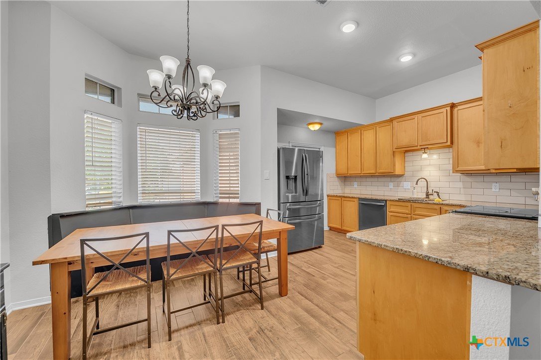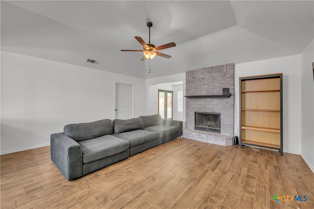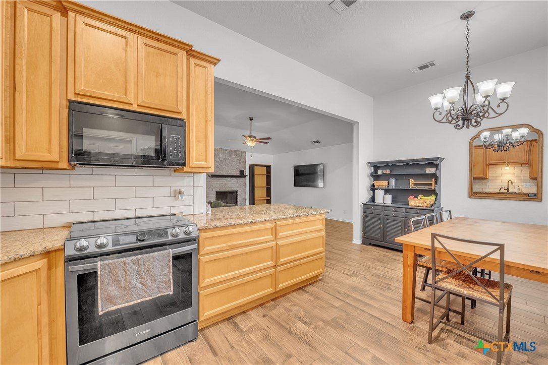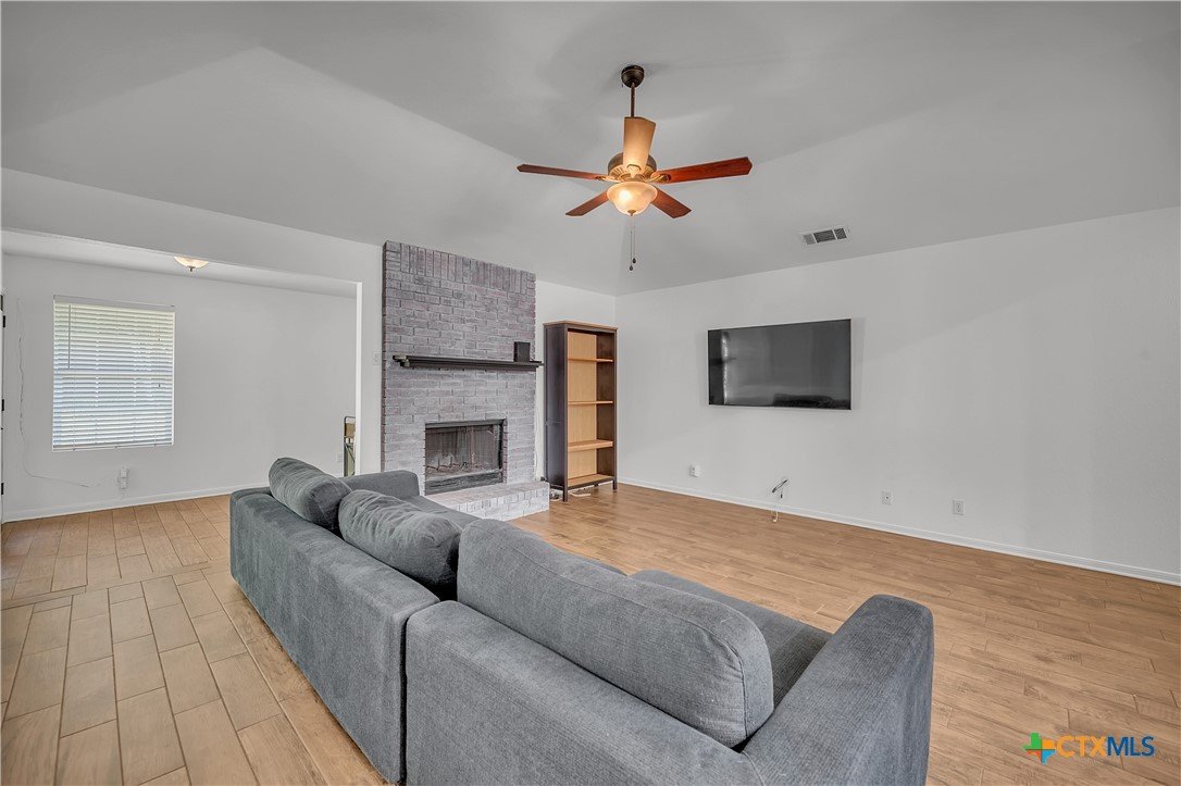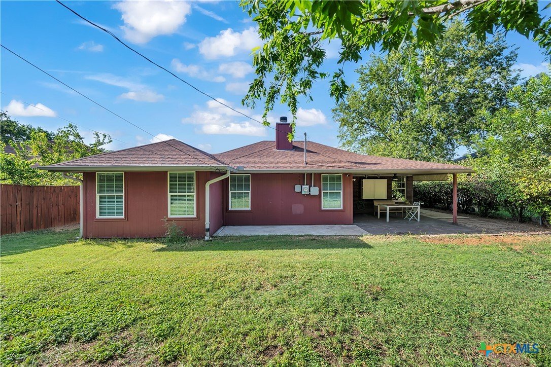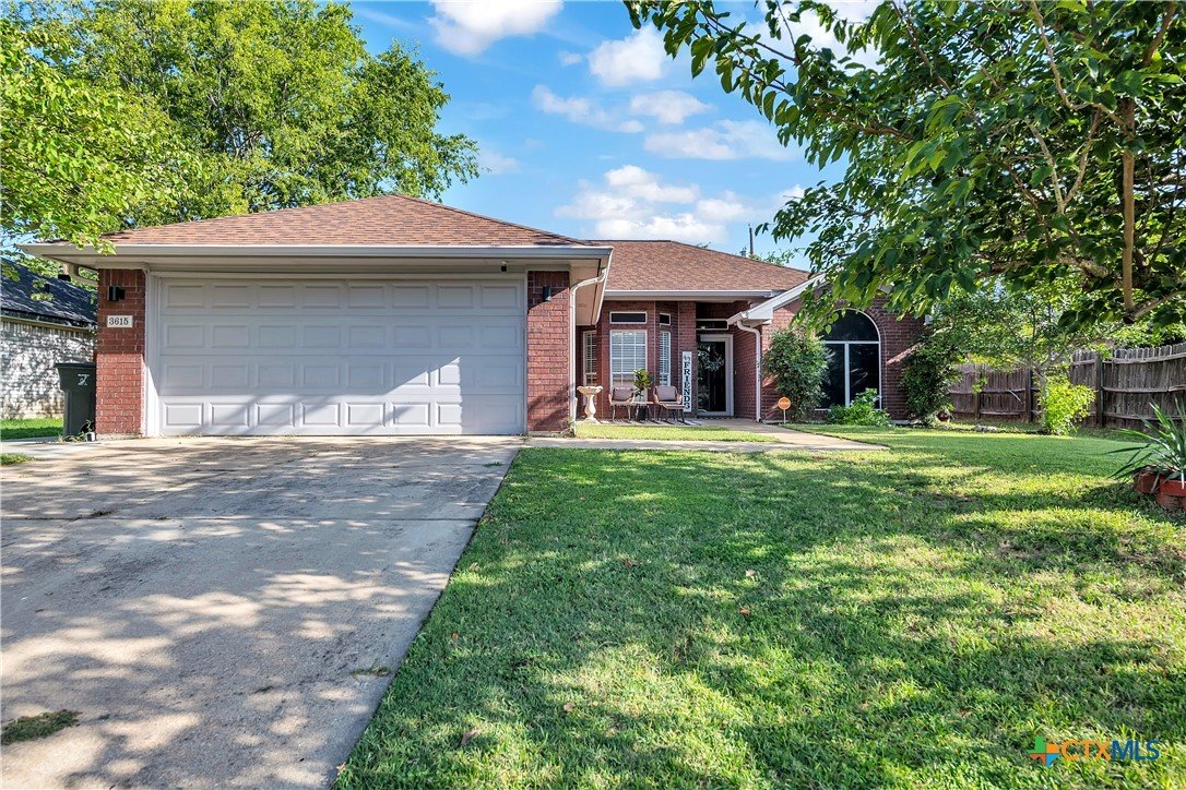 This beautifully maintained 4-bedroom, 2-bathroom single-story brick home with a spacious and functional layout, featuring warm wood-look tile flooring, vaulted ceilings, and a cozy wood-burning fireplace in the living room. The kitchen boasts granite countertops, stainless steel appliances, subway tile backsplash, and a charming built-in breakfast nook. The private primary suite includes a large walk-in shower, dual vanity with marble countertops, and a sliding barn door for added character. Two guest bedrooms offer plush carpeting, ceiling fans, and ample closet space, while a dedicated office or flex room provides space for work or play. A stylish second bath with updated fixtures and tiled surround serves guests and secondary bedrooms. Step outside to a fully fenced backyard with mature trees, a spacious covered patio with ceiling fan, and plenty of room for outdoor entertaining or future expansion. Additional highlights include modern lighting throughout, an attached two-car garage, smart Vivint security system, and a no-HOA neighborhood conveniently located near parks, schools, shopping, and major commuter routes. Move-in ready and full of charm, this home offers unbeatable value and versatility for today's buyers