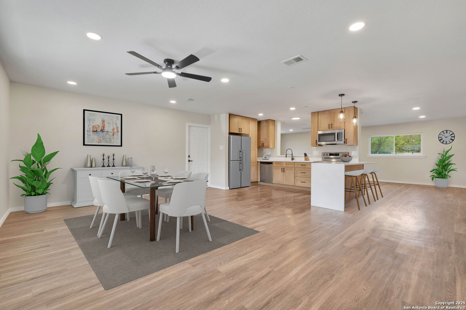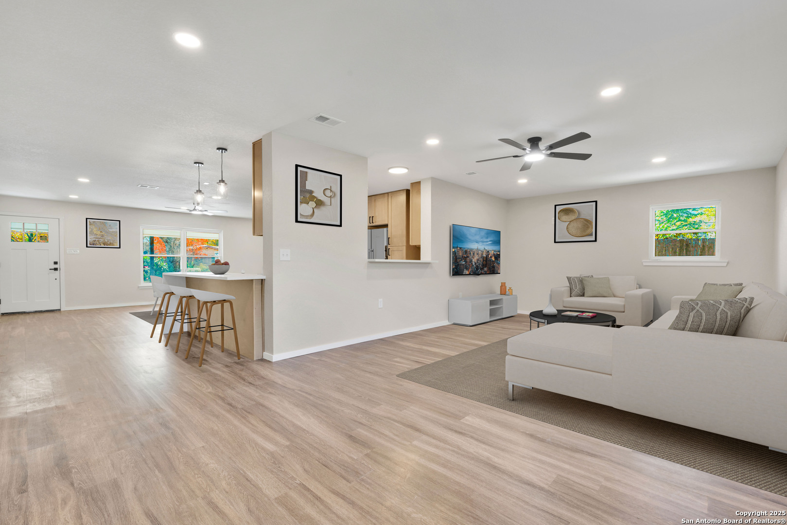 Charming 4-bedroom, 2-bath home offering approximately 1,990 sq. ft. of living space. This well-maintained property features two spacious living areas and a one-car garage. Recent updates include completed foundation repairs, new flooring throughout, and a fully renovated kitchen. Enjoy outdoor living on the deck patio perfect for entertaining along with a large backyard ideal for gatherings or recreation. Conveniently located just minutes from Fort Sam Houston, The Pearl, and Downtown San Antonio.