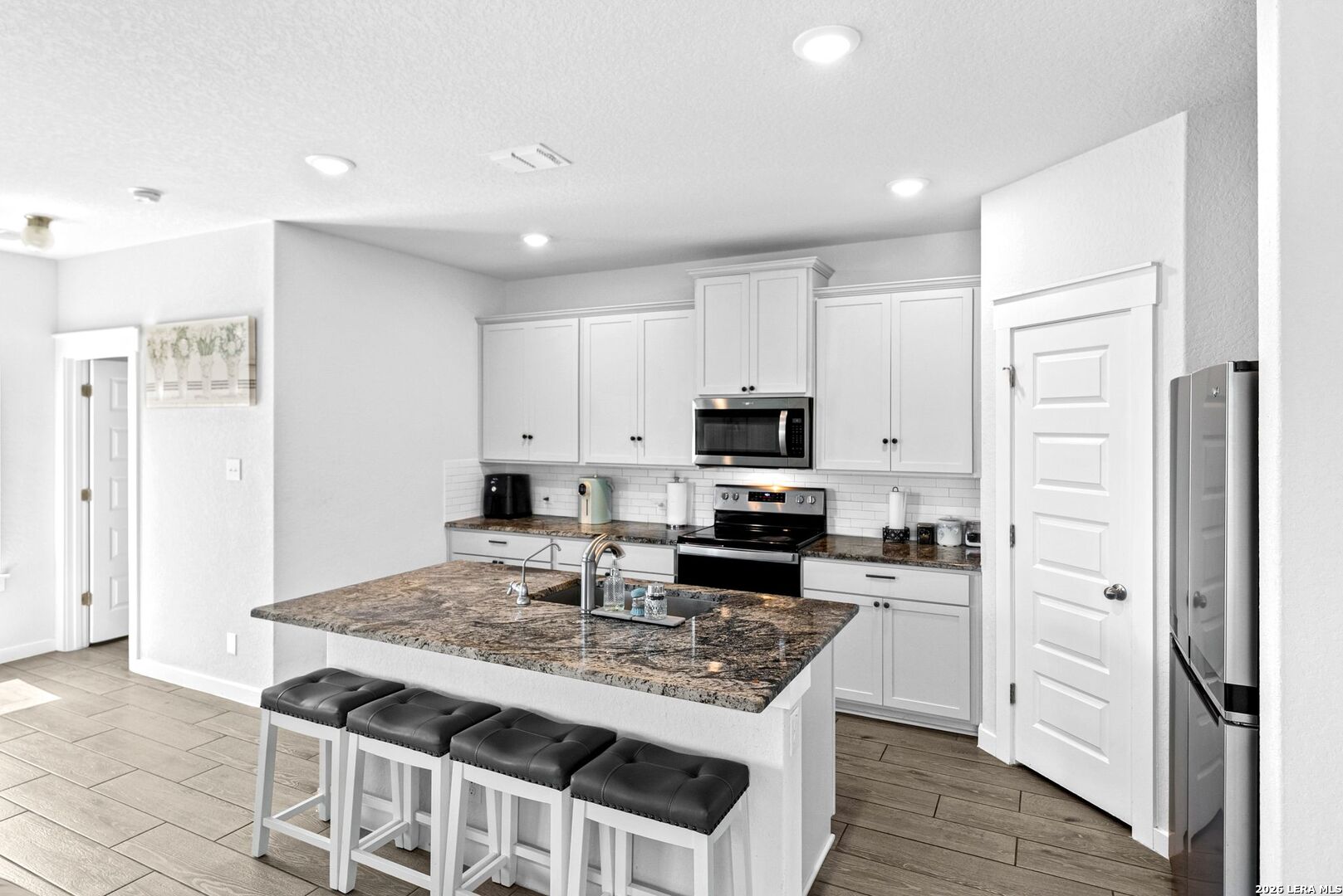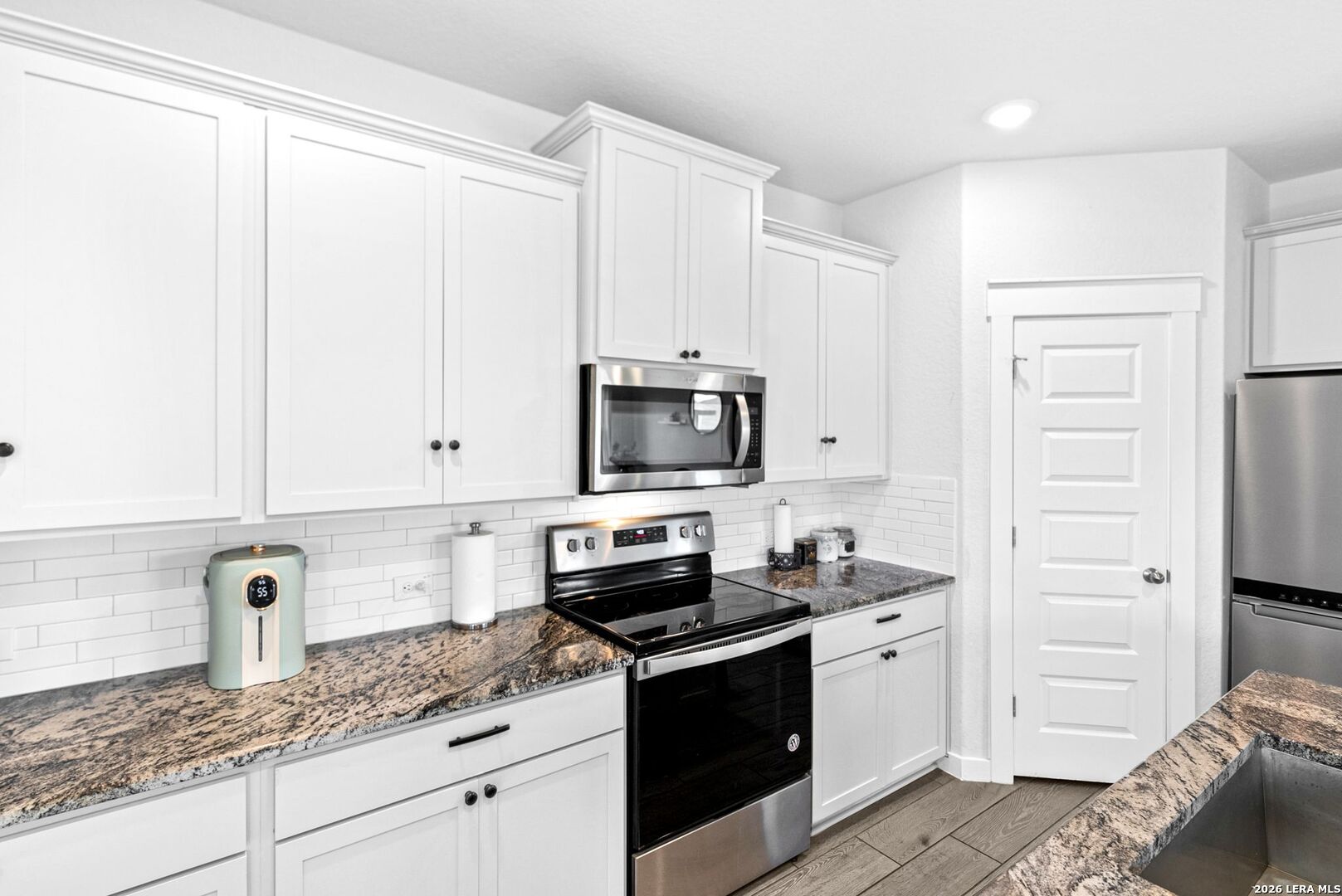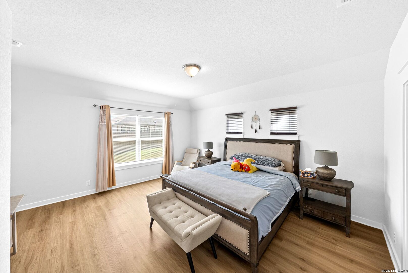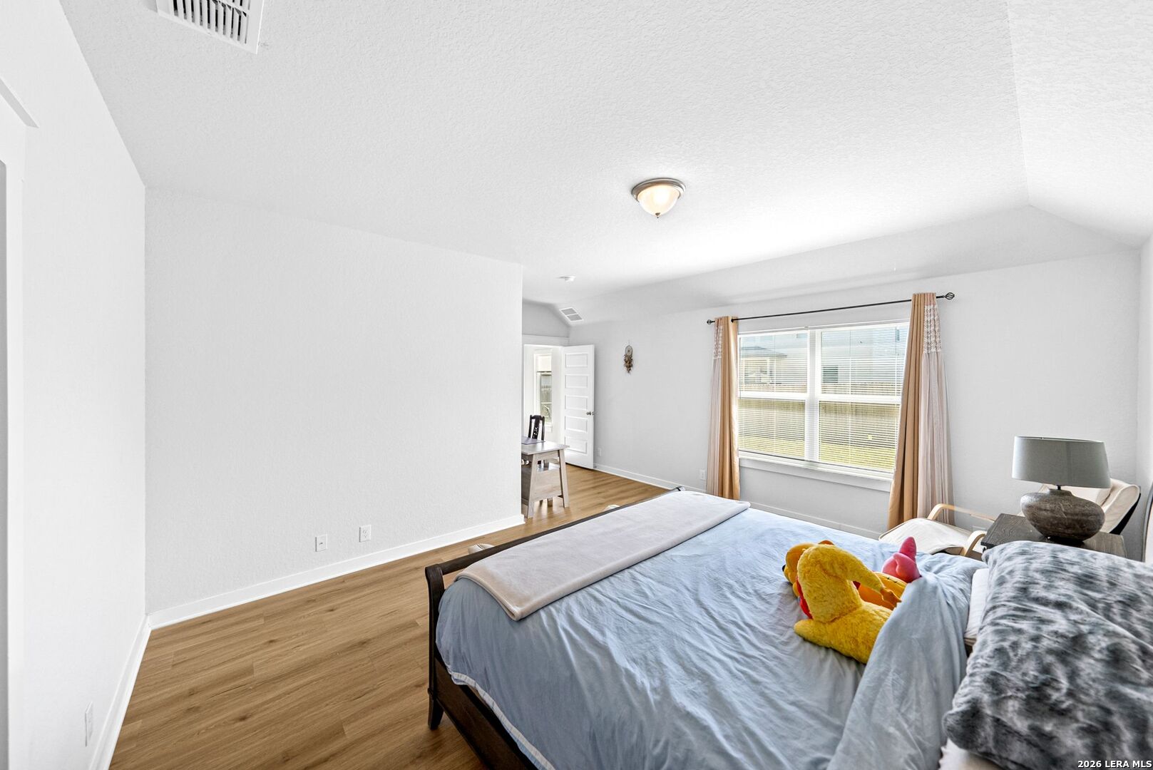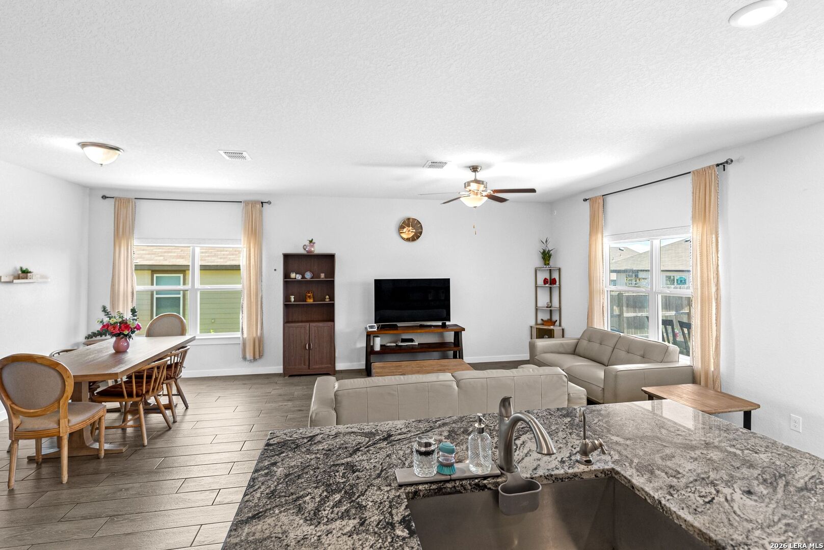 Step into a home that gives you space to live fully, gather comfortably, and enjoy the rhythm of everyday life. This thoughtfully designed two story home offers five bedrooms, three full bathrooms, a dedicated office, and a spacious loft, creating the kind of flexibility that fits real life without compromise. From the moment you enter, the upgraded flooring carries you through an open and inviting layout that feels both bright and grounded. The kitchen is the centerpiece of the home, designed for connection as much as function. White shaker style cabinets, stainless steel appliances, and sleek omegastone countertops create a clean and modern look, while the large island becomes a natural gathering place. It is easy to picture mornings starting here with coffee and quiet conversation, or evenings filled with laughter as meals are shared and stories are told. Having both the primary suite and a secondary bedroom on the main floor offers a level of convenience that stands out. Whether it is for guests, extended family, or simply the ease of having a bedroom close by, the layout adapts to your needs. The primary suite provides a peaceful retreat, with a spacious bathroom featuring a walk in shower, and a large closet that makes daily routines feel organized and effortless. The office creates a dedicated space for productivity, whether working from home, managing schedules, or focusing on personal projects. Upstairs, the loft becomes a natural extension of the living space. It can transform into a movie room, game area, or a place where everyone can unwind at the end of the day without feeling crowded. Step outside to the extended covered patio where the pace of the day slows down. It is the perfect setting for weekend barbecues, evening conversations, or simply enjoying fresh air as the sun sets. The backyard is supported by full sod and an irrigation system, making it easy to maintain a clean and inviting outdoor space year round. This home brings together space, comfort, and thoughtful design in a way that makes daily living feel smooth and enjoyable. It is more than just square footage. It is a place where routines feel easier, gatherings feel natural, and home truly feels like home.