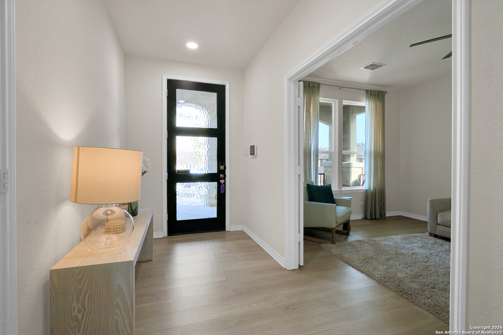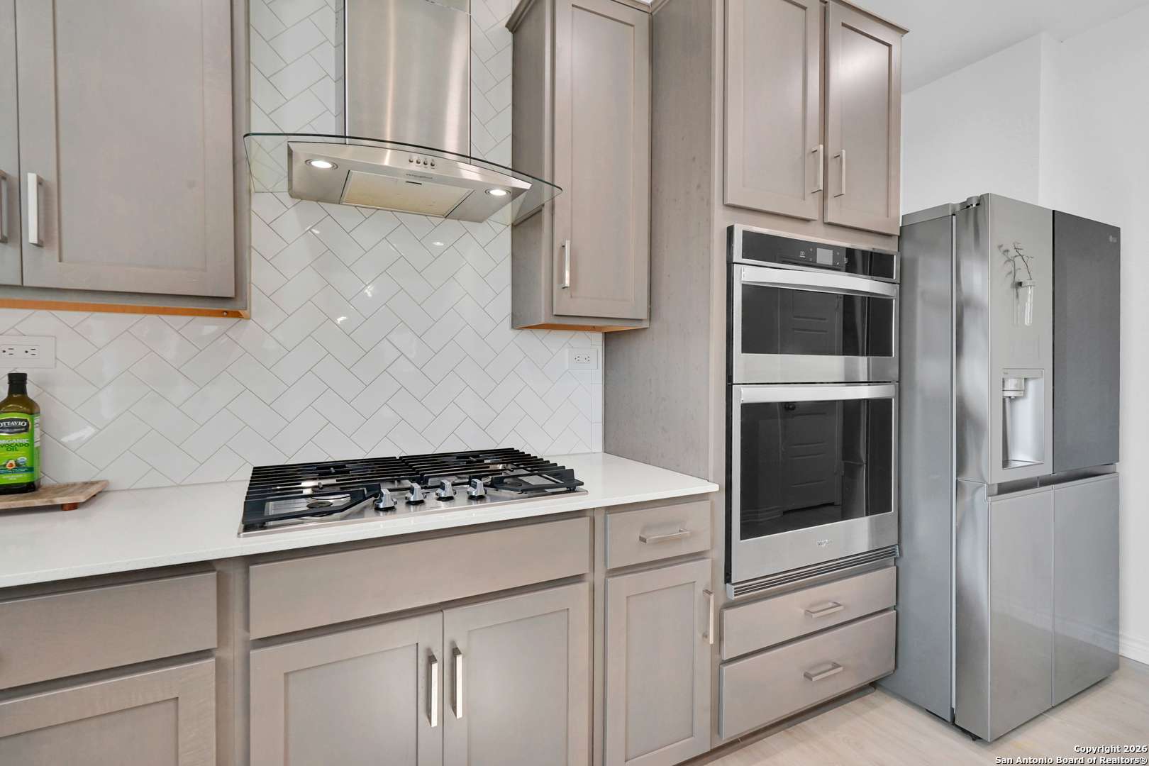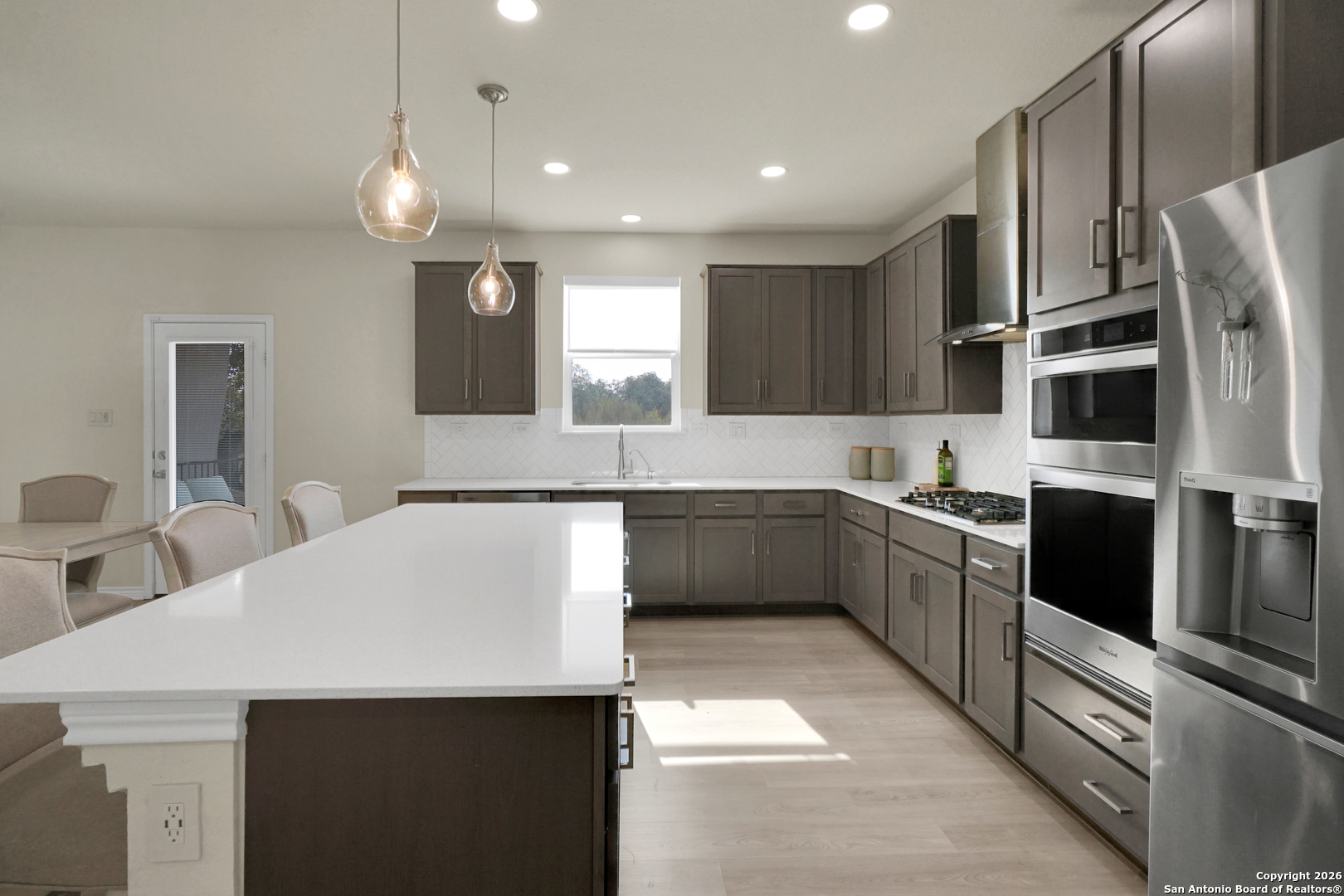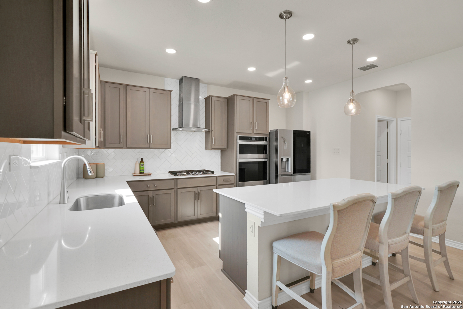 Welcome to this exceptional 3-bedroom, 2.5-bath residence in the desirable Edgebrook subdivision-crafted with thoughtful design and elevated finishes throughout. Offering an inviting office at the front of the home, this two-story beauty blends modern style with the comfort and convenience today's buyers love. Step inside to an impressive open layout where the kitchen overlooks the expansive great room, creating a seamless flow ideal for both entertaining and everyday living. The gourmet kitchen stands out with its Woodmont Dakota 42-inch upper cabinets in a rich ash stain, paired with elegant Silestone Blanco Maple countertops. A striking Emser Catch glossy tile backsplash adds a polished touch, while the extended breakfast bar provides additional seating and prep space. Culinary enthusiasts will appreciate the Whirlpool gas cooktop, smart combination wall oven, canopy hood, and dishwasher-all designed for a high-performance cooking experience. A Moen Sleek high-arc faucet completes the stylish and functional setup. The primary suite offers a peaceful retreat with a beautifully appointed bathroom featuring a separate 42-inch garden tub and tiled shower surround. The extended vanity includes convenient knee space and dual sinks accented by Moen Gibson faucets, creating a spa-like environment. Secondary bedrooms are generously sized, offering flexibility for family, guests, or hobbies. The dedicated study with double doors near the entry is perfect for welcoming clients or creating a quiet space to work from home. Outdoors, unwind under the covered patio and enjoy a lush yard supported by a full sprinkler system-ideal for low-maintenance living and year-round enjoyment. Additional upgrades include Kwikset Amador entry hardware and a wireless security system for added peace of mind. Better than new construction and thoughtfully designed from top to bottom, this home in Edgebrook delivers style, comfort, and convenience in every detail. Ready to welcome its next owner, it's a must-see for anyone seeking modern living in a prime location.