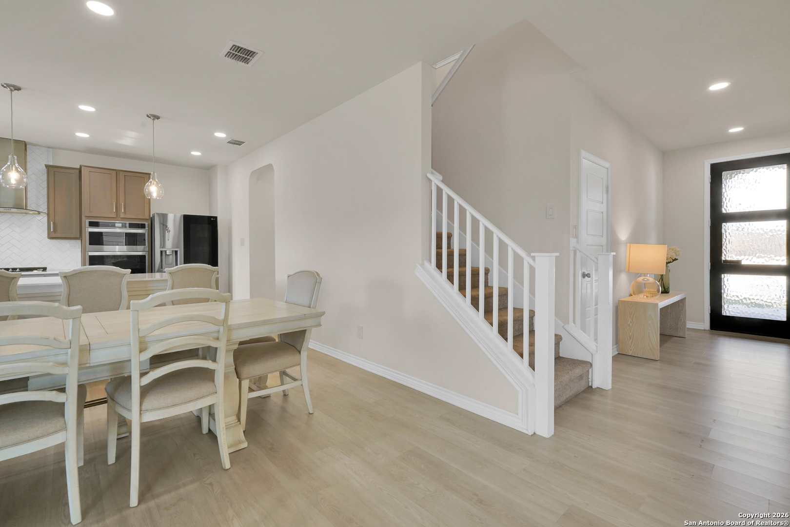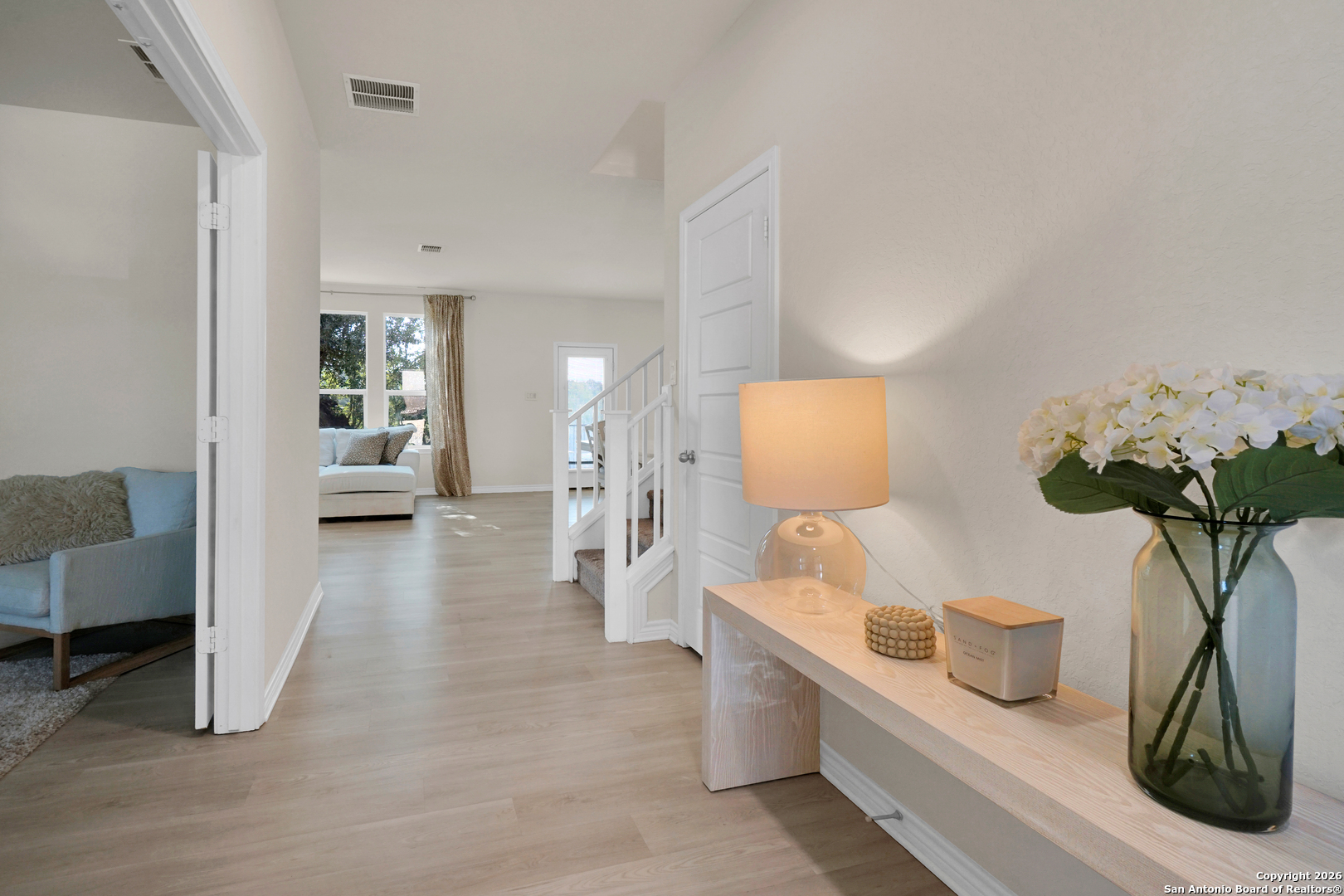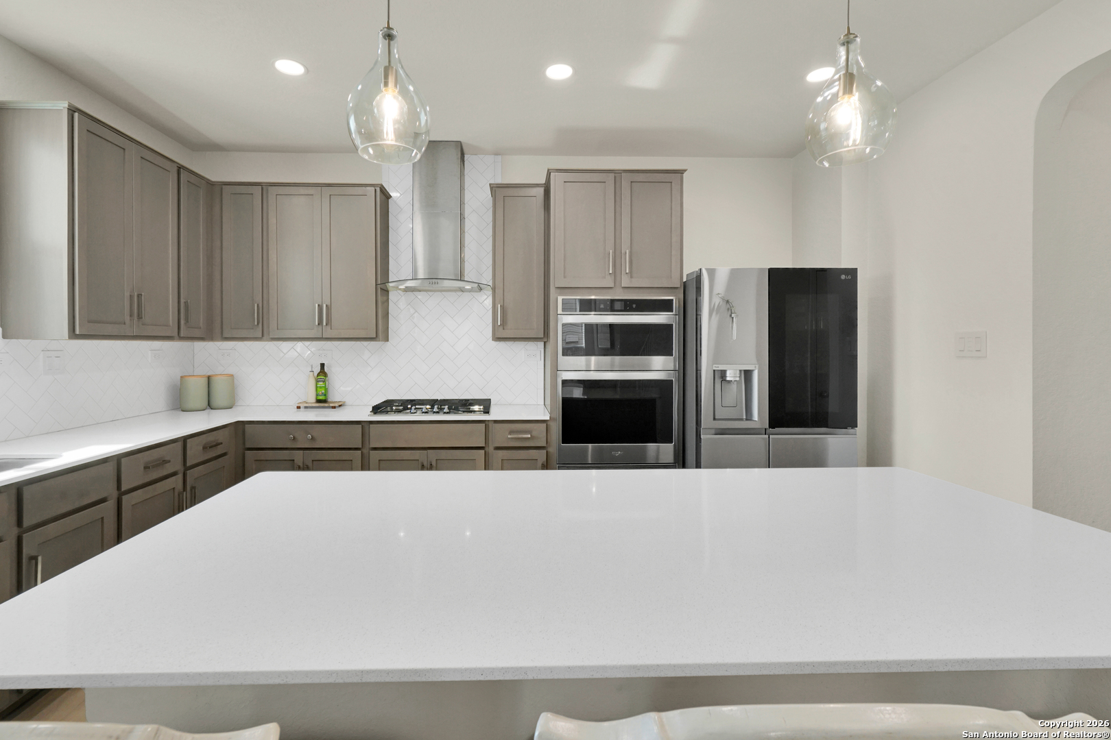 Welcome to this exceptional 3-bedroom, 2.5-bath residence in the desirable Edgebrook subdivision-crafted with thoughtful design and elevated finishes throughout. Offering an inviting office at the front of the home, this two-story beauty blends modern style with the comfort and convenience today's buyers love. Step inside to an impressive open layout where the kitchen overlooks the expansive great room, creating a seamless flow ideal for both entertaining and everyday living. The gourmet kitchen stands out with its Woodmont Dakota 42-inch upper cabinets in a rich ash stain, paired with elegant Silestone Blanco Maple countertops. A striking Emser Catch glossy tile backsplash adds a polished touch, while the extended breakfast bar provides additional seating and prep space. Culinary enthusiasts will appreciate the Whirlpool gas cooktop, smart combination wall oven, canopy hood, and dishwasher-all designed for a high-performance cooking experience. A Moen Sleek high-arc faucet completes the stylish and functional setup. The primary suite offers a peaceful retreat with a beautifully appointed bathroom featuring a separate 42-inch garden tub and tiled shower surround. The extended vanity includes convenient knee space and dual sinks accented by Moen Gibson faucets, creating a spa-like environment. Secondary bedrooms are generously sized, offering flexibility for family, guests, or hobbies. The dedicated study with double doors near the entry is perfect for welcoming clients or creating a quiet space to work from home. Outdoors, unwind under the covered patio and enjoy a lush yard supported by a full sprinkler system-ideal for low-maintenance living and year-round enjoyment. Additional upgrades include Kwikset Amador entry hardware and a wireless security system for added peace of mind. Better than new construction and thoughtfully designed from top to bottom, this home in Edgebrook delivers style, comfort, and convenience in every detail. Ready to welcome its next owner, it's a must-see for anyone seeking modern living in a prime location.