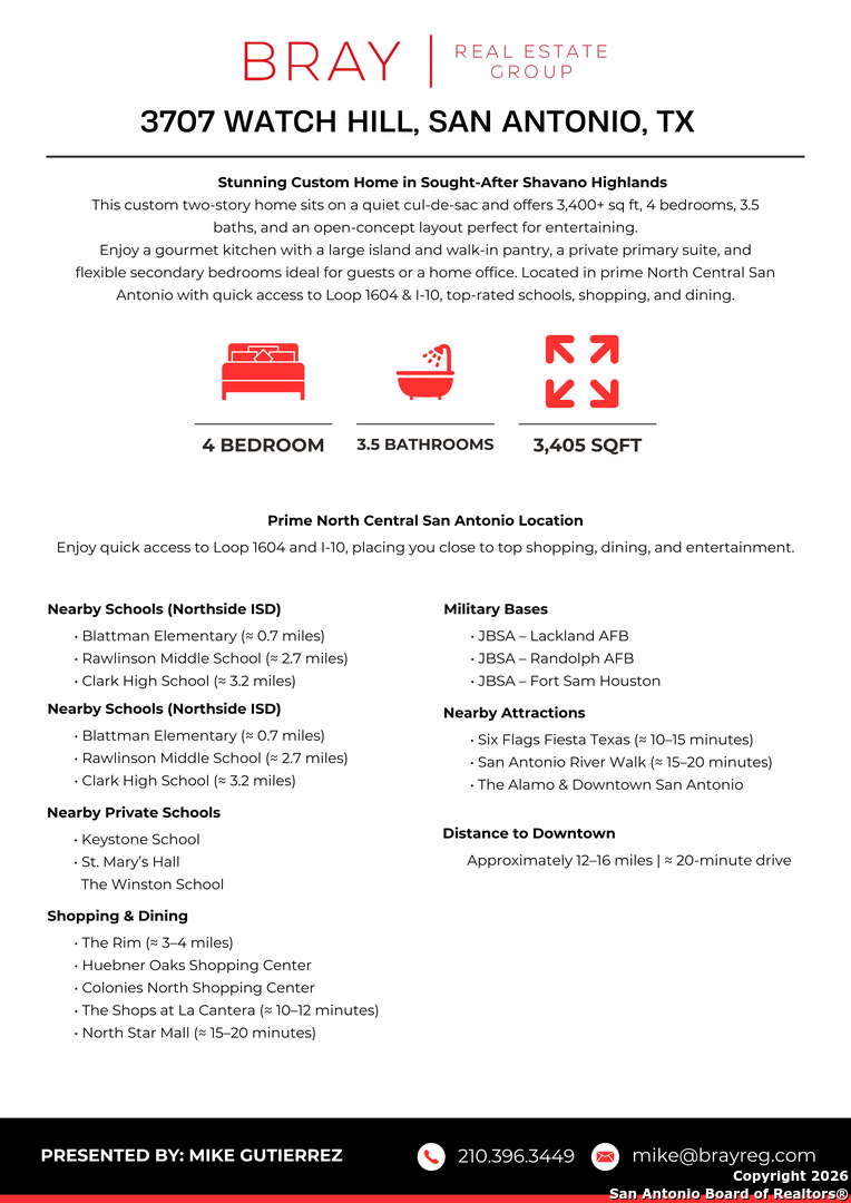 **OPEN HOUSE FRIDAY - SUNDAY 1/30-2/1 11AM-6PM**Beautifully appointed two-story home located on a quiet cul-de-sac in the prestigious Shavano Highlands community of North Central San Antonio. This spacious residence offers over 3,400 square feet of thoughtfully designed living space with four bedrooms, three full bathrooms, and one half bath, making it ideal for both everyday living and entertaining. A standout feature of the home is the attached private casita, which is connected to the main residence yet offers separate exterior entrances, providing exceptional flexibility for multigenerational living, guests, a home office, or rental potential. The home features a gourmet kitchen with a large island and walk-in pantry, a generous primary suite offering privacy and comfort, and well-sized secondary bedrooms filled with natural light. Conveniently located near Loop 1604 and I-10, the property provides easy access to premier shopping and dining including The Rim, The Shops at La Cantera, Huebner Oaks Shopping Center, Colonies North Shopping Center, and North Star Mall. Zoned to highly regarded Northside ISD schools including Blattman Elementary, Rawlinson Middle School, and Clark High School, with nearby private school options such as Cornerstone Christian School,Keystone School, St. Mary's Hall, and The Winston School. The home is within commuting distance to major military installations including Joint Base San Antonio Lackland, Randolph, and Fort Sam Houston. Nearby attractions include Six Flags Fiesta Texas, the San Antonio River Walk, The Alamo, and downtown San Antonio, all approximately 12 to 16 miles away or about a 20-minute drive. This property presents an exceptional opportunity to enjoy established community living, privacy, and convenience in one of San Antonio's most desirable areas.