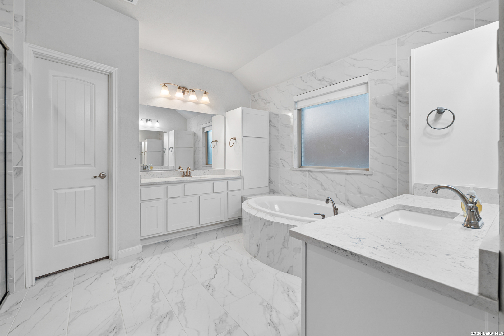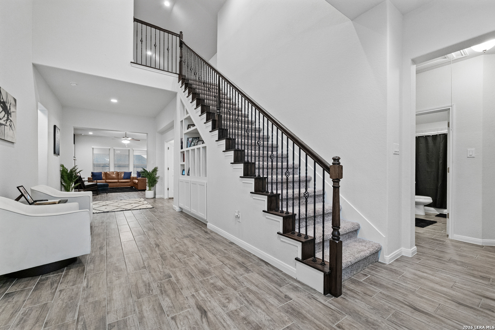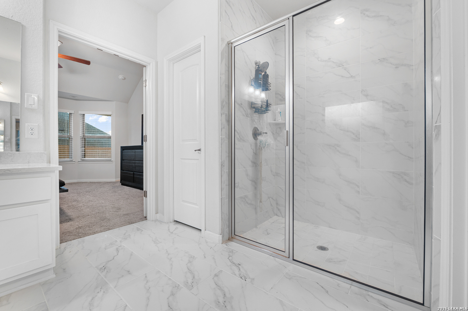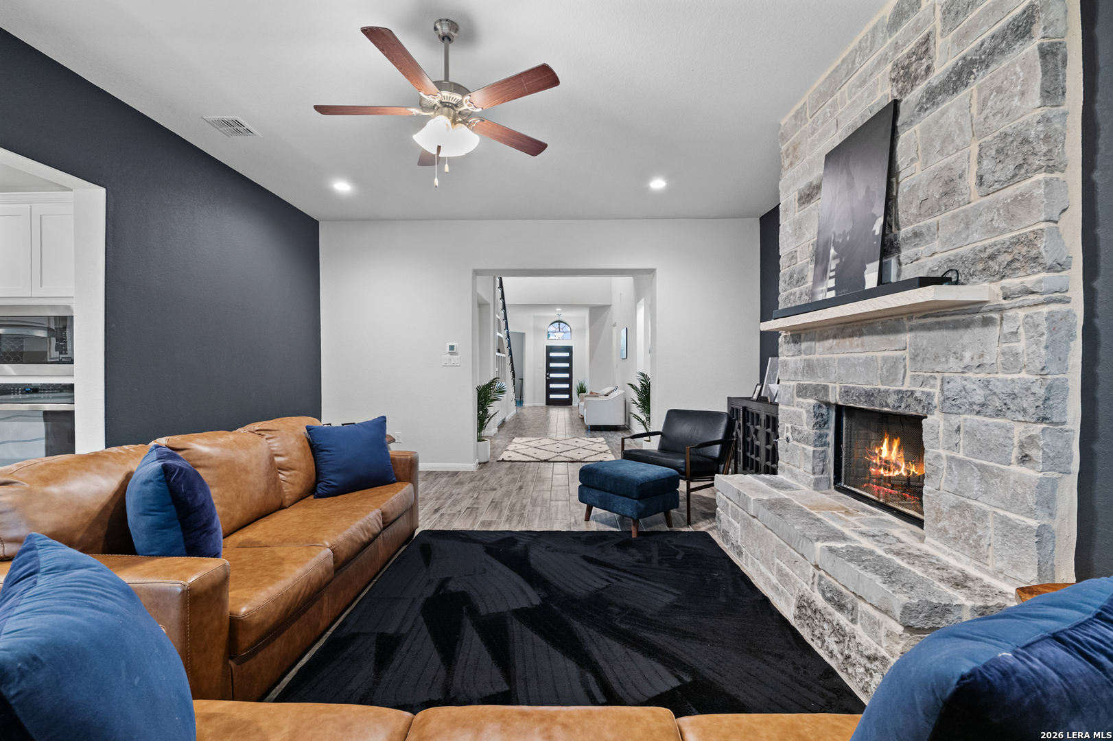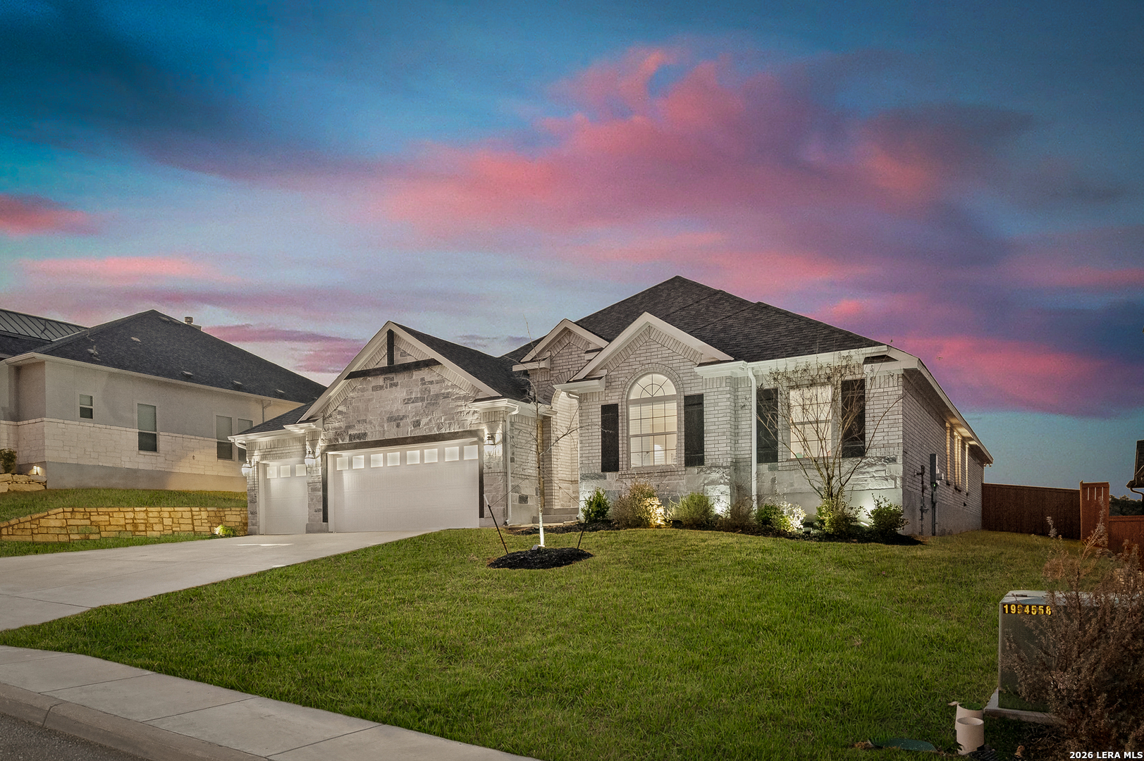 Lose the traffic and escape to your gated sanctuary overlooking the links of TPC in Cibolo Canyons on San Antonio's north side. Built in 2023, this beautifully designed 4-bedroom, 3-bath home offers over 3,200 square feet of stylish, functional living on a generous .249-acre lot. Featuring a highly desirable floorplan with all bedrooms located downstairs, this layout boasts an expansive 500+ sq ft loft upstairs providing the perfect space for a game room, media room, home gym, or second living area. Inside, you'll find soaring ceilings, designer touches, and an open-concept layout ideal for both entertaining and everyday living. The spacious living room is centered around a striking floor-to-ceiling stone fireplace and opens seamlessly to the chef-inspired kitchen with a large island, abundant cabinetry, and plenty of prep space. The private primary suite is a true retreat, complete with a spa-like bath featuring dual vanities, a soaking tub, separate shower, and generous closet space. Outside, the oversized lot offers endless possibilities for outdoor enjoyment, while the rare 4-car garage adds exceptional value and versatility. Modern, spacious, and move-in ready-this better than new home offers the secure tranquility, style, and prestige you expect from one of San Antonio's premier communities.