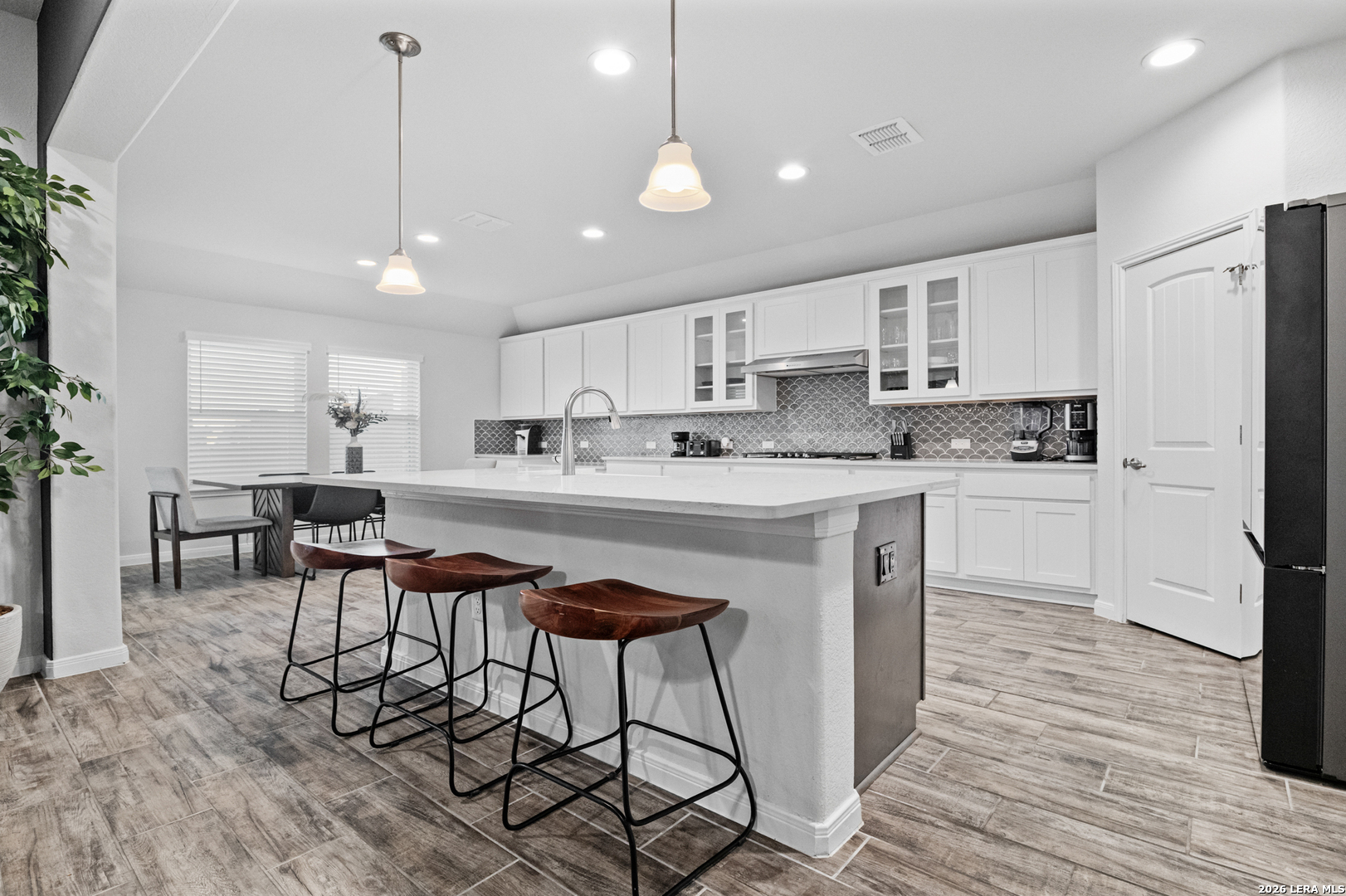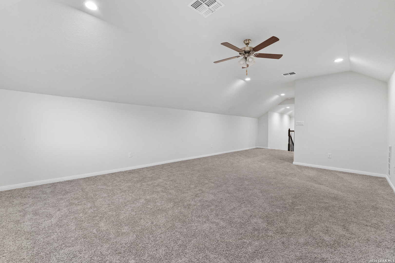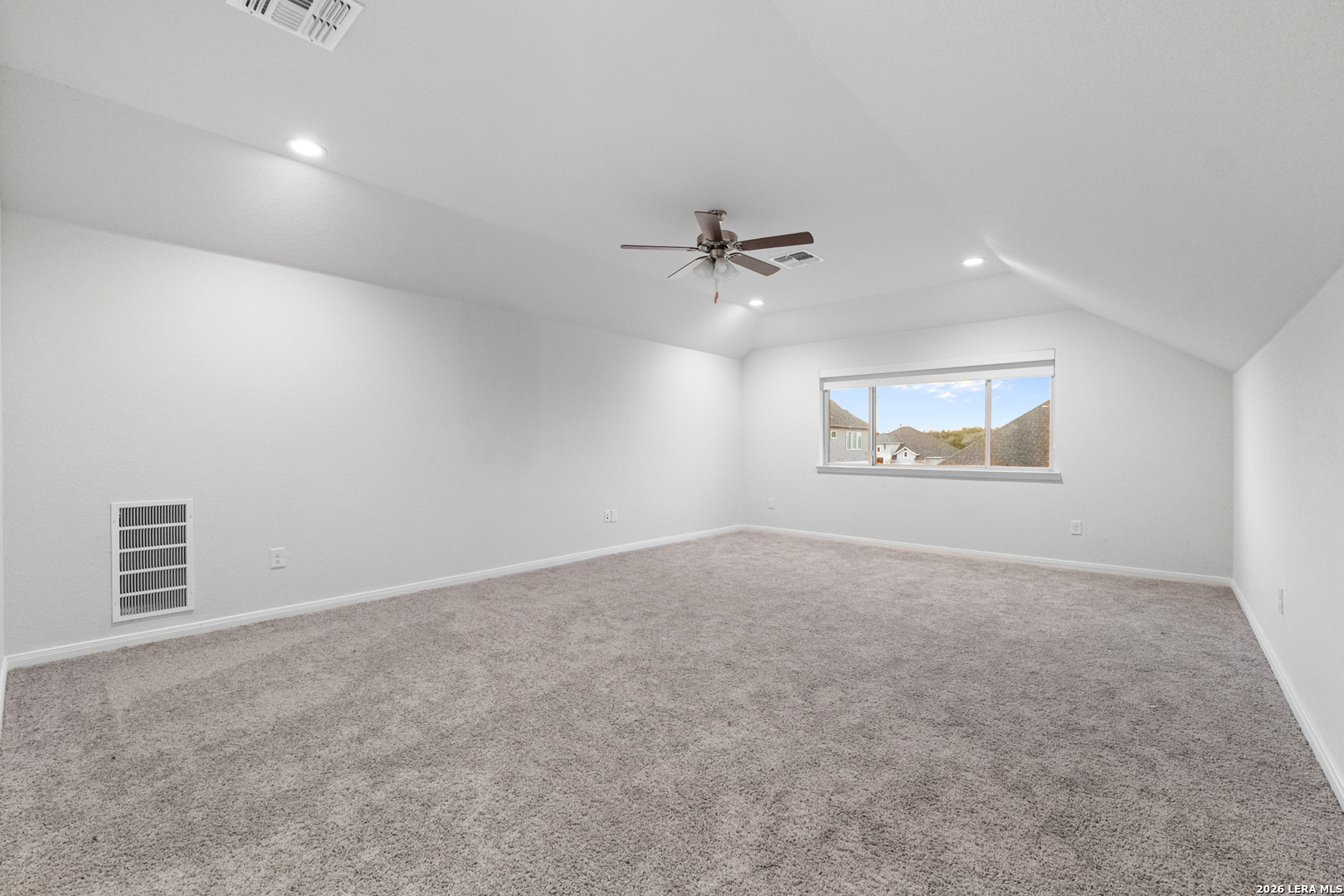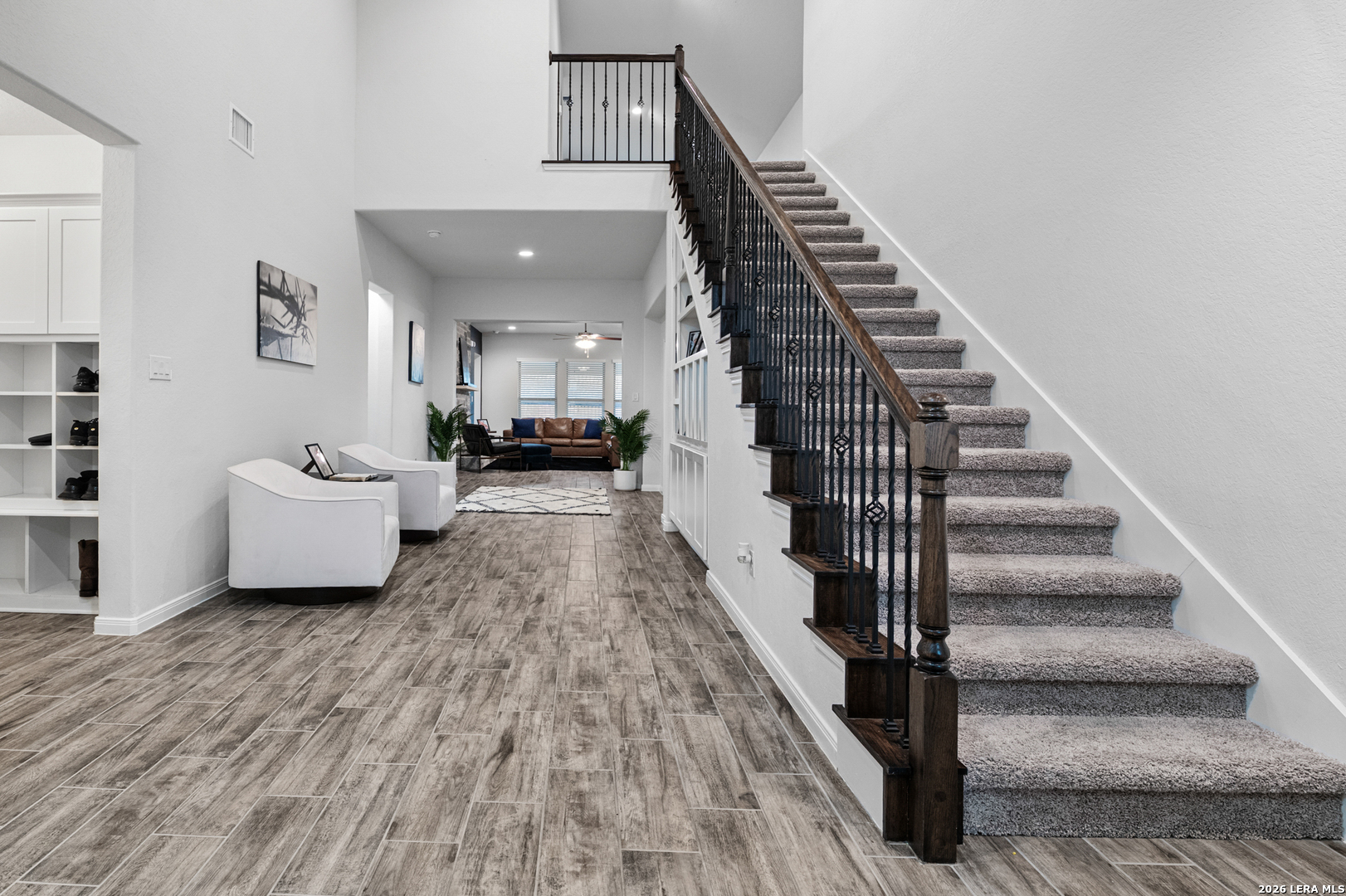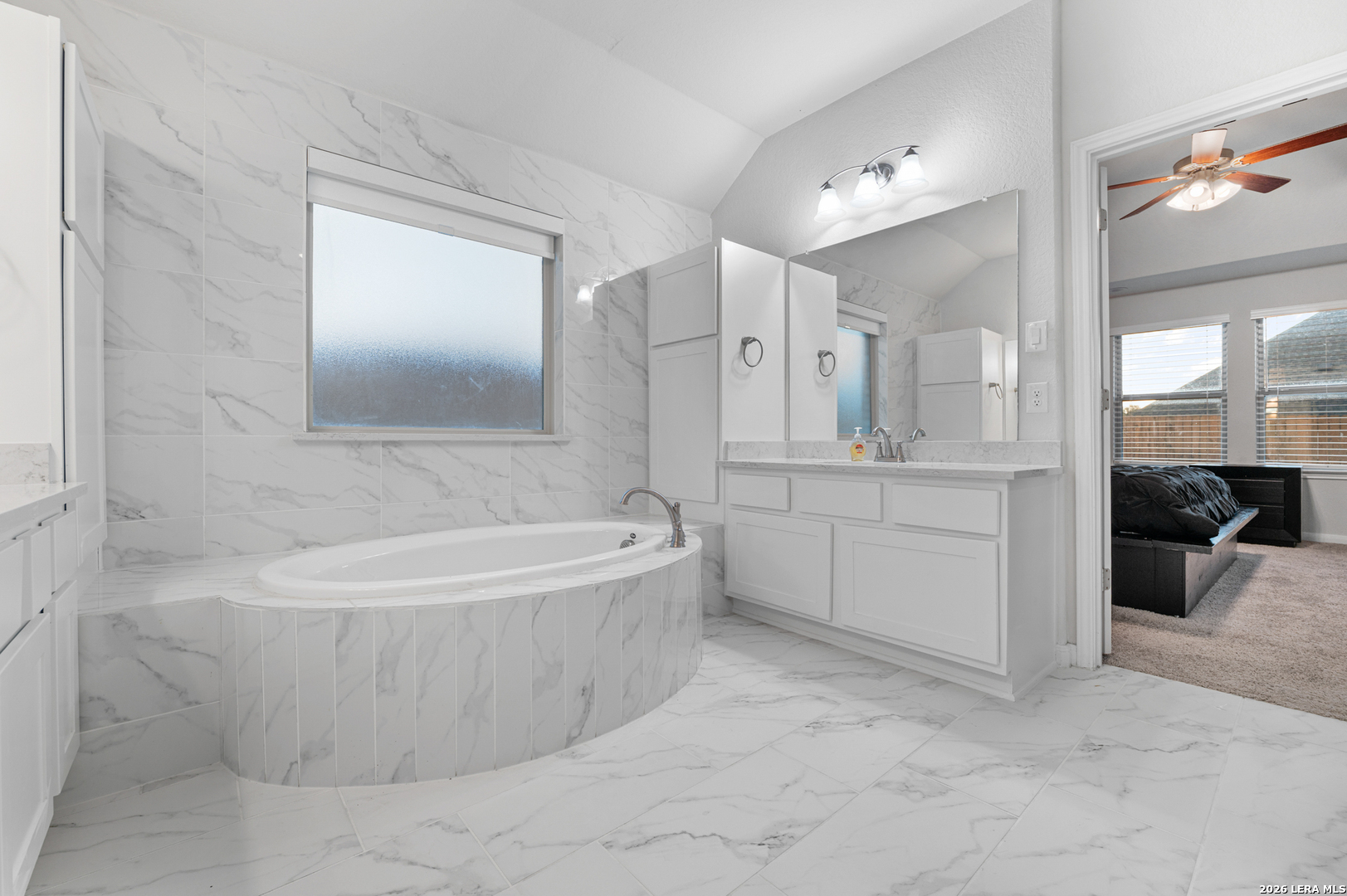 Lose the traffic and escape to your gated sanctuary overlooking the links of TPC in Cibolo Canyons on San Antonio's north side. Built in 2023, this beautifully designed 4-bedroom, 3-bath home offers over 3,200 square feet of stylish, functional living on a generous .249-acre lot. Featuring a highly desirable floorplan with all bedrooms located downstairs, this layout boasts an expansive 500+ sq ft loft upstairs providing the perfect space for a game room, media room, home gym, or second living area. Inside, you'll find soaring ceilings, designer touches, and an open-concept layout ideal for both entertaining and everyday living. The spacious living room is centered around a striking floor-to-ceiling stone fireplace and opens seamlessly to the chef-inspired kitchen with a large island, abundant cabinetry, and plenty of prep space. The private primary suite is a true retreat, complete with a spa-like bath featuring dual vanities, a soaking tub, separate shower, and generous closet space. Outside, the oversized lot offers endless possibilities for outdoor enjoyment, while the rare 4-car garage adds exceptional value and versatility. Modern, spacious, and move-in ready-this better than new home offers the secure tranquility, style, and prestige you expect from one of San Antonio's premier communities.