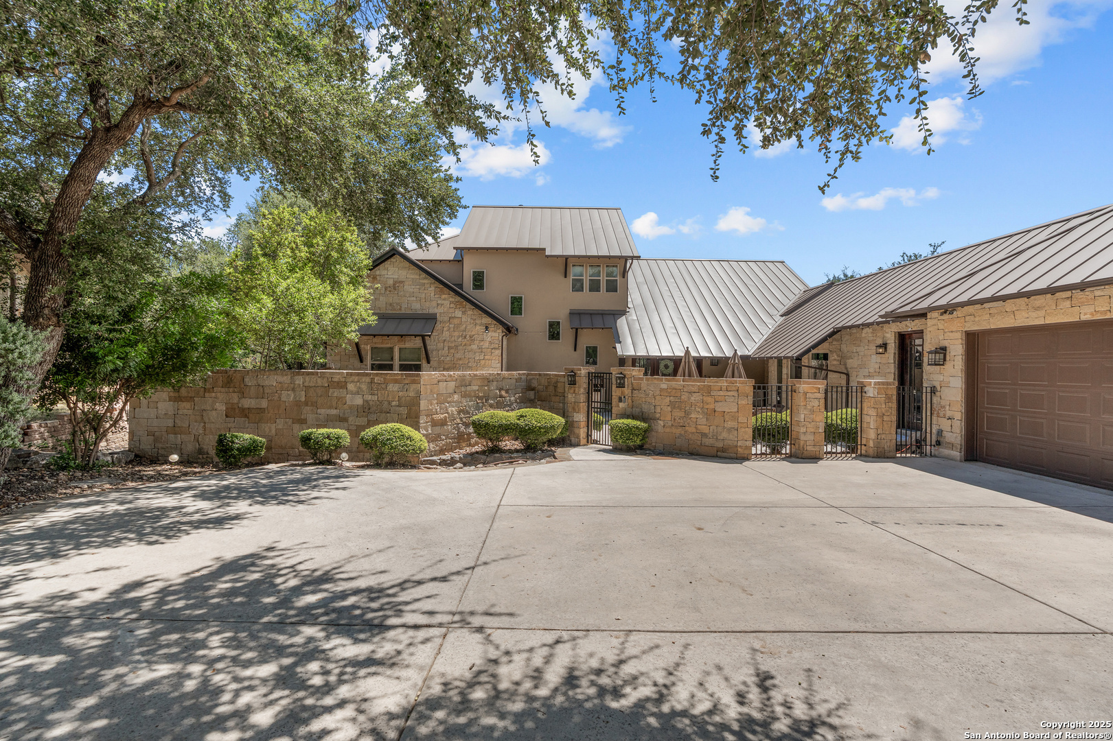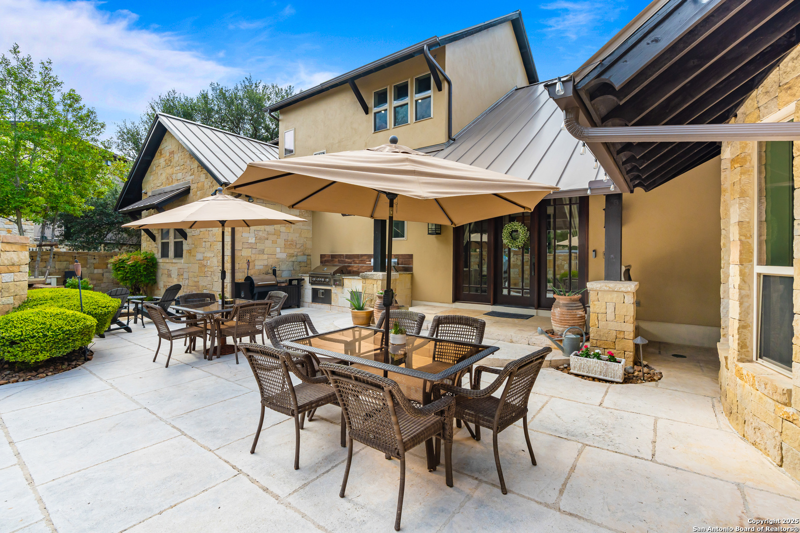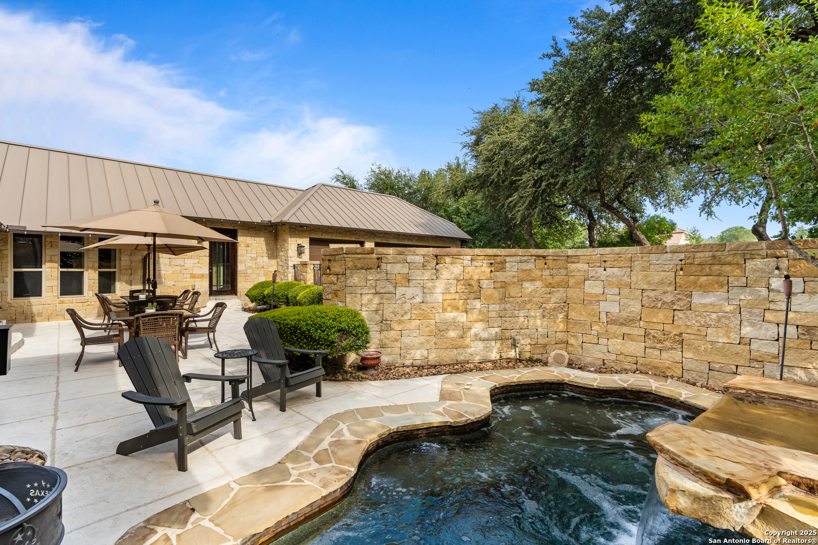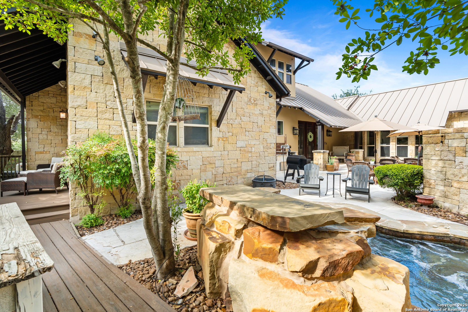 Experience timeless Texas Hill Country architecture enhanced with modern conveniences in this award-winning former model home, an exquisite 4 bedroom, 4.5 bath masterpiece by renowned builder Don Craighead. Designed for those who appreciate elegance, sophistication, and effortless living, this residence offers a lifestyle unlike any other. A long driveway, tree-studded lot, and romantic courtyard create a striking first impression, leading to an outdoor haven complete with a Wolf kitchen, sparkling cocktail pool with tranquil water feature, LED lighting and integrated outdoor surround sound that sets the stage for unforgettable gatherings. Inside, soaring ceilings, expansive living areas, and artisan details flow seamlessly, highlighted by a gourmet Miele kitchen with six-burner gas cooktop, double ovens, three inch stone countertops, custom spice racks, hidden trash compartments, and a walk-in pantry with appliance counter and space for a Sub-Zero refrigerator. Two distinct living spaces, a formal dining area, and a dedicated bar make entertaining effortless. Perfect for multi-generational living, this home offers a separate entrance to an elegant guest suite featuring a full bath, dual walk-in closets, and its own serene outdoor retreat with a Trex deck. Each bedroom throughout the residence is a spacious private retreat, offering the comfort and convenience of its own full bath. The primary suite is a true sanctuary with a spa-like bathroom, custom vanity and makeup storage, generous closet space with custom built-ins and drawers, and offers private access to a large screened-in patio, another inviting space to relax or entertain year-round. highlights throughout the residence include a standing seam metal roof, hardwood floors with a refined Hill Country feel (carpet-free), custom hand-troweled finishes, solid wood doors, custom built-ins, rock wall accents, stately crown molding, 8" baseboards, Control4 home automation, full-home intercom and surround sound, central vac, epoxy garage flooring, abundant storage, and a foam-insulated walk-in attic. Set on a private lot with no neighbors behind, the home offers rare seclusion while still nestled within an intimate gated enclave. Residents also enjoy access to Cibolo Canyons' resort-style amenities including two championship golf courses, fitness center, pools, lazy river, and scenic trails, all just minutes from Highway 281, Loop 1604, shopping, dining, the airport, major employers, and award-winning schools. This is more than a home, it's a refined lifestyle set apart from the rest.