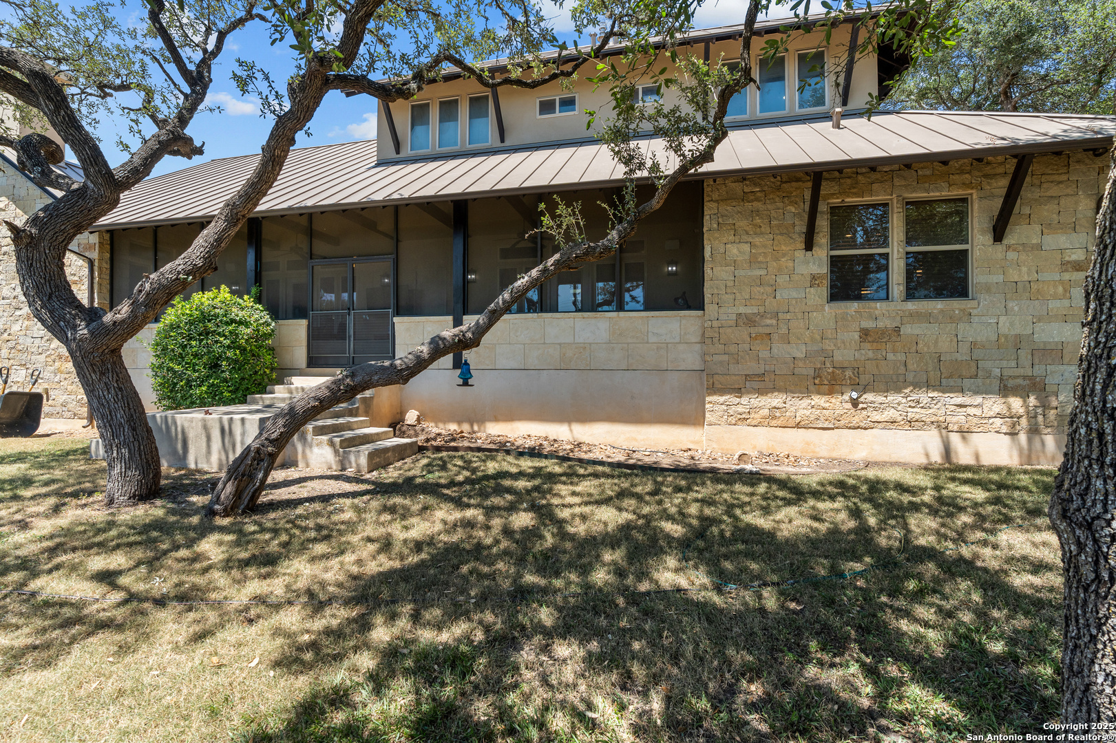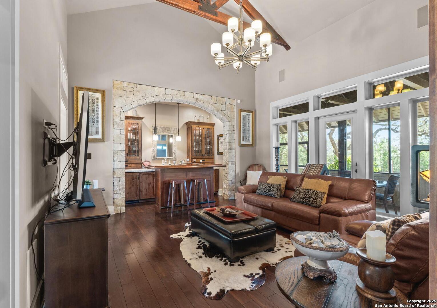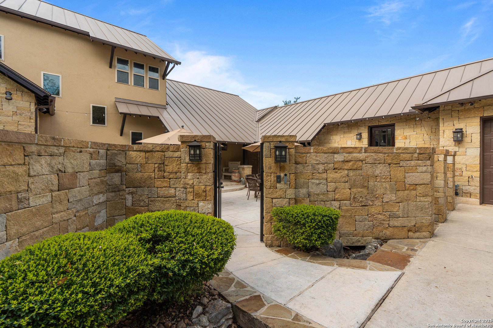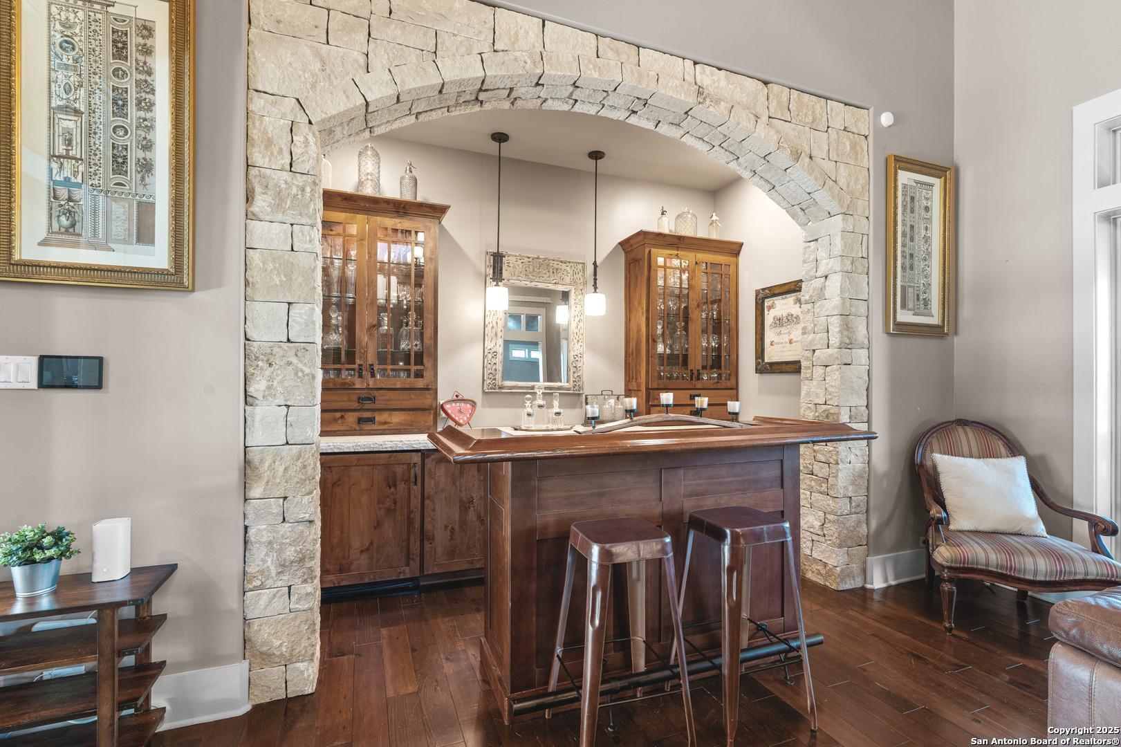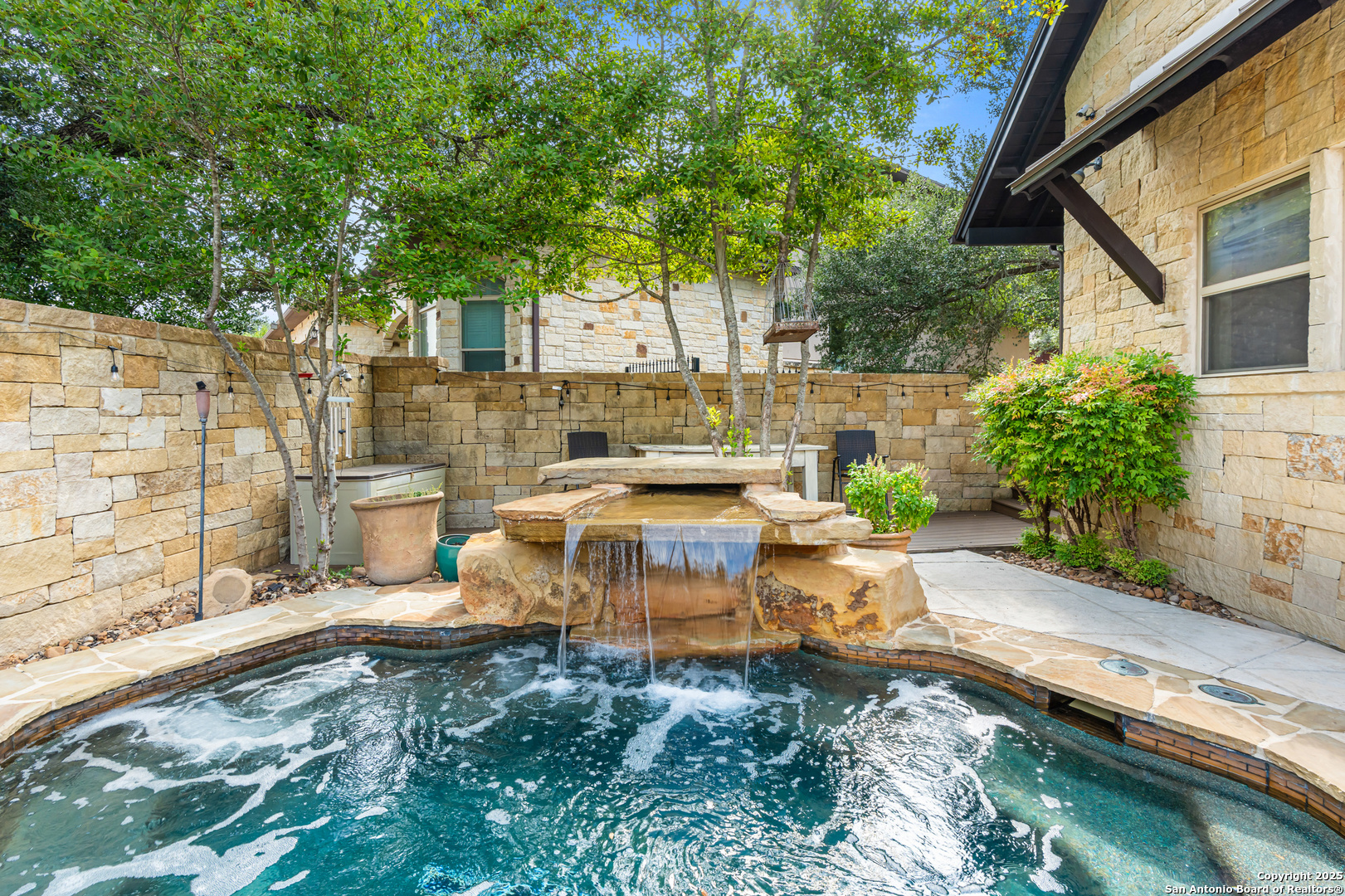 Experience timeless Texas Hill Country architecture enhanced with modern conveniences in this award-winning former model home, an exquisite 4 bedroom, 4.5 bath masterpiece by renowned builder Don Craighead. Designed for those who appreciate elegance, sophistication, and effortless living, this residence offers a lifestyle unlike any other. A long driveway, tree-studded lot, and romantic courtyard create a striking first impression, leading to an outdoor haven complete with a Wolf kitchen, sparkling cocktail pool with tranquil water feature, LED lighting and integrated outdoor surround sound that sets the stage for unforgettable gatherings. Inside, soaring ceilings, expansive living areas, and artisan details flow seamlessly, highlighted by a gourmet Miele kitchen with six-burner gas cooktop, double ovens, three inch stone countertops, custom spice racks, hidden trash compartments, and a walk-in pantry with appliance counter and space for a Sub-Zero refrigerator. Two distinct living spaces, a formal dining area, and a dedicated bar make entertaining effortless. Perfect for multi-generational living, this home offers a separate entrance to an elegant guest suite featuring a full bath, dual walk-in closets, and its own serene outdoor retreat with a Trex deck. Each bedroom throughout the residence is a spacious private retreat, offering the comfort and convenience of its own full bath. The primary suite is a true sanctuary with a spa-like bathroom, custom vanity and makeup storage, generous closet space with custom built-ins and drawers, and offers private access to a large screened-in patio, another inviting space to relax or entertain year-round. highlights throughout the residence include a standing seam metal roof, hardwood floors with a refined Hill Country feel (carpet-free), custom hand-troweled finishes, solid wood doors, custom built-ins, rock wall accents, stately crown molding, 8" baseboards, Control4 home automation, full-home intercom and surround sound, central vac, epoxy garage flooring, abundant storage, and a foam-insulated walk-in attic. Set on a private lot with no neighbors behind, the home offers rare seclusion while still nestled within an intimate gated enclave. Residents also enjoy access to Cibolo Canyons' resort-style amenities including two championship golf courses, fitness center, pools, lazy river, and scenic trails, all just minutes from Highway 281, Loop 1604, shopping, dining, the airport, major employers, and award-winning schools. This is more than a home, it's a refined lifestyle set apart from the rest.