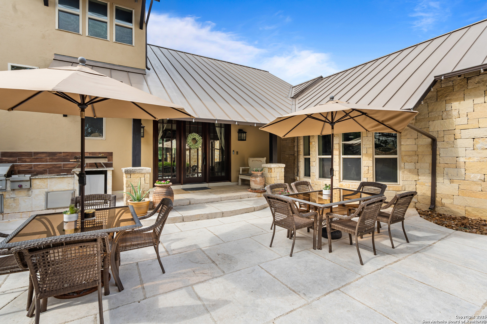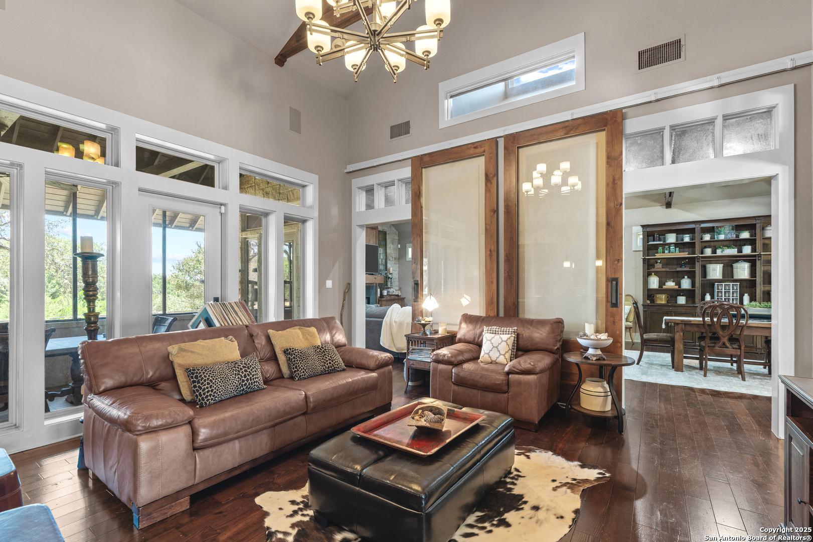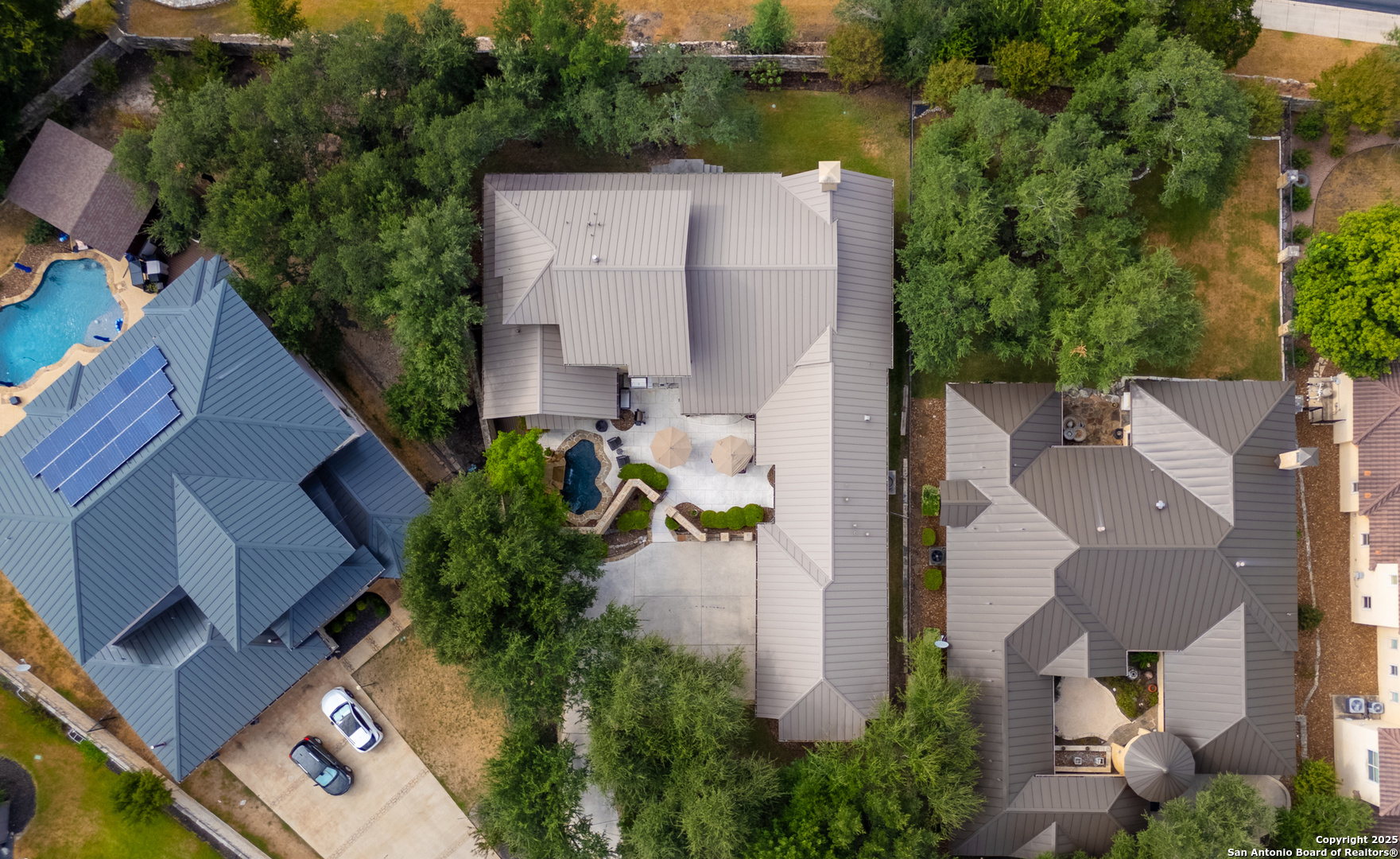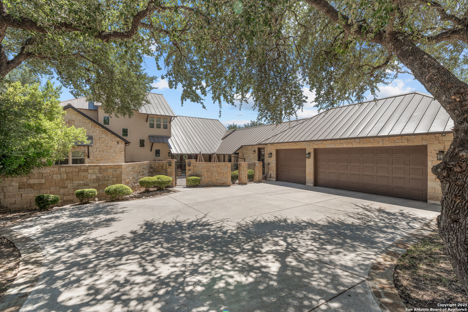 Experience timeless Texas Hill Country architecture enhanced with modern conveniences in this award-winning former model home, an exquisite 4 bedroom, 4.5 bath masterpiece by renowned builder Don Craighead. Designed for those who appreciate elegance, sophistication, and effortless living, this residence offers a lifestyle unlike any other. A long driveway, tree-studded lot, and romantic courtyard create a striking first impression, leading to an outdoor haven complete with a Wolf kitchen, sparkling cocktail pool with tranquil water feature, LED lighting and integrated outdoor surround sound that sets the stage for unforgettable gatherings. Inside, soaring ceilings, expansive living areas, and artisan details flow seamlessly, highlighted by a gourmet Miele kitchen with six-burner gas cooktop, double ovens, three inch stone countertops, custom spice racks, hidden trash compartments, and a walk-in pantry with appliance counter and space for a Sub-Zero refrigerator. Two distinct living spaces, a formal dining area, and a dedicated bar make entertaining effortless. Perfect for multi-generational living, this home offers a separate entrance to an elegant guest suite featuring a full bath, dual walk-in closets, and its own serene outdoor retreat with a Trex deck. Each bedroom throughout the residence is a spacious private retreat, offering the comfort and convenience of its own full bath. The primary suite is a true sanctuary with a spa-like bathroom, custom vanity and makeup storage, generous closet space with custom built-ins and drawers, and offers private access to a large screened-in patio, another inviting space to relax or entertain year-round. highlights throughout the residence include a standing seam metal roof, hardwood floors with a refined Hill Country feel (carpet-free), custom hand-troweled finishes, solid wood doors, custom built-ins, rock wall accents, stately crown molding, 8" baseboards, Control4 home automation, full-home intercom and surround sound, central vac, epoxy garage flooring, abundant storage, and a foam-insulated walk-in attic. Set on a private lot with no neighbors behind, the home offers rare seclusion while still nestled within an intimate gated enclave. Residents also enjoy access to Cibolo Canyons' resort-style amenities including two championship golf courses, fitness center, pools, lazy river, and scenic trails, all just minutes from Highway 281, Loop 1604, shopping, dining, the airport, major employers, and award-winning schools. This is more than a home, it's a refined lifestyle set apart from the rest.