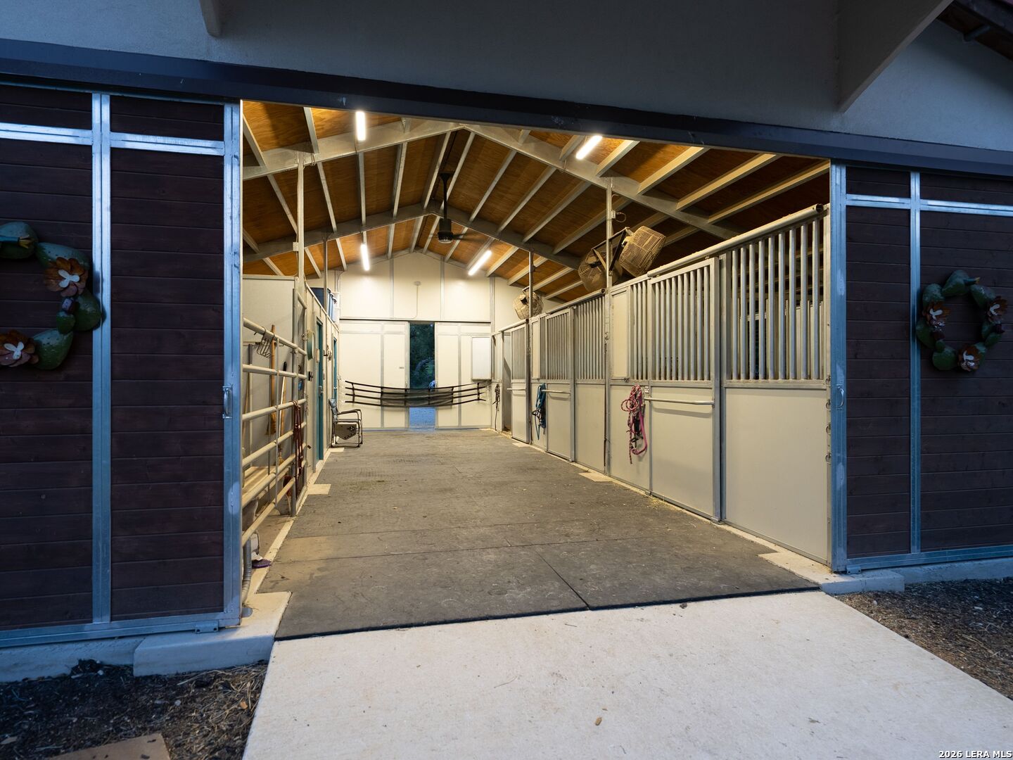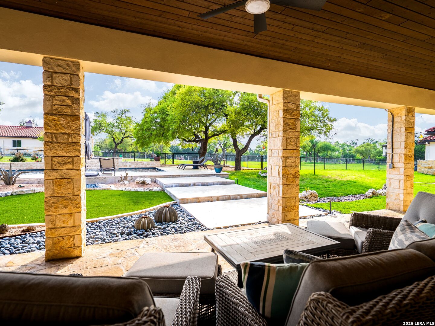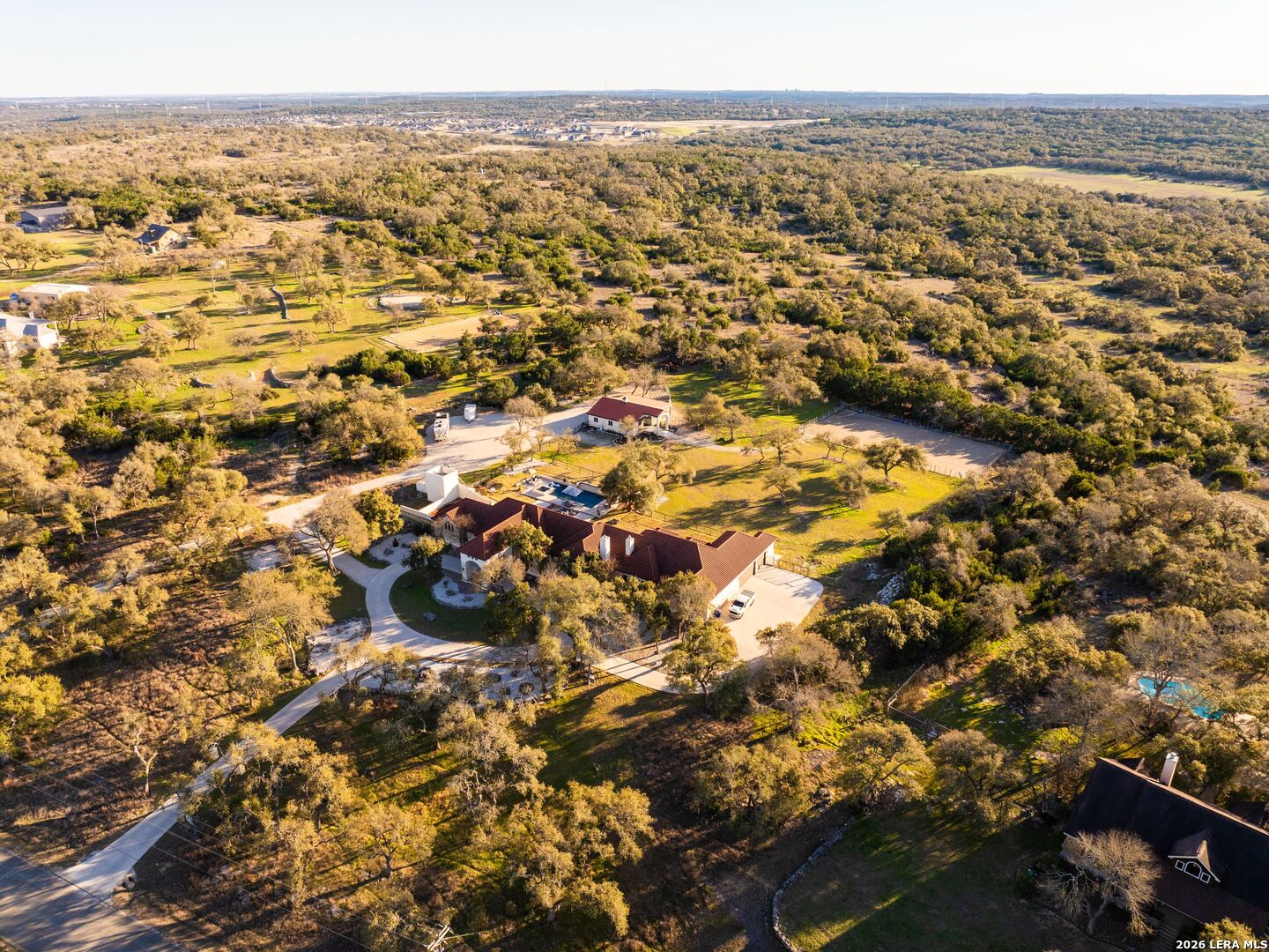 Presenting an exceptional LUXURY EQUESTRIAN ESTATE - this private retreat seamlessly blends incredible horse facilities with refined living, offering a perfect balance of tranquility and sophisticated lifestyle. Set on 5 thoughtfully designed acres, this 5,287 sq ft single-story residence is a true designer's masterpiece, showcasing Spanish flair with Texas Hill Country charm. The home offers an open-concept layout with high-end finishes throughout, including beautiful stone and trending hardwood floors that complement the stunning interior. This estate is located in the highly sought-after Waggener Ranch community, which spans 850 pristine acres and is home to over 200 exotic animals. At the heart of the home is a gourmet kitchen, perfect for both the passionate chef and the avid entertainer. The kitchen features WiFi-enabled Thermador appliances, including a 48" gas range, dual ovens, and a built-in espresso machine. The 7' tall wine fridge is flanked by full-sized Thermador custom paneled refrigerator and freezer units. The massive quartz-topped center island is an ideal gathering place, while the walk-in pantry ensures there's ample space to organize your ingredients in style. Additionally, the reverse osmosis water filtration system ensures only the purest water for both cooking and drinking. The primary suite offers a serene retreat, designed for ultimate relaxation and comfort. This expansive space features private access to the outdoors, while the spa-inspired primary bath is a masterpiece, with a waterfall marble vanity, a freestanding soaking tub, and an intricately tiled walk-in shower. The suite also includes dual walk-in closets, providing ample space for organization, and a convenient secondary laundry area that is accessible directly through the closet, making laundry day a breeze. Every detail in the suite was carefully crafted for luxury and functionality. Each of the secondary bedrooms has its own en-suite bath with luxury finishes and walk-in closets, while two half-baths cater to guests. The game room and bar area, complete with a cozy fireplace and wet bar, leads to a pre-wired media room-perfect for movie nights or a cozy retreat. The impeccably designed office, located at the front of the home, is spacious and exudes an elegant masculine charm, featuring rich wood trim on the walls. Step outside to enjoy the Hill Country views from the expansive back patio, which leads to a two-story observation deck. The home's outdoor living space also features a brand-new pool with a jacuzzi and fire feature, crafted by Texas' top pool builders, Infinity Pool, and comes with a five-year transferable warranty. This exceptional estate is designed for ultimate efficiency, featuring a Daikin commercial HVAC system (three units, two years old), blown foam insulation in the attic, and a new 900 ft deep well tapping into the Trinity Aquifer, complete with a heavy metal filter, booster pump, pressure tank, and water softener. A 2500-gallon cistern ensures an ample water supply for both the home and the equestrian facilities. For equestrian enthusiasts, the 3-horse barn offers a climate-controlled tack room and feed room as well as 12x12 hay storage, with automatic waterers in each stall. The property is fenced and cross-fenced with King Ranch-style fencing, creating four zones for horses. The 70x120 ft arena, featuring Trutex and sand footing, ensures optimal training conditions. With a cement tile roof and stucco exterior, the barn is as durable and luxurious as the home itself. The driveway to the barn is chip-sealed and large enough for large trailers and deliveries to easily turn around. This property offers a rare combination of luxury, privacy, and equestrian functionality, making it the ultimate destination for those seeking the finest in Texas living. Whether you are a passionate equestrian or simply seeking a peaceful sanctuary with world-class amenities, this estate is truly a once-in-a-lifetime opportunity.