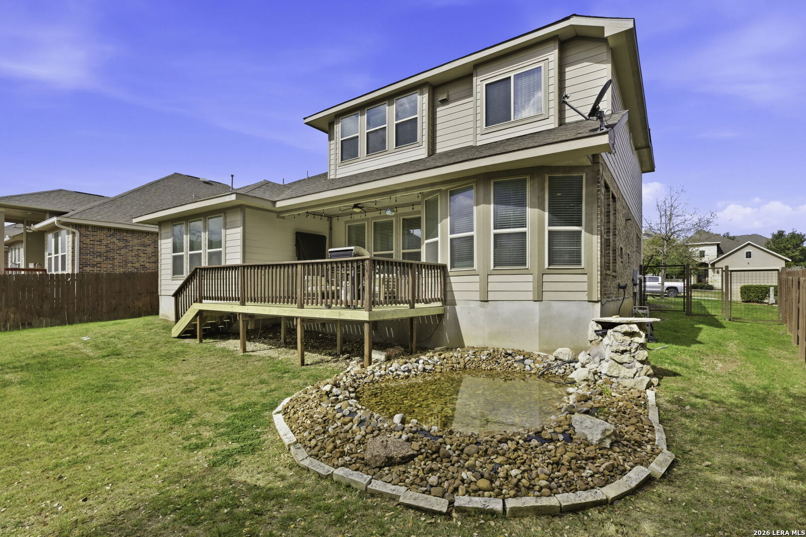 SO MANY EXTRAS!!!!! Come & see this fabulous new listing in the hill country community of Johnson Ranch in Bulverde! Close to San Antonio but just far enough out to enough peaceful evening sunsets and spectacular star filled night skies. This 2 story home has a lot to offer. Amenities include....*short quiet street *pond with waterfall feature * 12x12 storage bldg *island kitchen *appliances to convey are kitchen refrigerator, washer, dryer, water softener, reverse osmosis *garage door opener *electronic keypad lock at front door *ceiling shelf in garage *all curtains in home but pink ones *satellite dish *tv at back porch *alarm system with window and door sensors *tv in living room *blinds throughout home *granite counters Upgrades in the home include: *ceiling fans in all bedrooms, living room, gameroom and back patio *2 electric fireplaces..gmrm & living room *new decking at back patio thats approx 18x10 *wood & iron railing at staircase *laminate flooring in gmrm/owners ste *12x12 storage shed *water pond with waterfall feature *wainscot detail in laundry w shelving and so much more! Come see us today before it's gone!