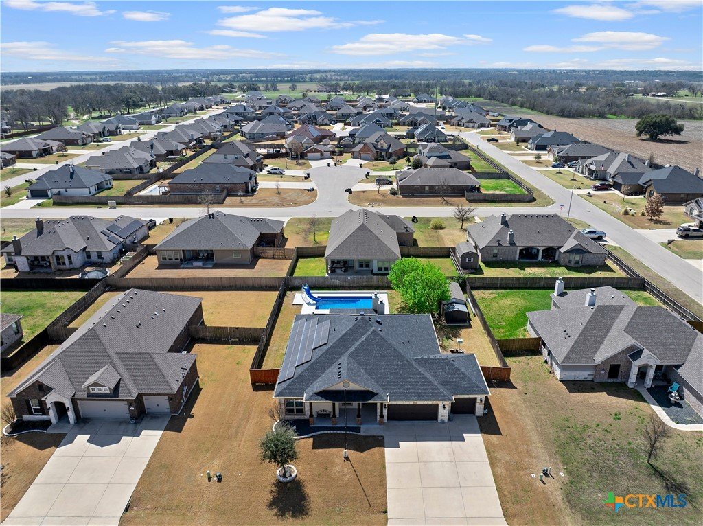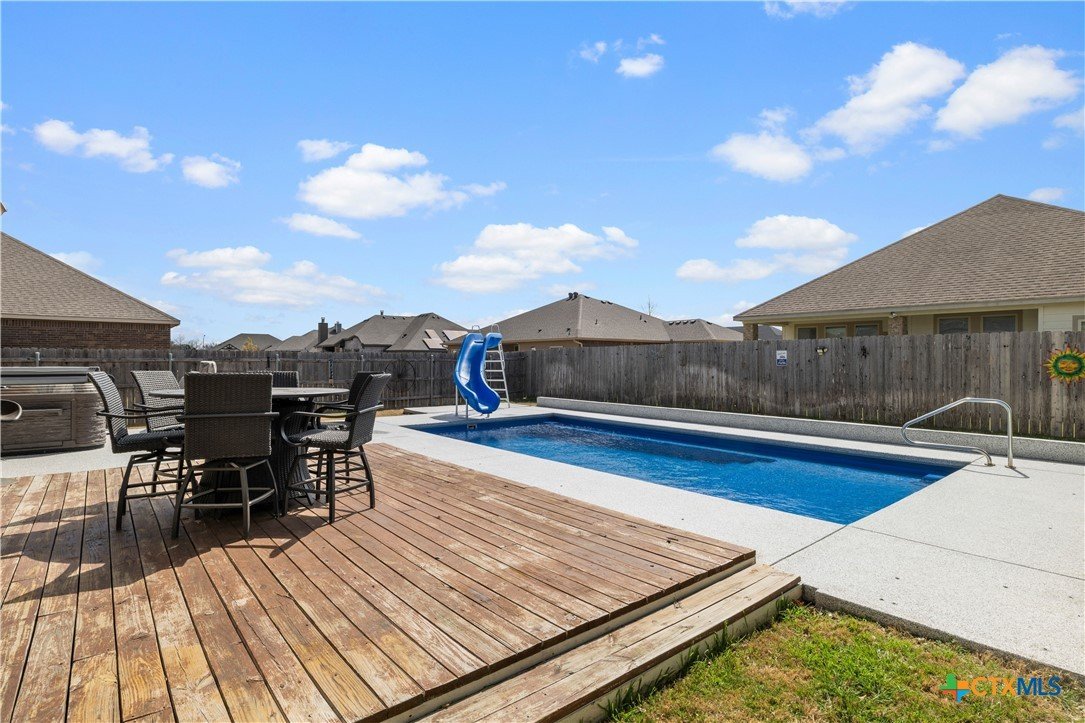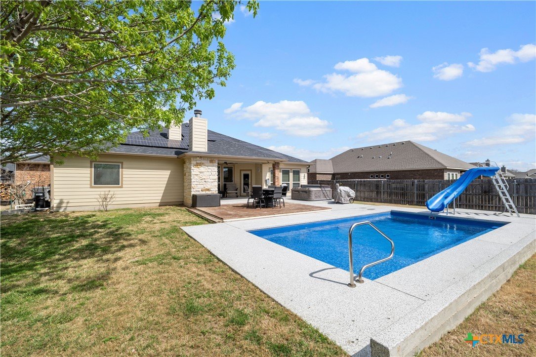 Beautiful Omega-built 4 bedroom, 2 bath home with a backyard designed for entertaining. Enjoy the inground pool surrounded by resurfaced concrete and a covered back patio complete with outdoor fireplace, TV and hot tub, perfect for relaxing or hosting friends and family. The backyard also features a storage building and raised flower beds for gardening or extra storage. Solar panels add energy efficiency and help with utility savings. This home offers a great combination of comfort, function, and outdoor living in a desirable Temple location. Also includes removable pool fencing and solar cover for pool, along with a 50 amp plug for RV.