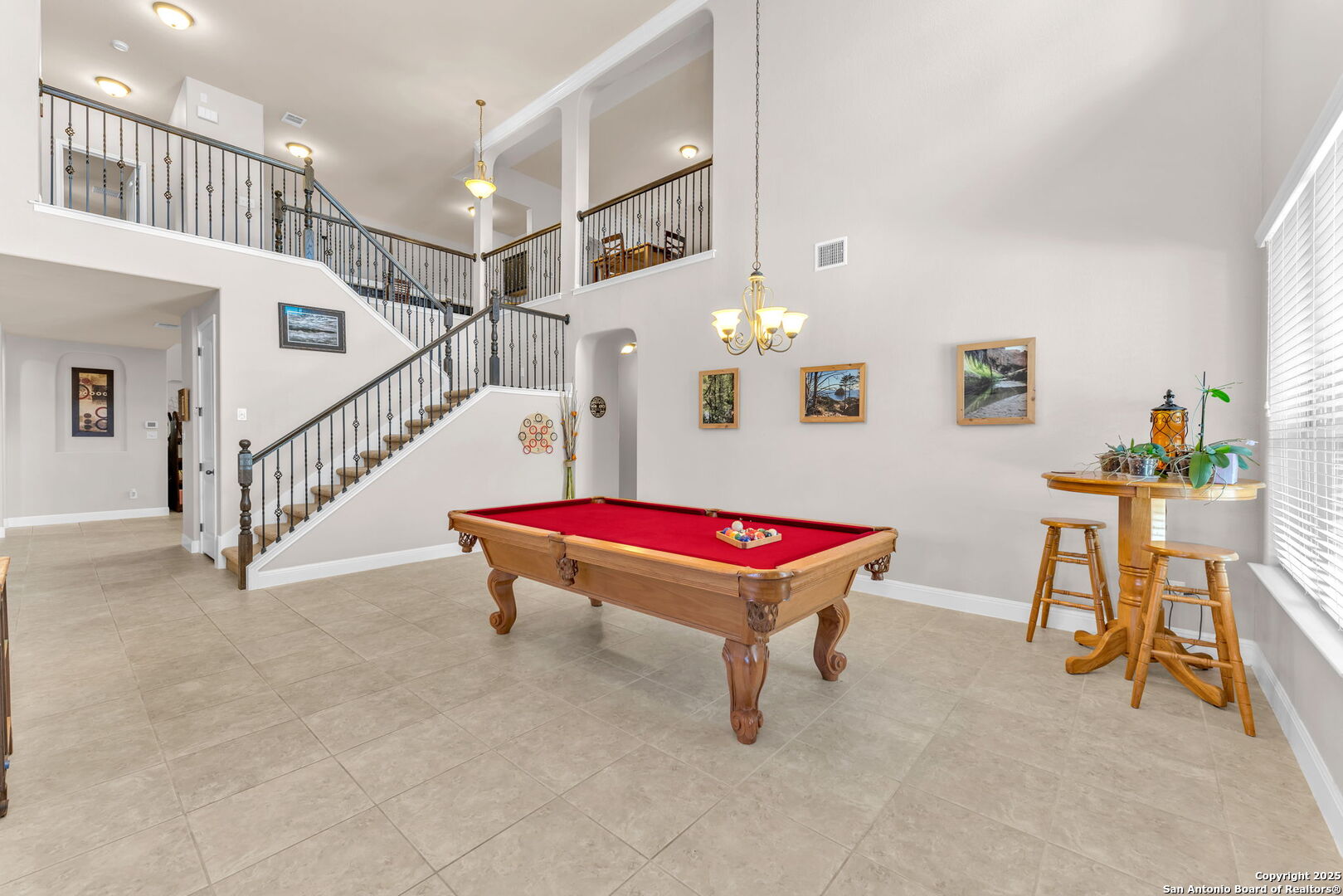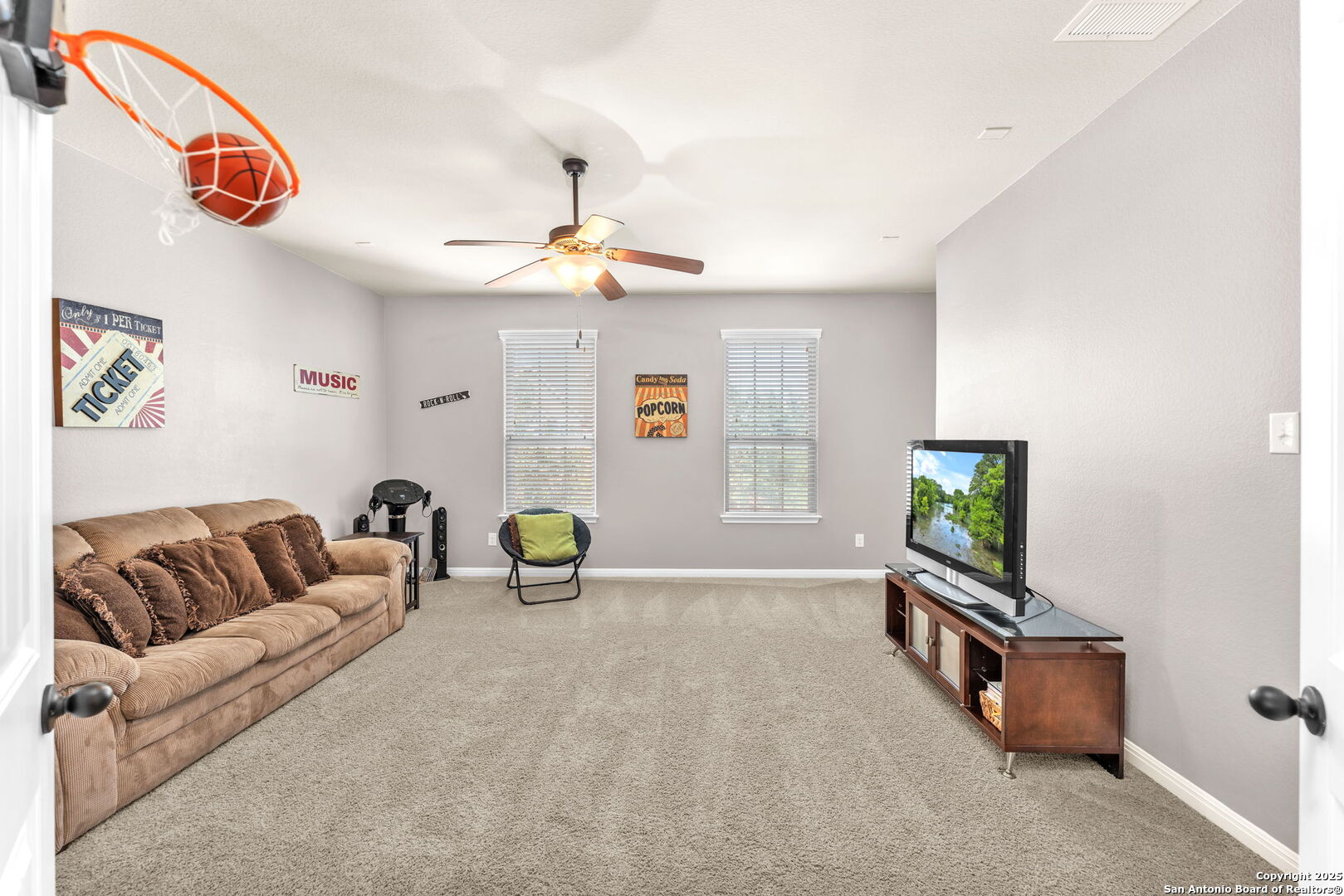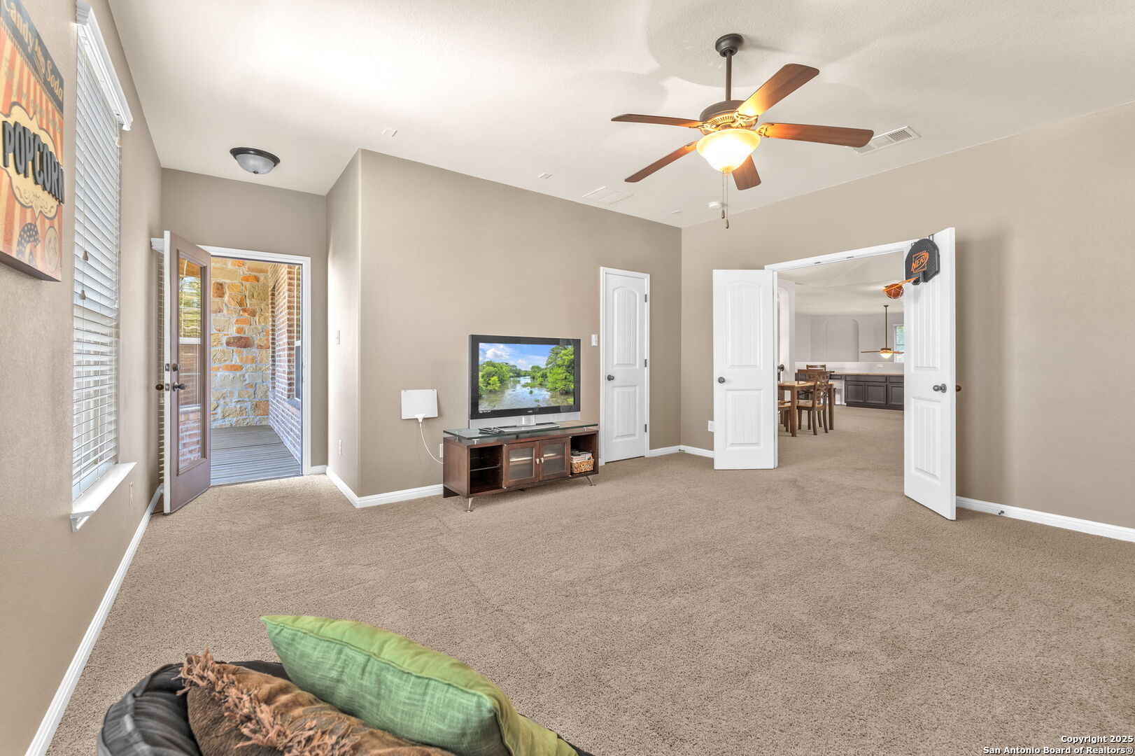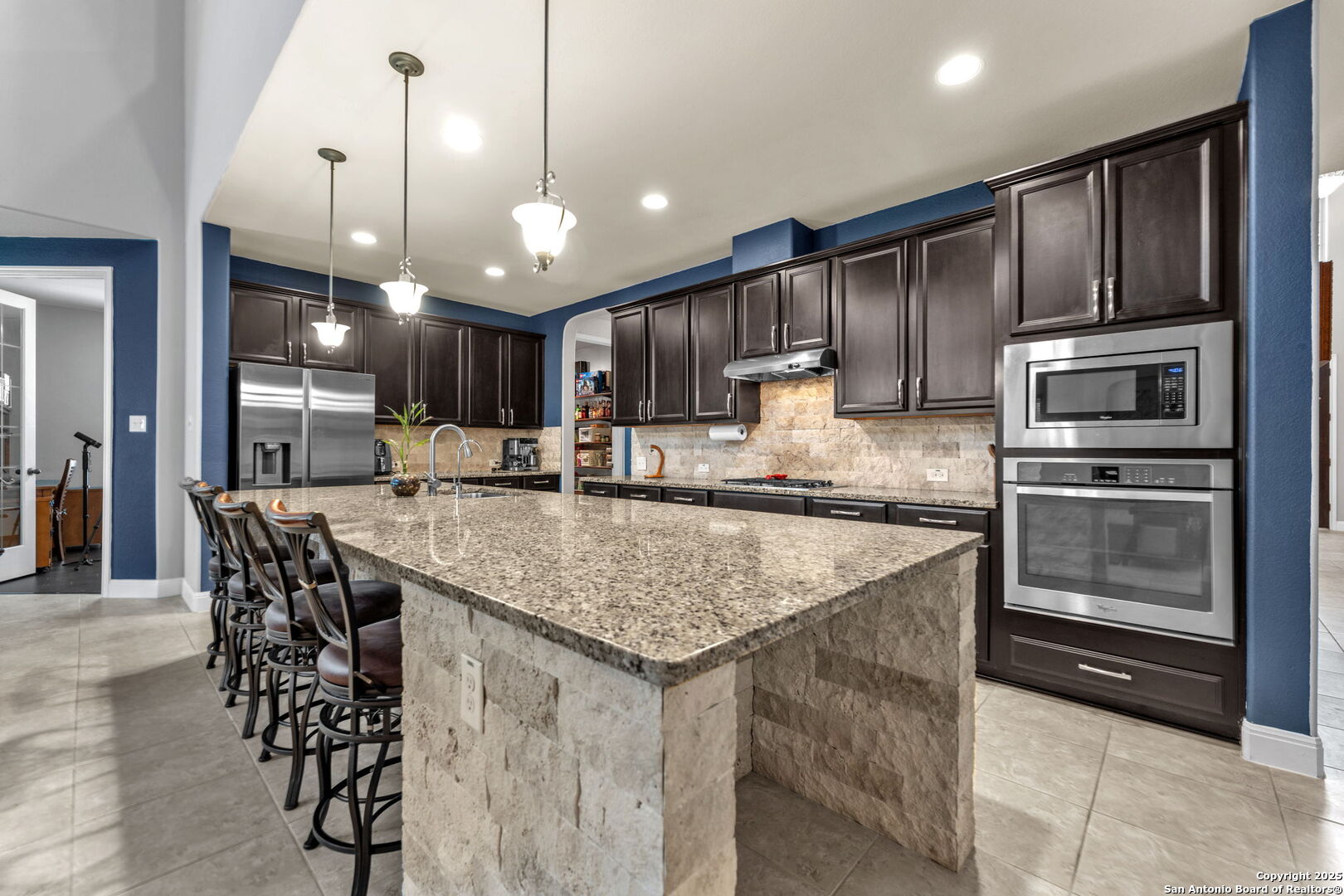 Spacious, Energy-Efficient Home in Comal ISD with Exceptional Features & Amenities! Welcome to this stunning 5-bedroom, 3.5-bathroom residence offering nearly 5000 sq ft of thoughtfully designed living space in one of the most desirable neighborhoods in Comal ISD. This energy-efficient home is packed with high-end features and offers the perfect balance of comfort, style, and functionality. Step inside to discover an expansive open-concept layout featuring a chef's kitchen with a large island, butler's pantry, extended coffee (or drink) bar, and an oversized walk-in pantry-ideal for both daily living and entertaining. The separate dedicated office with elegant glass doors and a main-level library/sitting room provide flexible spaces for work or relaxation. Upstairs, enjoy movie nights in the media room with a walkout balcony, or unwind in the game room (loft), fully equipped with basketball hoops, table hockey, and a pool table-all of which can remain with the home at the buyer's request. This energy-conscious home features solar panels, spray foam insulation, solar screens on rear-facing windows, and a large tankless hot water heater, providing long-term savings and year-round comfort...and a LOW energy bill! Outdoor living is made easy with a low-maintenance yard, and community amenities including a pool, splash pad, covered BBQ pavilion, and scenic walking trails. The home is conveniently located near top-rated public schools, popular restaurants, shopping centers, and offers quick access to Hwy 281 for easy commutes to local military bases and downtown San Antonio. This home has it all-space, efficiency, luxury, and location. Don't miss your chance to own this one-of-a-kind property. Schedule your private showing today!