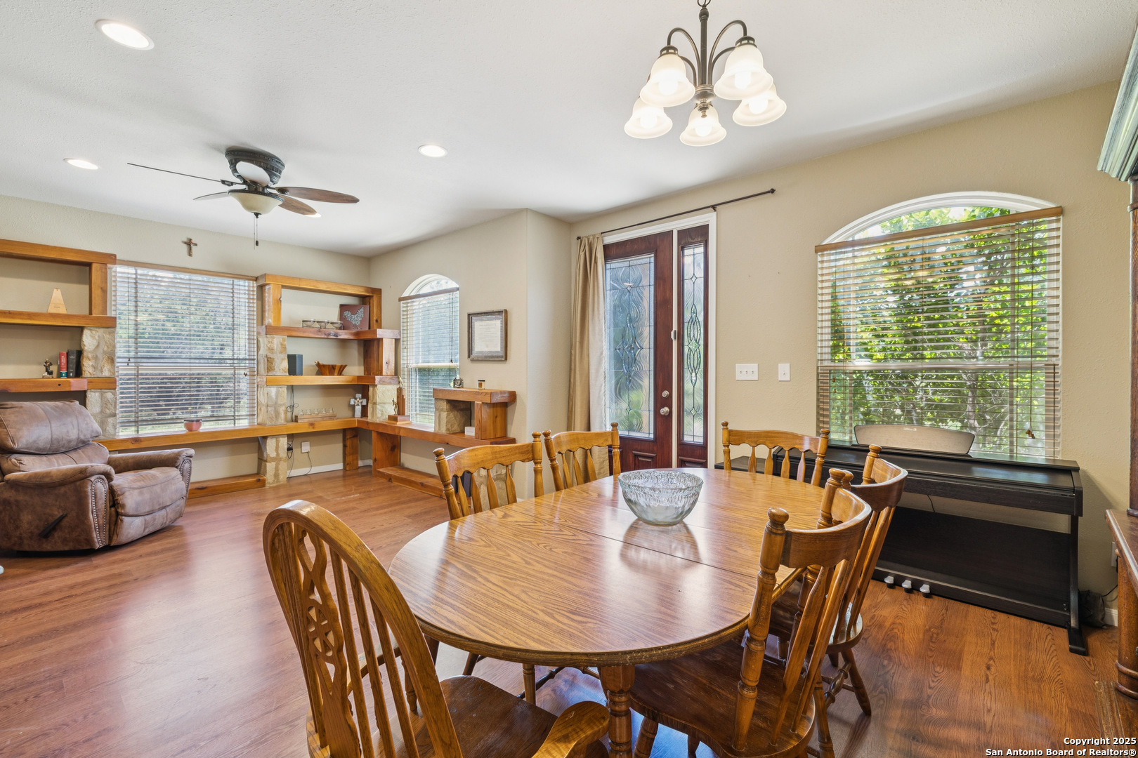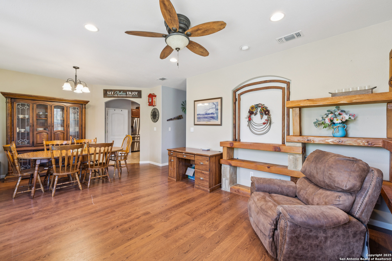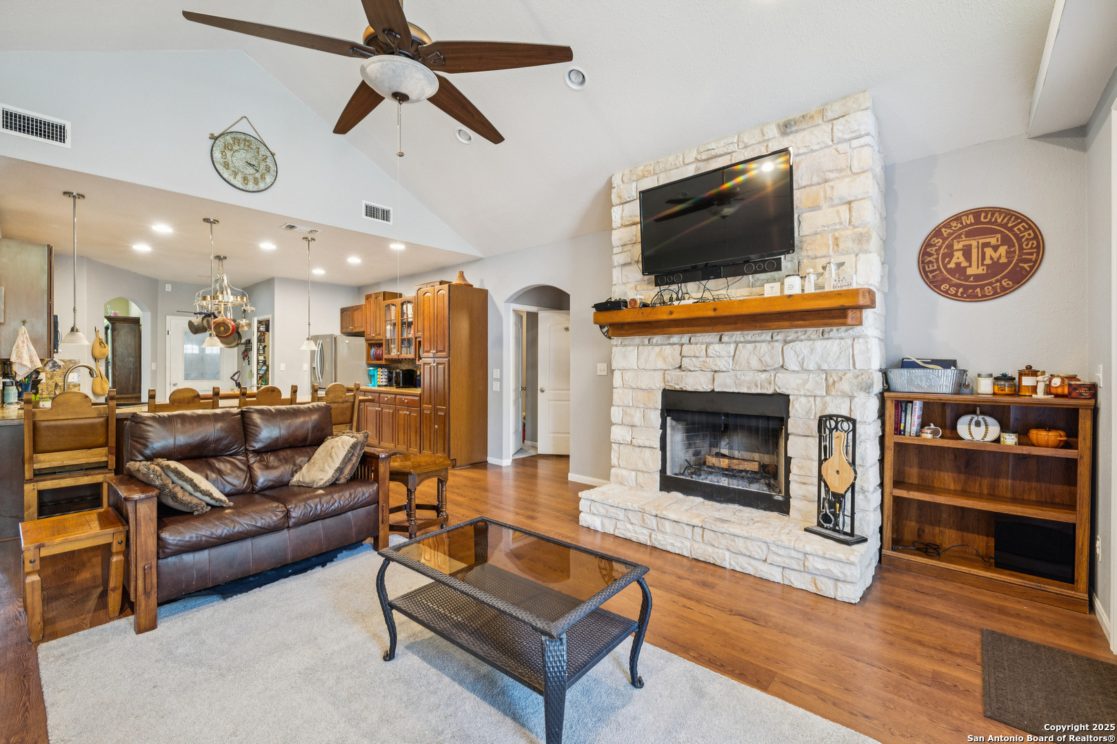 Welcome to your dream home nestled in the sought-after Flying L Ranch community! This beautifully maintained 3-bedroom, 2-bathroom residence offers a perfect blend of comfort and style. Step inside to find solid surface countertops in a spacious kitchen ideal for entertaining. Woodburning Fireplace. The primary suite features a massive walk-in closet, plus a luxurious en-suite bathroom with a separate tub and shower-perfect for relaxing after a long day. Enjoy outdoor living under a majestic oak canopy on the wooden deck, creating a peaceful retreat for morning coffee or evening gatherings. Don't miss your chance to live in this serene, well-established neighborhood with amenities and Hill Country charm.