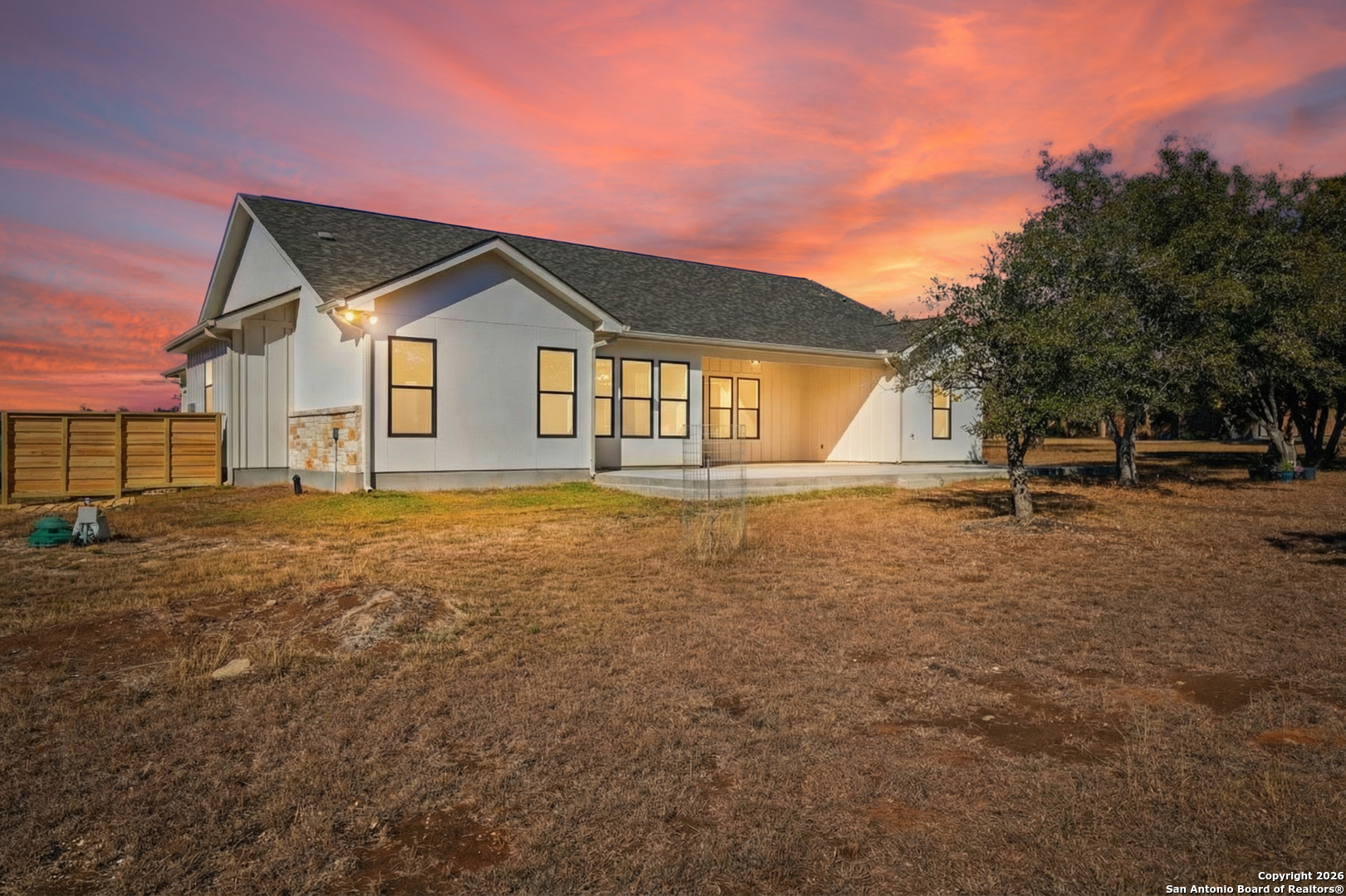 Located in the gated community of Cielo Rio Ranch in Pipe Creek, TX, this smart-built, custom Pillar Homes residence offers refined Hill Country living on 2 acres of usable land. The one-story layout features three bedrooms plus a dedicated office, ideal for flexible living and working from home. Designed with intention, the home includes Alexa-compatible smart lighting and automated blinds in the dining area, office, and bathroom, all easily controlled by voice or smartphone. The open-concept living space flows seamlessly into a modern kitchen anchored by a waterfall island and gas cooking-perfect for everyday living and entertaining. Beyond the interior, this home was custom-designed with future expansion in mind, featuring exterior electrical wiring, water plumbing, and gas connections, making it easy to add a gazebo or enhance the outdoor living space. A generator-ready outlet adds peace of mind during power outages. The primary suite offers a private retreat, while quality finishes and a water softener add comfort throughout. The home also benefits from a 10-year foundation warranty, along with existing plumbing and electrical warranties. Enjoy peaceful outdoor living with a covered patio, open land, and a private setting within a sought-after gated community-combining smart technology, thoughtful design, and Hill Country charm. Exclusions include playground equipment, BBQ, firepit, and security cameras.