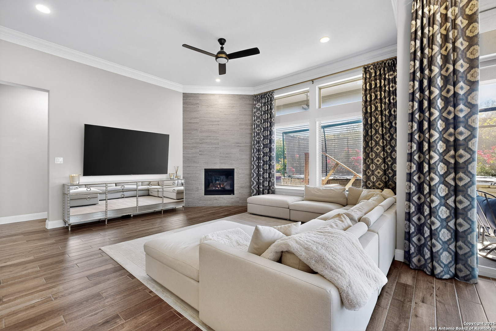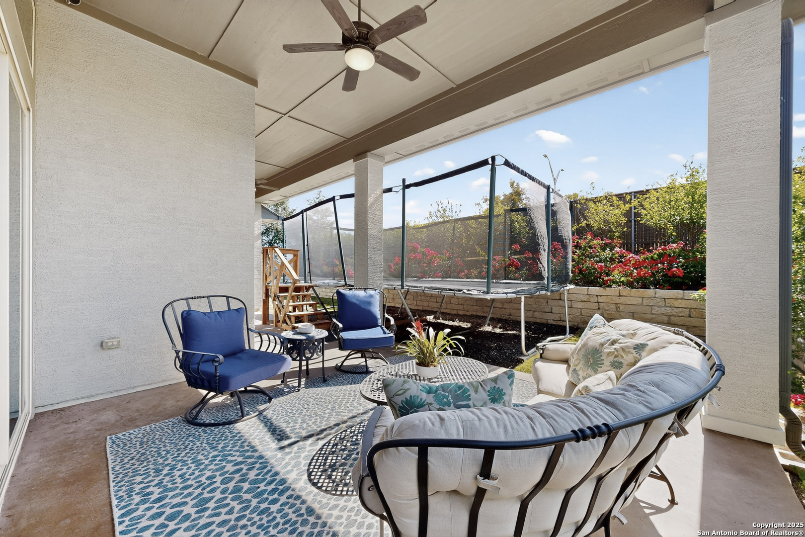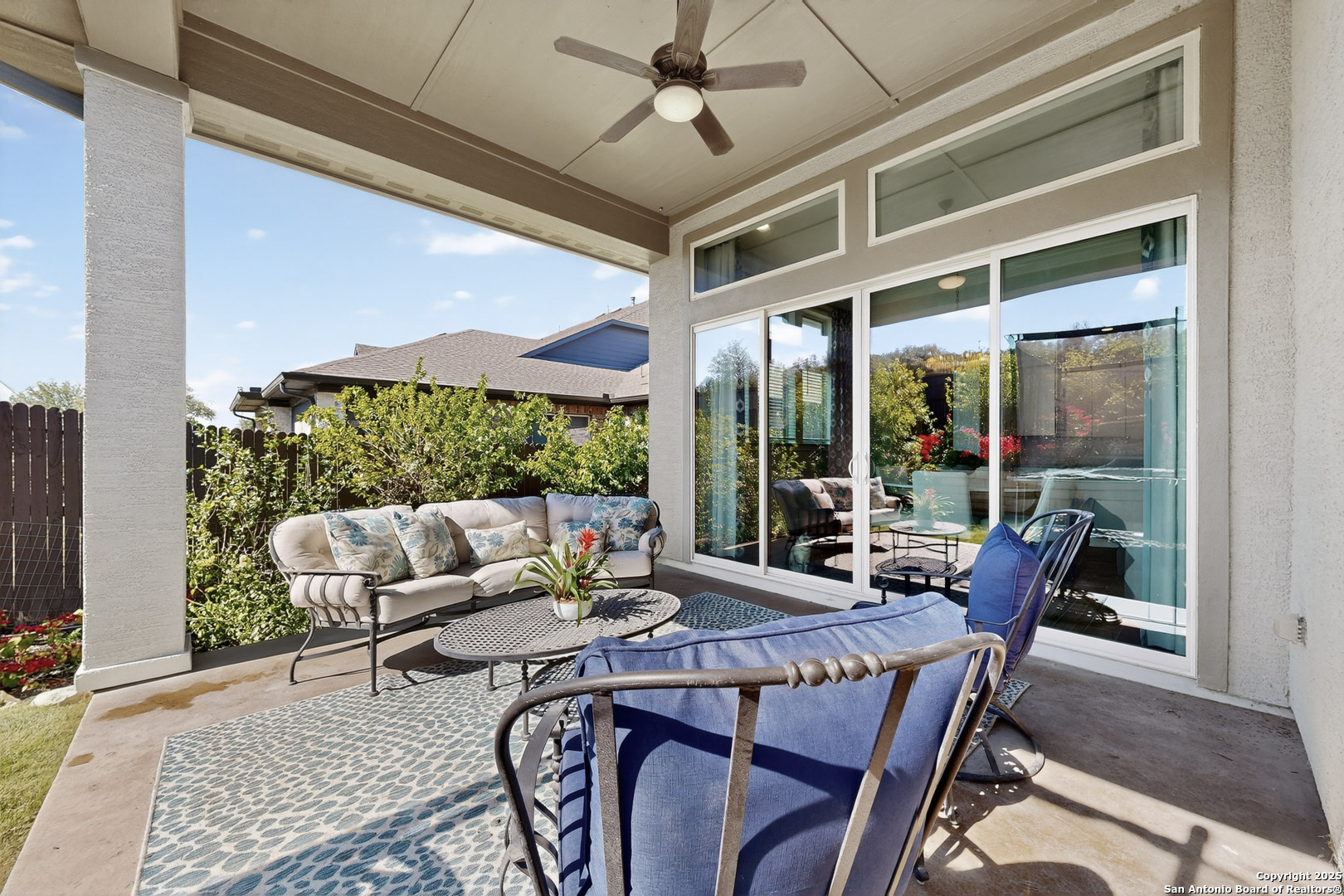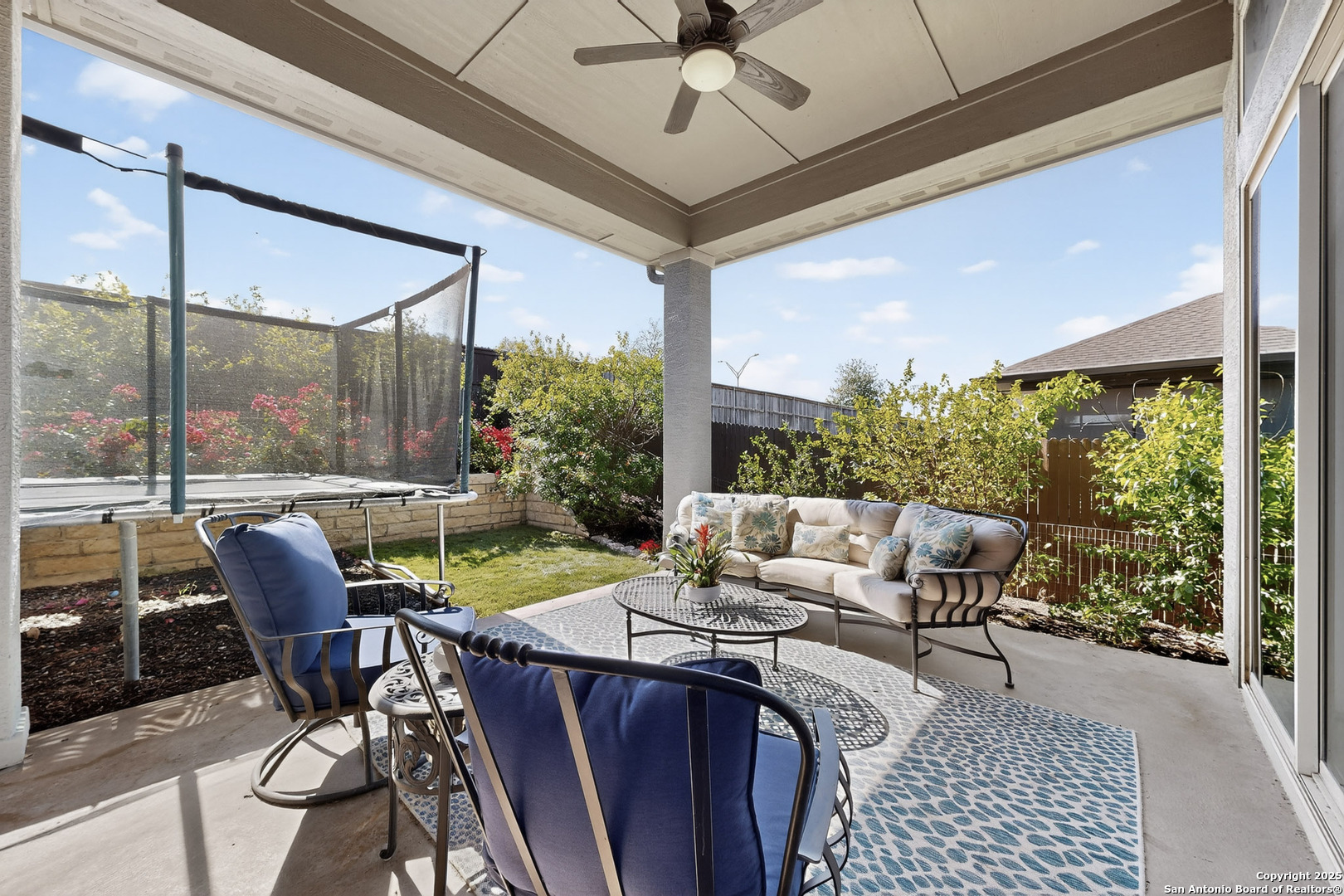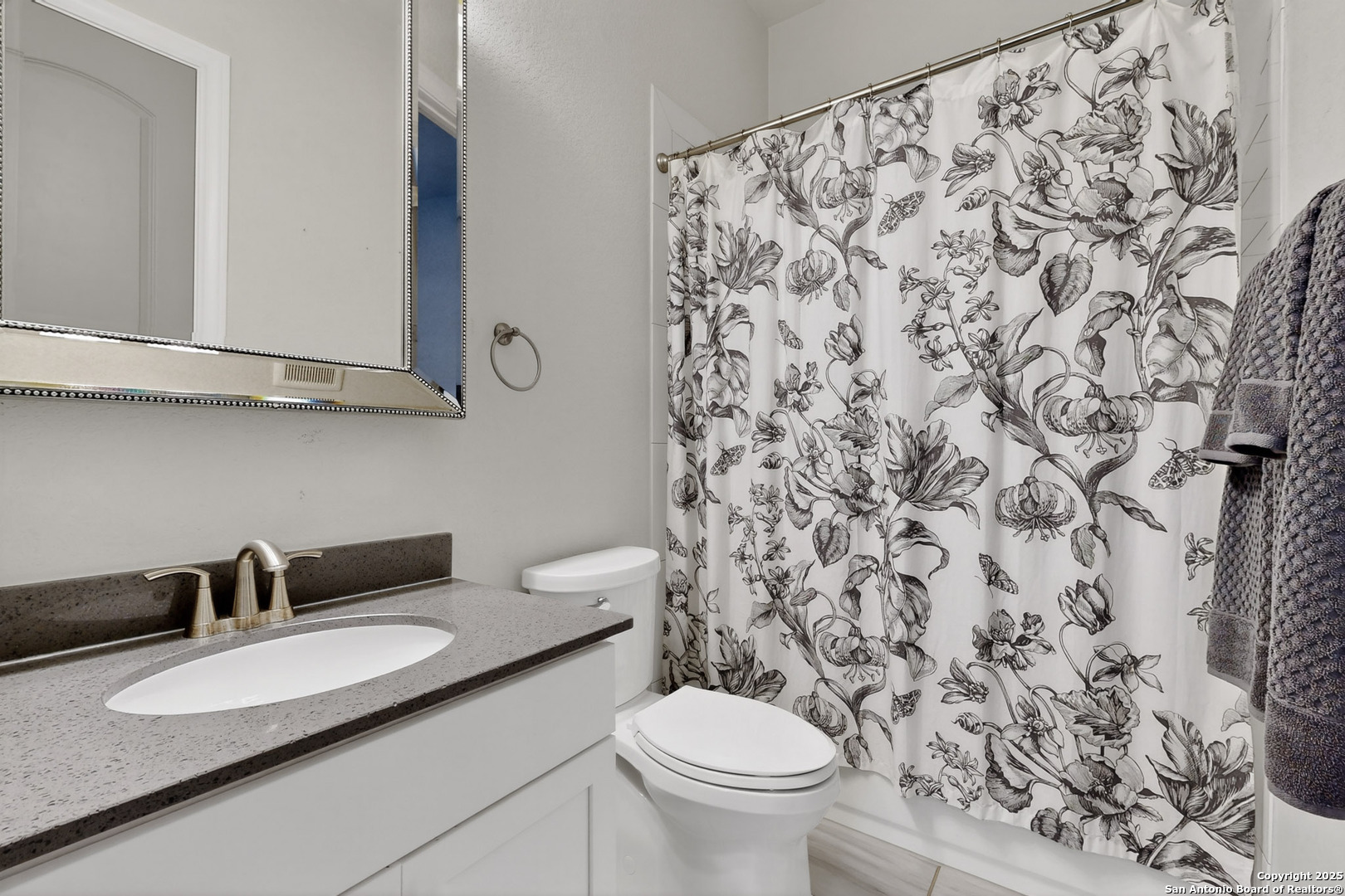 Is there a 4-bed home in Shavano Highlands with ensuite baths and office space? Yes! And this 2020 David Weekley home delivers it all in 3217 sqft. Single-story, stylish, and spacious, it offers comfort and flexibility for multigenerational living or hosting guests. Built with purpose, this one-story home includes four bedrooms, each with its own ensuite bath plus a powder room. A smart flex room connects two secondary suites, perfect for a playroom, media zone, or extra living space. The open layout flows from the stone-and-stucco exterior into light-filled common areas with high ceilings, wood floors, and an upgraded gas fireplace. The private study features built-in cabinetry for a polished work-from-home setup. The primary suite stuns with wood flooring and custom walk-in closets. Custom drapes elevate the living and dining rooms and stay with the home, along with the entry mirror and mirrors in the primary bedroom. Kitchen highlights include an island, walk-in pantry, and casual bar seating. Backyard trampoline to be removed, and yard will be freshly sodded before closing. Cornerstone Christian is walkable, and Blattman Elementary is in the acclaimed Northside ISD. With controlled neighborhood access and scenic trails, Shavano Highlands offers rare privacy just north of 1604 near shopping and dining. Garage fits two cars. Fridge negotiable. HOA $1,160/year. Taxes: $18,059.67.