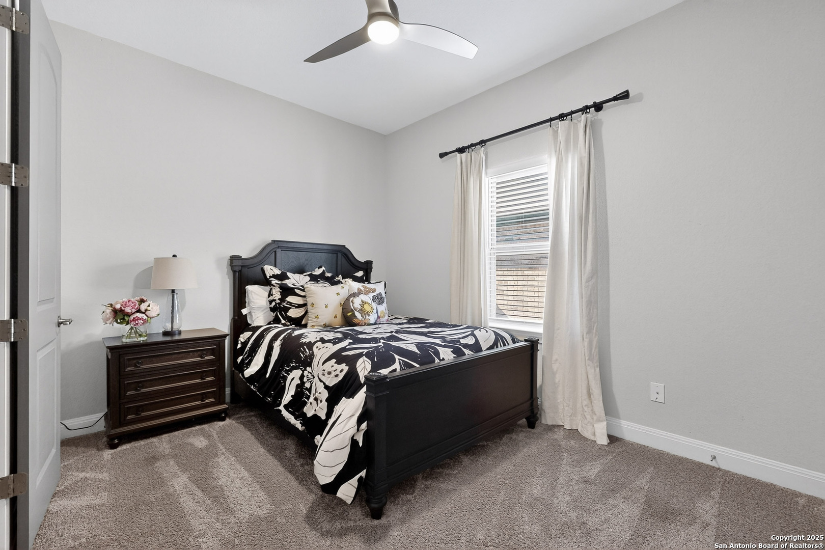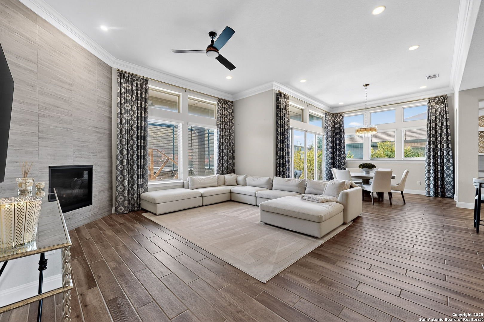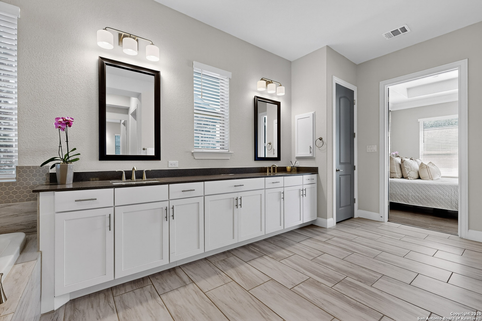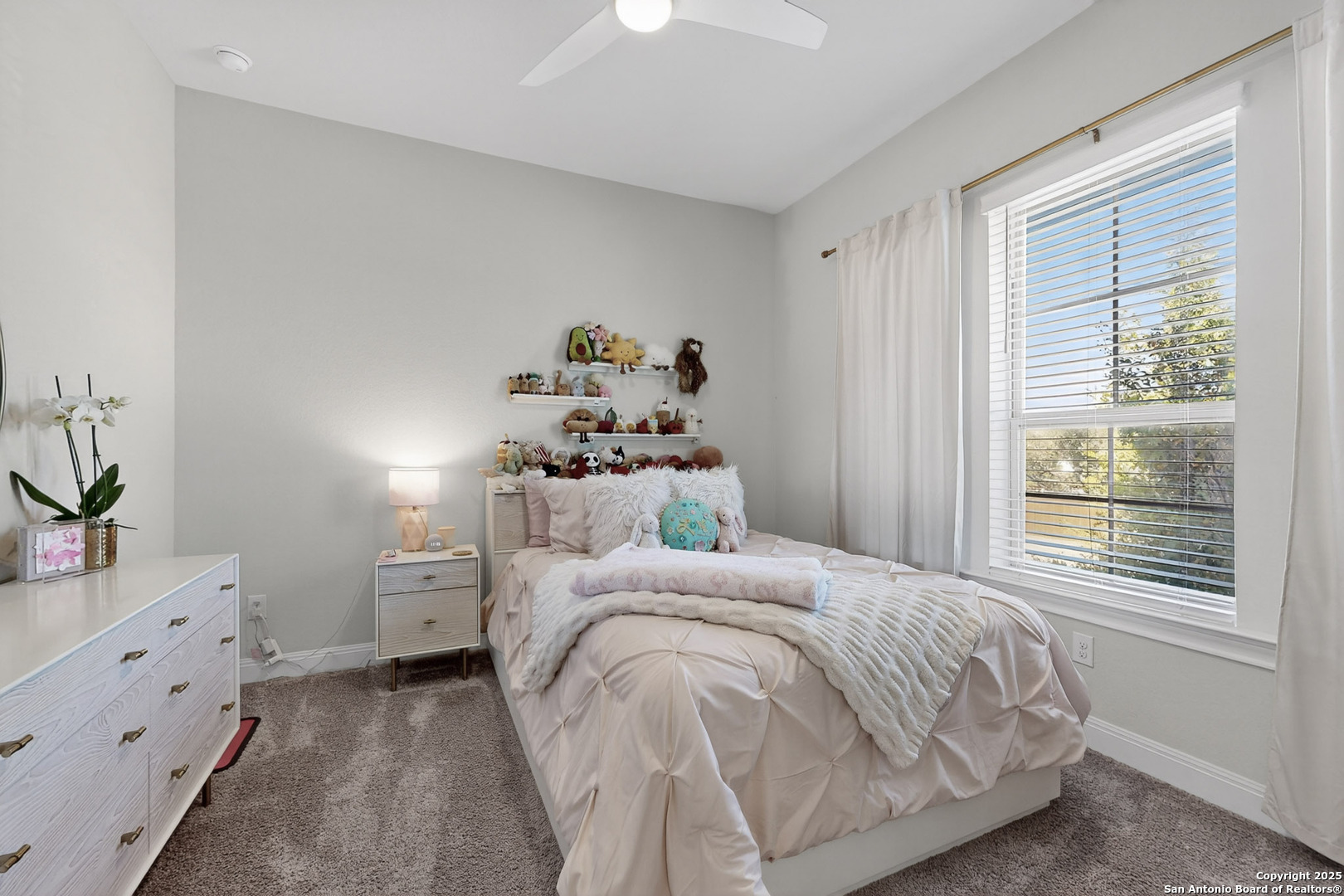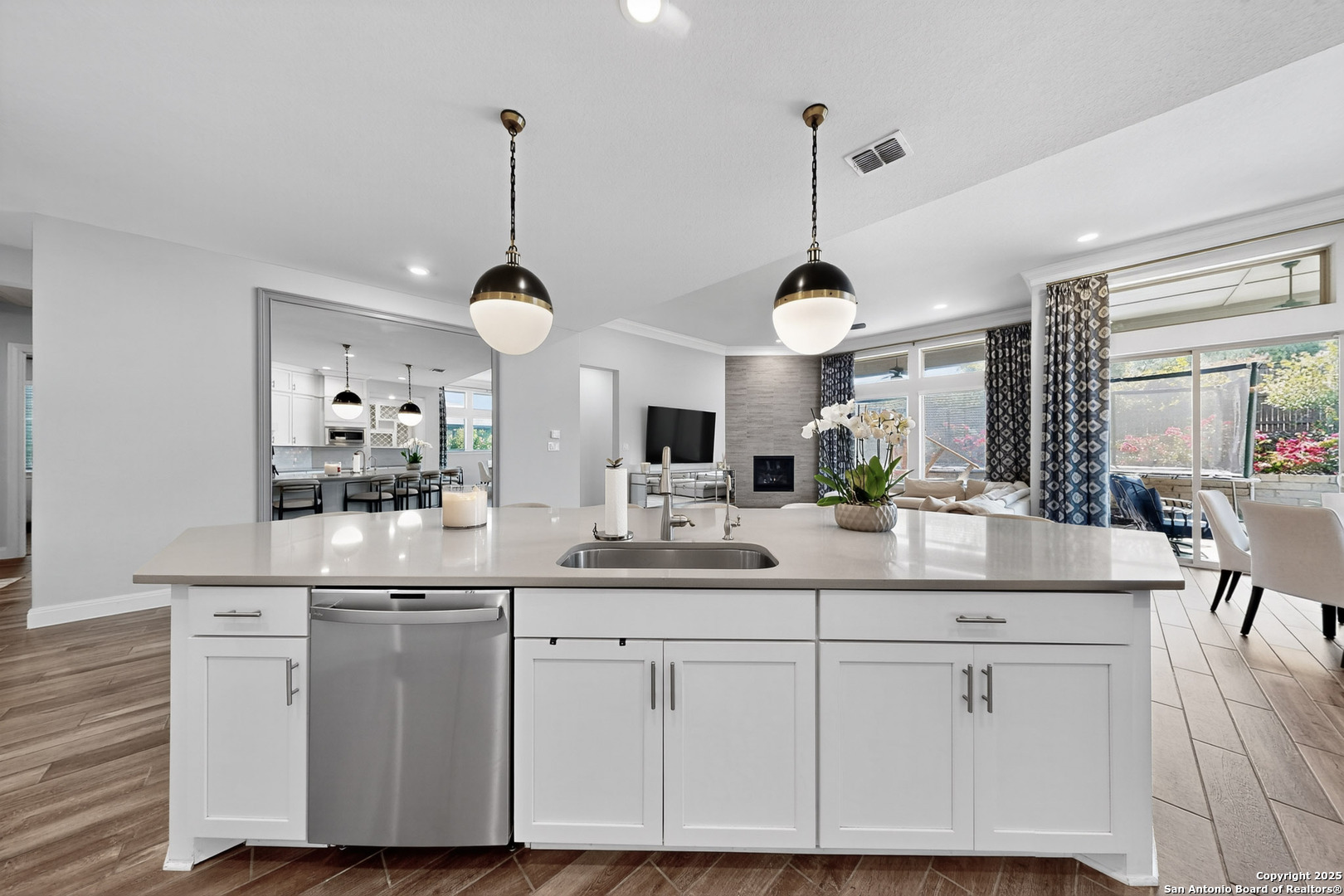 Is there a 4-bed home in Shavano Highlands with ensuite baths and office space? Yes! And this 2020 David Weekley home delivers it all in 3217 sqft. Single-story, stylish, and spacious, it offers comfort and flexibility for multigenerational living or hosting guests. Built with purpose, this one-story home includes four bedrooms, each with its own ensuite bath plus a powder room. A smart flex room connects two secondary suites, perfect for a playroom, media zone, or extra living space. The open layout flows from the stone-and-stucco exterior into light-filled common areas with high ceilings, wood floors, and an upgraded gas fireplace. The private study features built-in cabinetry for a polished work-from-home setup. The primary suite stuns with wood flooring and custom walk-in closets. Custom drapes elevate the living and dining rooms and stay with the home, along with the entry mirror and mirrors in the primary bedroom. Kitchen highlights include an island, walk-in pantry, and casual bar seating. Backyard trampoline to be removed, and yard will be freshly sodded before closing. Cornerstone Christian is walkable, and Blattman Elementary is in the acclaimed Northside ISD. With controlled neighborhood access and scenic trails, Shavano Highlands offers rare privacy just north of 1604 near shopping and dining. Garage fits two cars. Fridge negotiable. HOA $1,160/year. Taxes: $18,059.67.