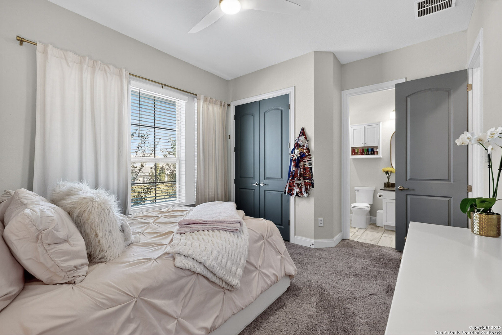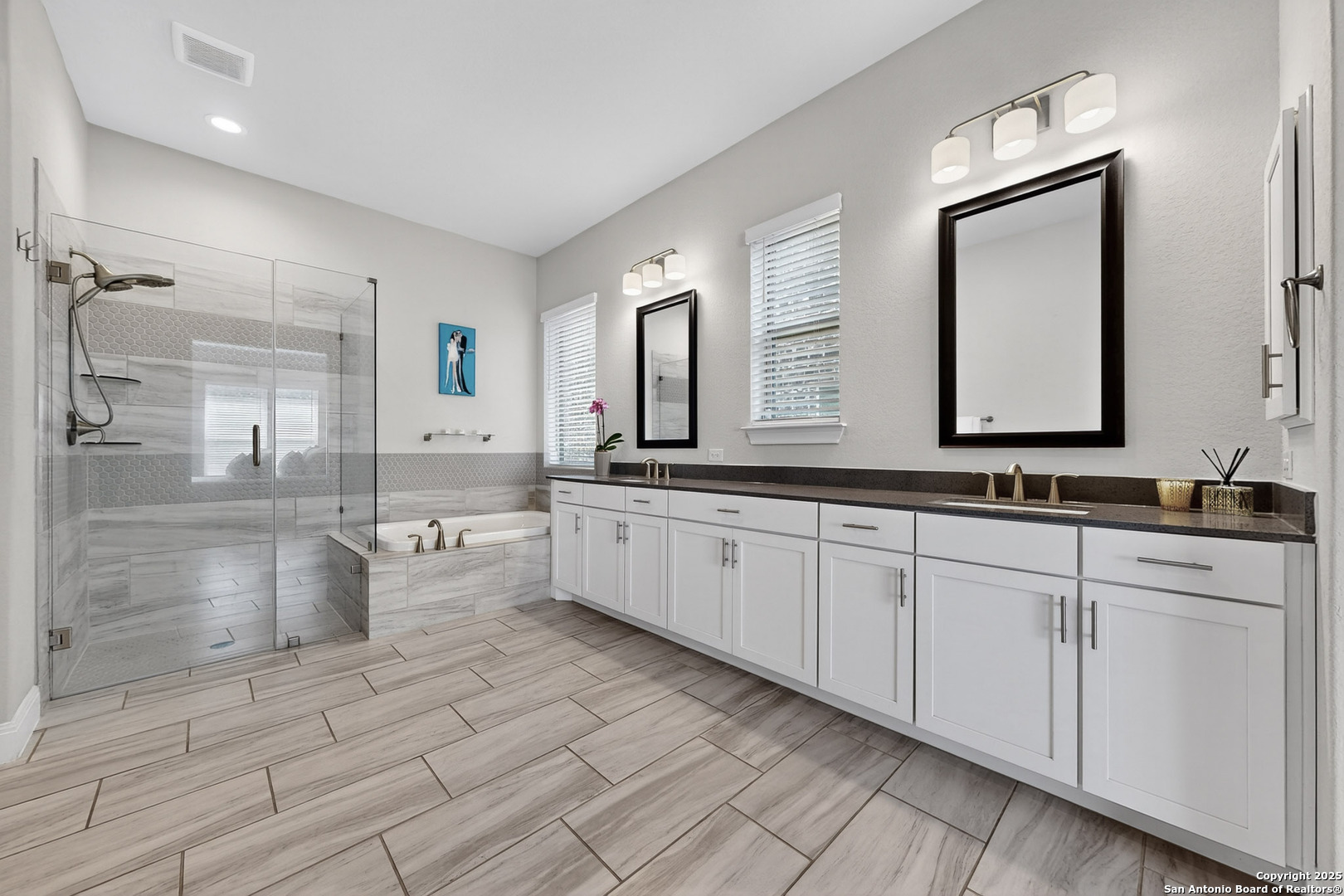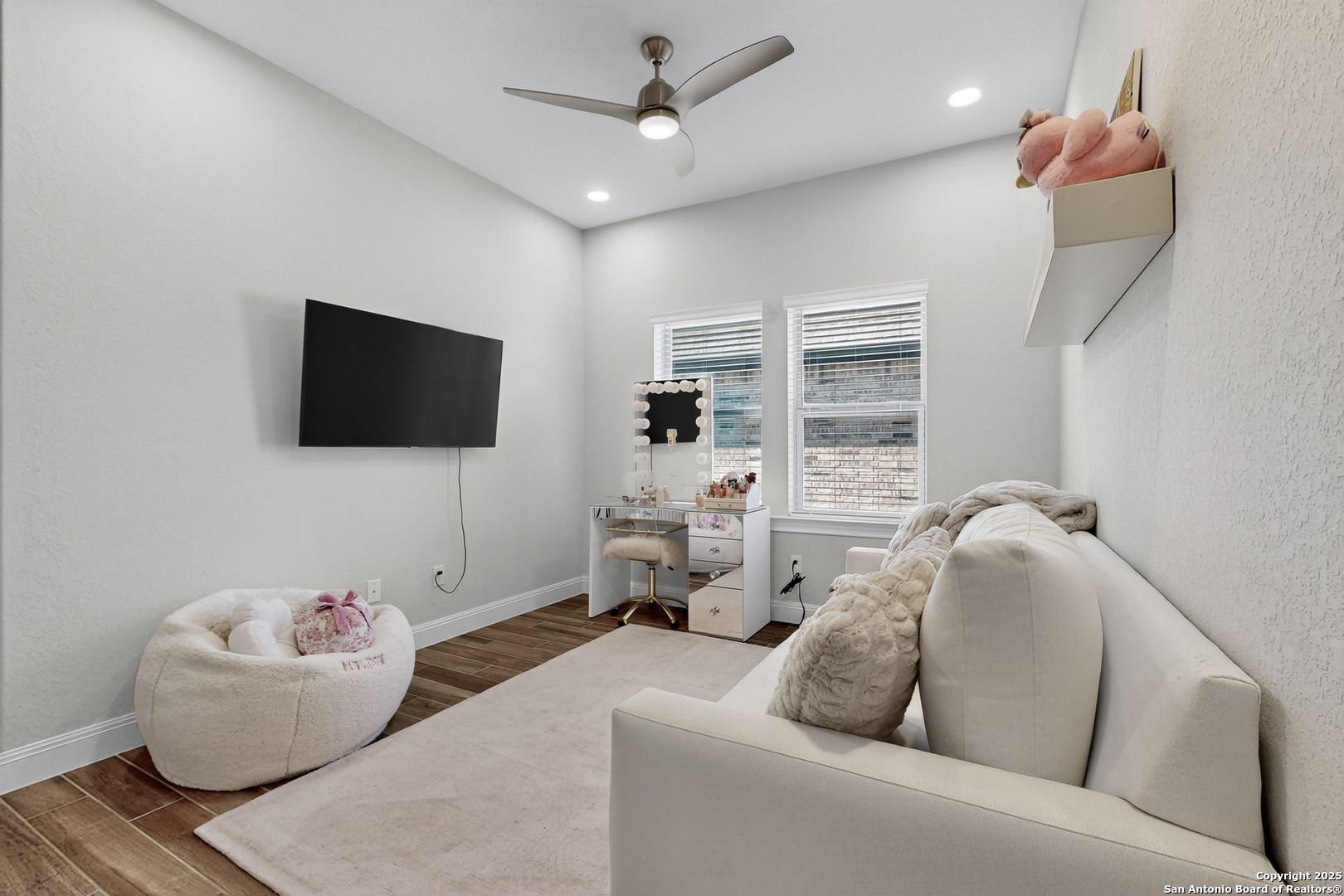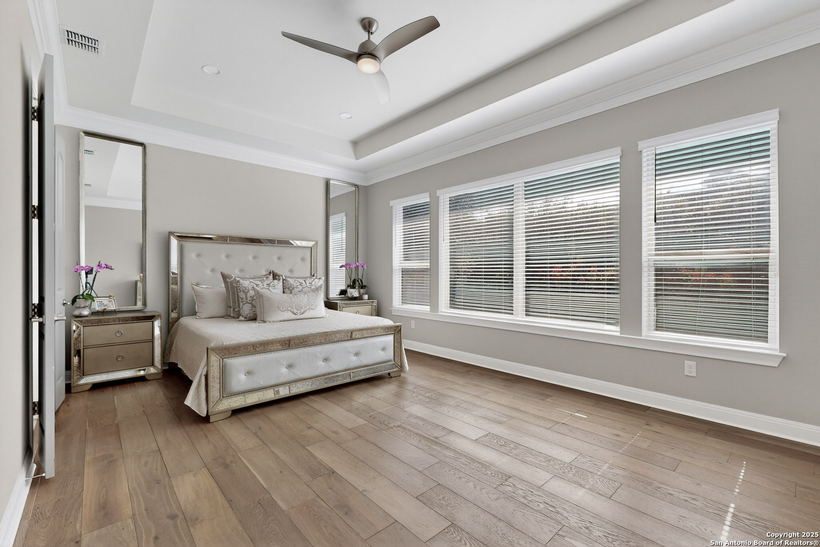Is there a 4-bed home in Shavano Highlands with ensuite baths and office space? Yes! And this 2020 David Weekley home delivers it all in 3217 sqft. Single-story, stylish, and spacious, it offers comfort and flexibility for multigenerational living or hosting guests. Built with purpose, this one-story home includes four bedrooms, each with its own ensuite bath plus a powder room. A smart flex room connects two secondary suites, perfect for a playroom, media zone, or extra living space. The open layout flows from the stone-and-stucco exterior into light-filled common areas with high ceilings, wood floors, and an upgraded gas fireplace. The private study features built-in cabinetry for a polished work-from-home setup. The primary suite stuns with wood flooring and custom walk-in closets. Custom drapes elevate the living and dining rooms and stay with the home, along with the entry mirror and mirrors in the primary bedroom. Kitchen highlights include an island, walk-in pantry, and casual bar seating. Backyard trampoline to be removed, and yard will be freshly sodded before closing. Cornerstone Christian is walkable, and Blattman Elementary is in the acclaimed Northside ISD. With controlled neighborhood access and scenic trails, Shavano Highlands offers rare privacy just north of 1604 near shopping and dining. Garage fits two cars. Fridge negotiable. HOA $1,160/year. Taxes: $18,059.67.