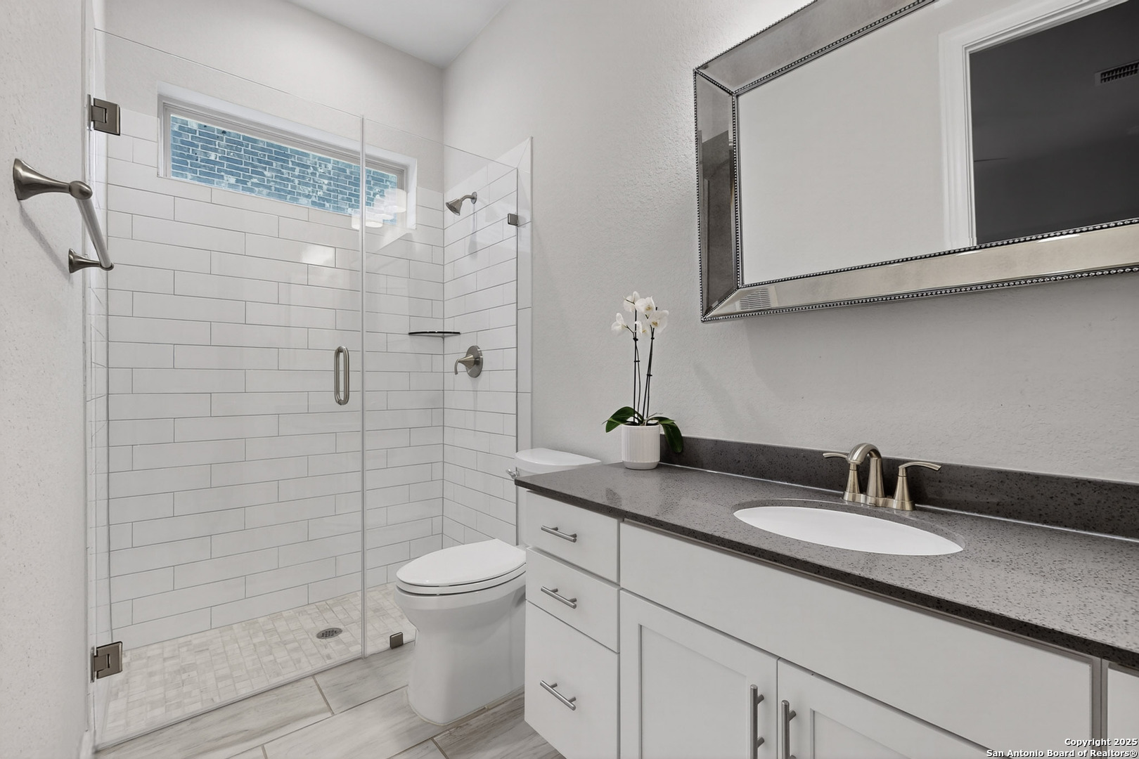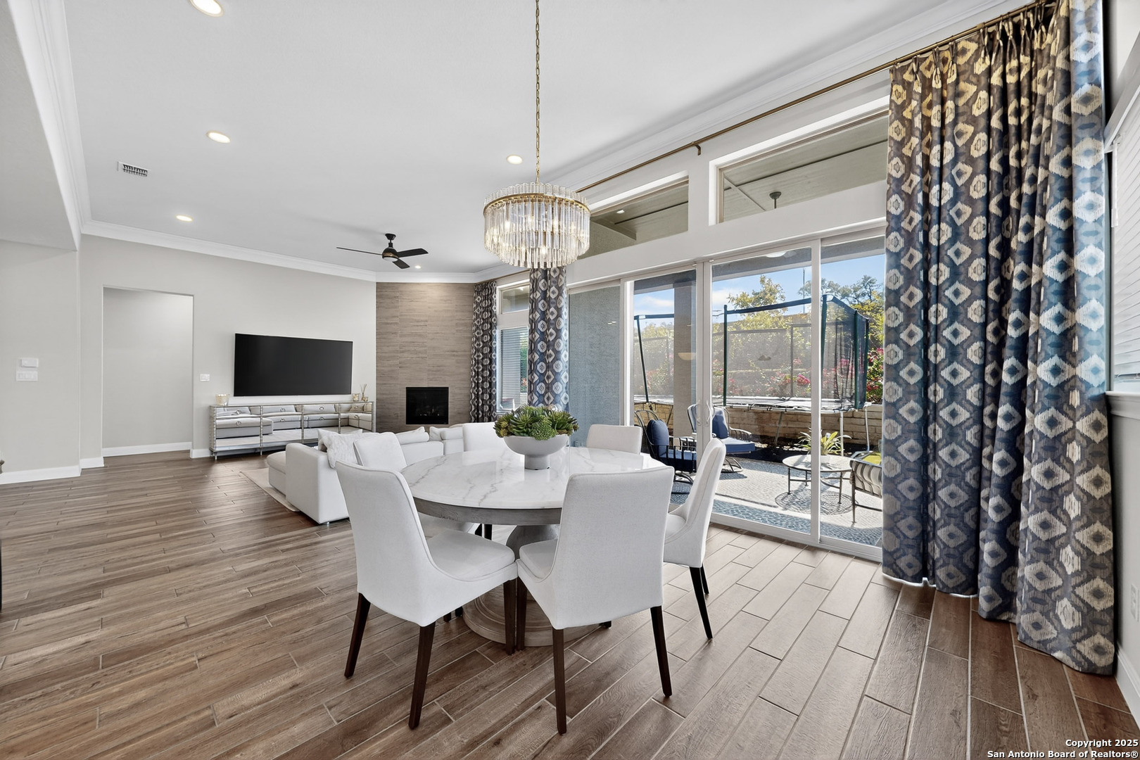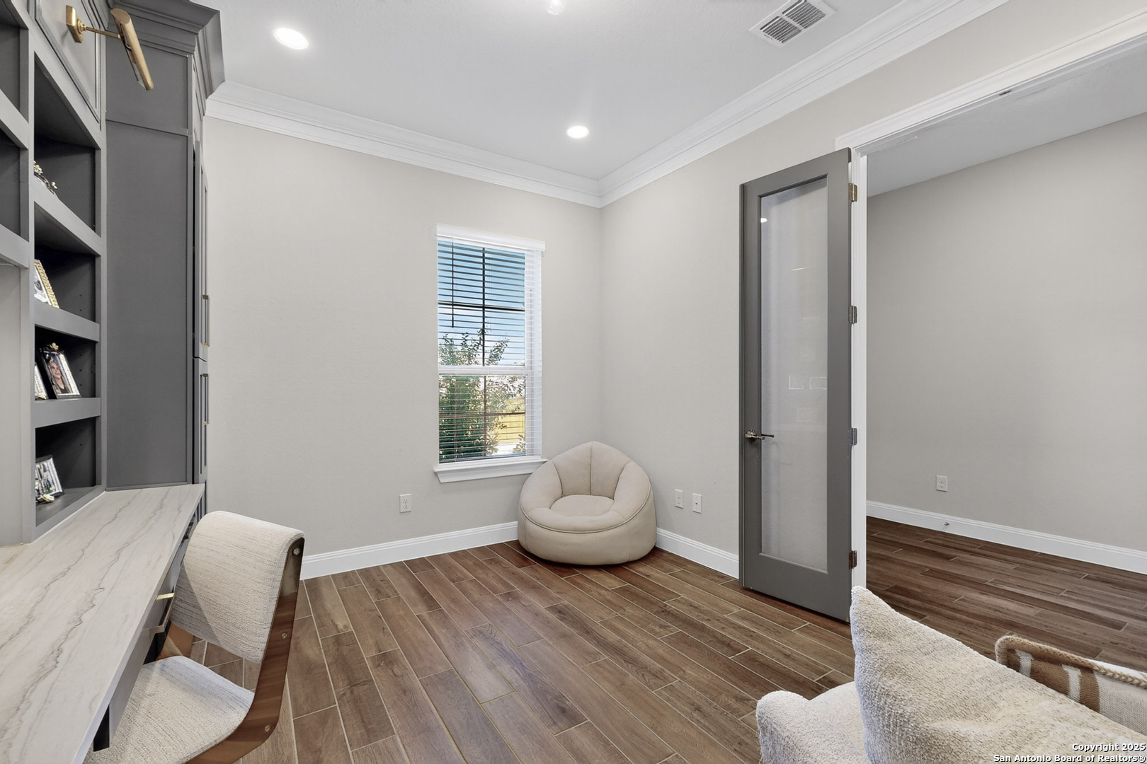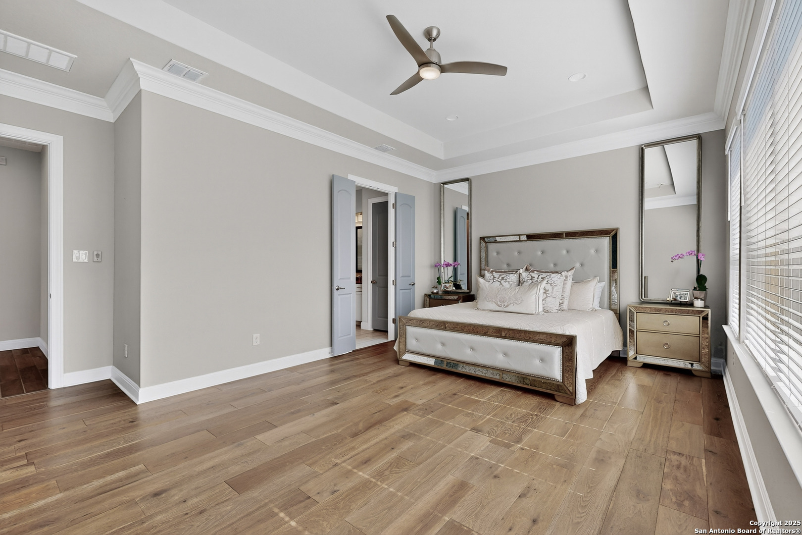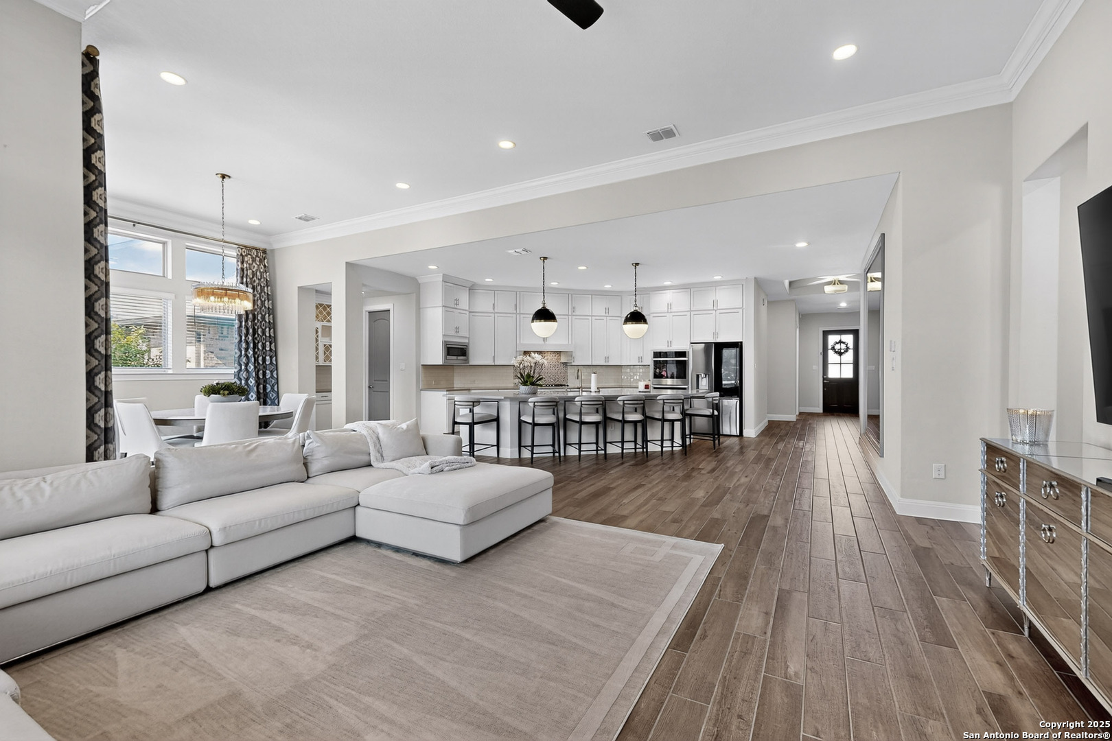 Is there a 4-bed home in Shavano Highlands with ensuite baths and office space? Yes! And this 2020 David Weekley home delivers it all in 3217 sqft. Single-story, stylish, and spacious, it offers comfort and flexibility for multigenerational living or hosting guests. Built with purpose, this one-story home includes four bedrooms, each with its own ensuite bath plus a powder room. A smart flex room connects two secondary suites, perfect for a playroom, media zone, or extra living space. The open layout flows from the stone-and-stucco exterior into light-filled common areas with high ceilings, wood floors, and an upgraded gas fireplace. The private study features built-in cabinetry for a polished work-from-home setup. The primary suite stuns with wood flooring and custom walk-in closets. Custom drapes elevate the living and dining rooms and stay with the home, along with the entry mirror and mirrors in the primary bedroom. Kitchen highlights include an island, walk-in pantry, and casual bar seating. Backyard trampoline to be removed, and yard will be freshly sodded before closing. Cornerstone Christian is walkable, and Blattman Elementary is in the acclaimed Northside ISD. With controlled neighborhood access and scenic trails, Shavano Highlands offers rare privacy just north of 1604 near shopping and dining. Garage fits two cars. Fridge negotiable. HOA $1,160/year. Taxes: $18,059.67.