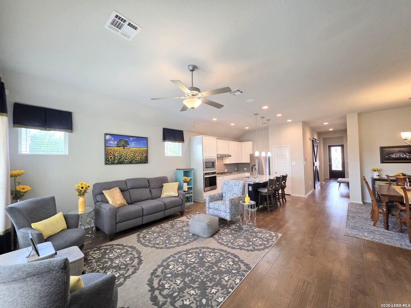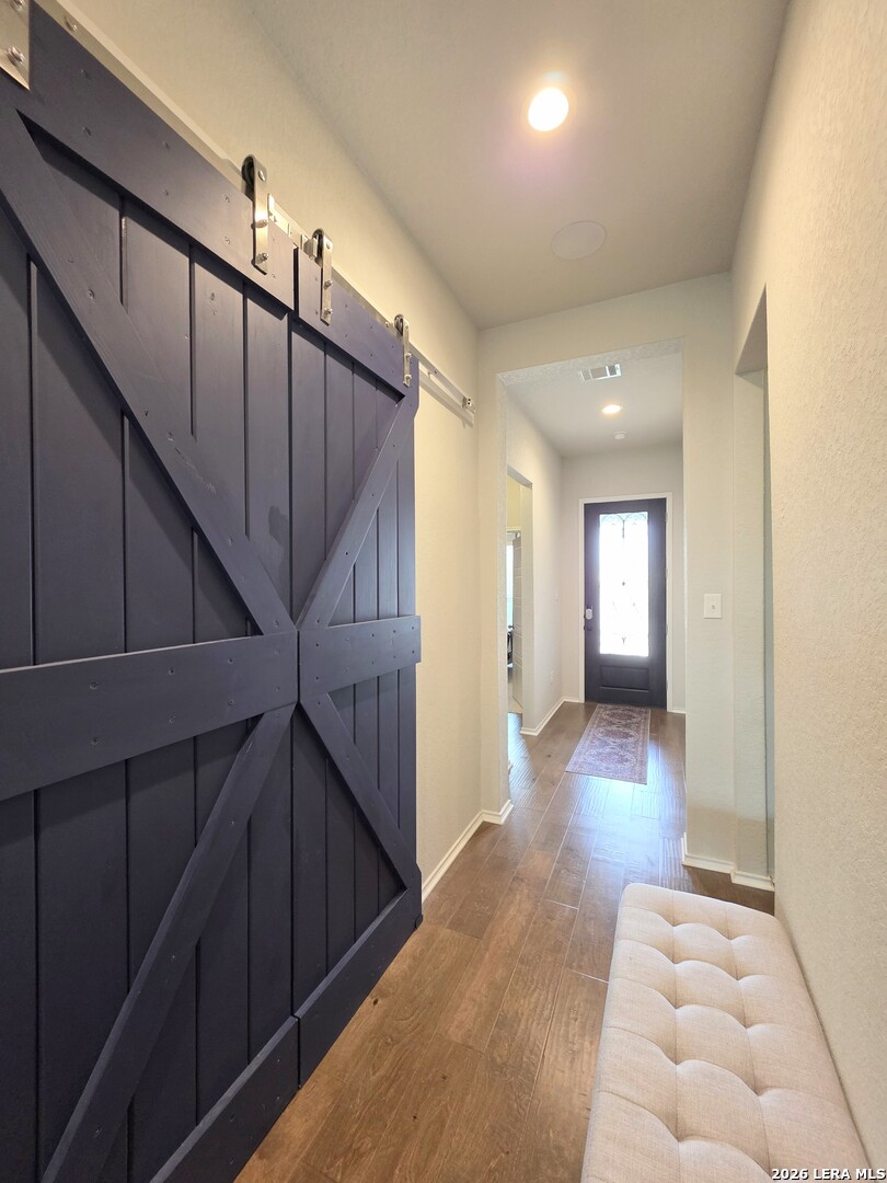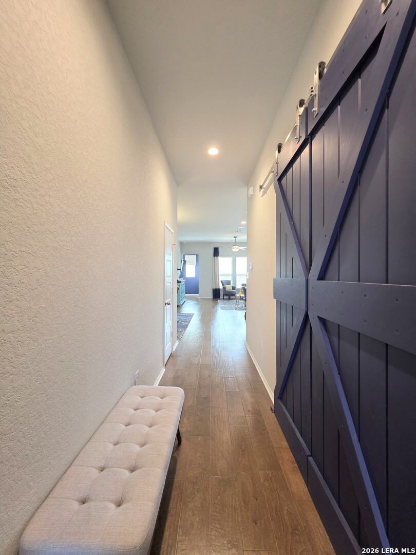 Walking distance to NBISD's newest High School (Go Dragons!), the local Middle & Elementary schools & the NEW Zipp Family Sports Park in this BOOMing part of New Braunfels, this Coventry Model Home (2019-2023) is full of a special mix of features & upgrades like no other. From the professionally landscaped & irrigated front & back yards on this large corner lot along a greenbelt, to the custom rain glass w/decorative iron front door, there is even more to impress inside, like the sliding Barn Doors to the Office/4th bedroom, the Knotty Pine accent wall in the 2nd bedroom, the handscraped hardwood floors throughout, the luxury carpet in the bedrooms, the designer draperies, the glass subway tilework in the kitchen, the gas countertop range w/ chef's quality vent, the full set of sleek stainless kitchen appliances, the popping granite countertops. the slatted accent wall in the Owner's suite, the painted accent walls in the dining room & laundry room, the Kinetico water softener system, the extra bump-out garage for enhanced storage space & more! Do not miss out on this special luxury model home! Don't Delay! Schedule your exclusive showing today!