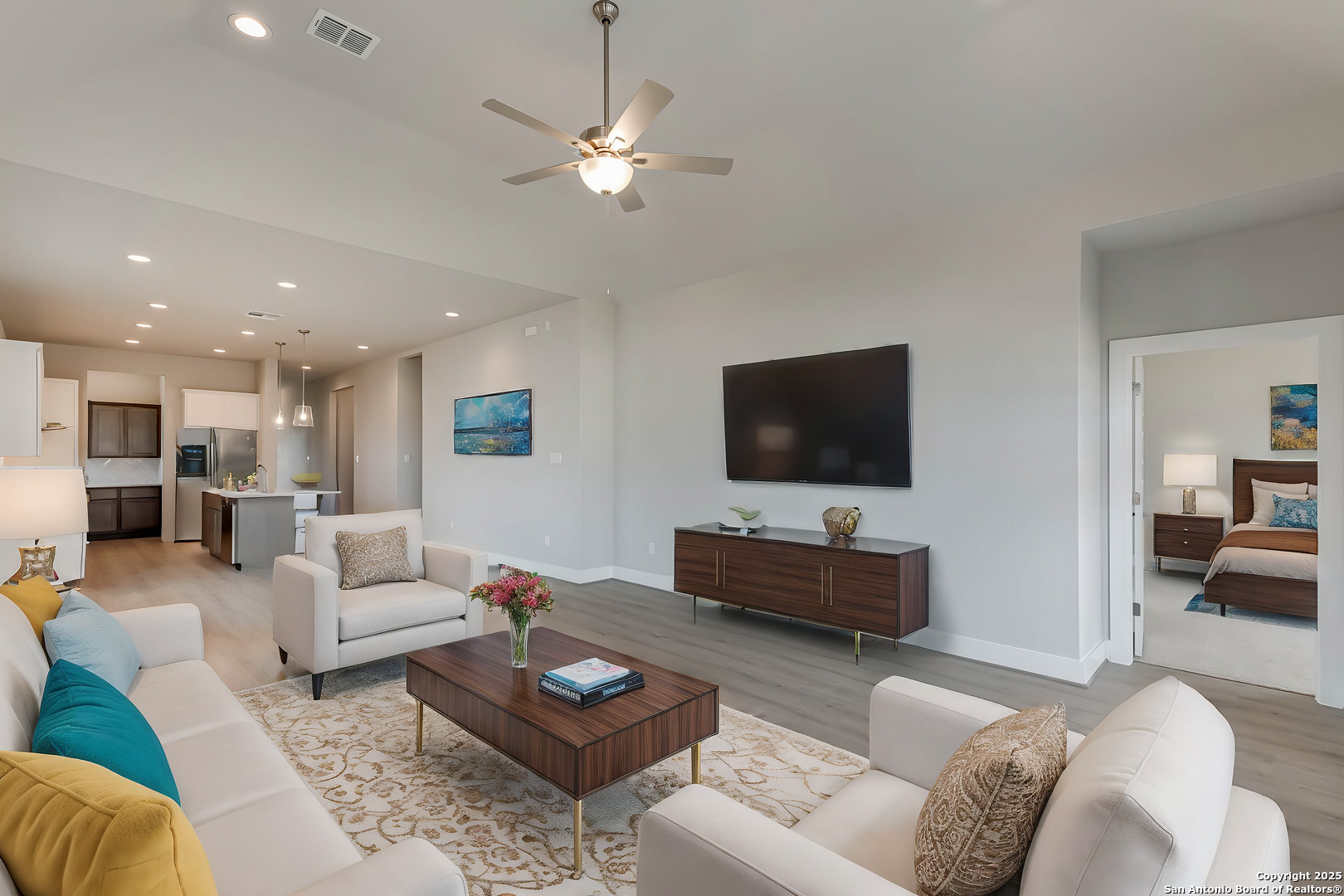 Nestled in the highly sought-after Cibolo Canyons community, this stunning single-story home blends modern design with thoughtful functionality. With 1,964 sq. ft. of well-planned living space, this 3-bedroom, 2-bathroom home is perfect for families or those looking to downsize. The open-concept floor plan features a dedicated study, a mud bench for added convenience, and a morning kitchen/coffee bar for your daily routine. The gourmet kitchen impresses with quartz countertops, custom cabinetry, under-counter lighting, and a large island with a built-in recycling center, plus two spacious walk-in pantries. The primary suite offers a serene escape, finished with a bay window and a luxurious ensuite bathroom with dual vanities, a walk-in shower, and a generous linen closet. High-end finishes, including upgraded wood flooring and tile, create a sophisticated ambiance throughout the home. Step outside to enjoy a fully sodded front and back yard, enclosed by a 6-foot privacy fence, and enhanced by a professional landscape package. The in-ground, programmable irrigation system ensures easy maintenance year-round. Located in Cibolo Canyons, this home offers the perfect balance of comfort, luxury, and convenience.