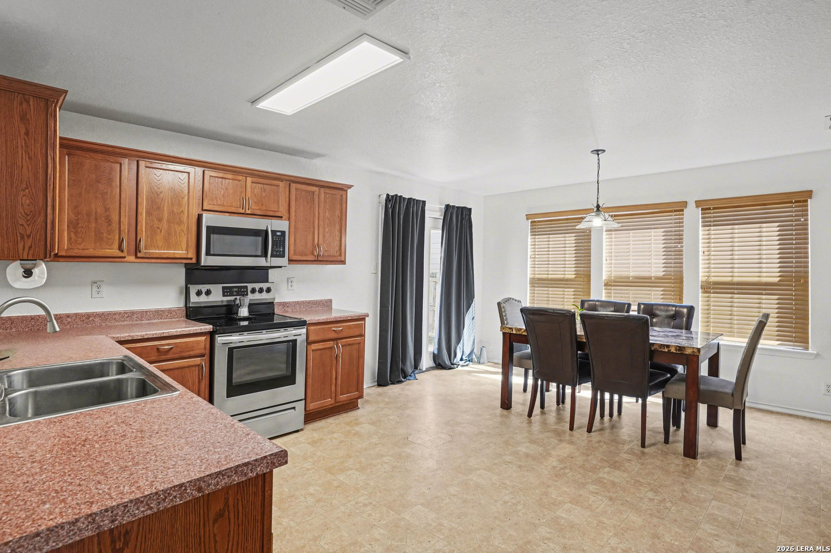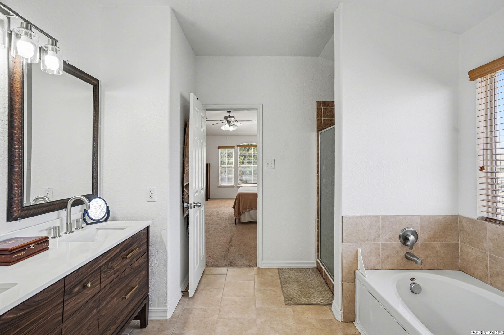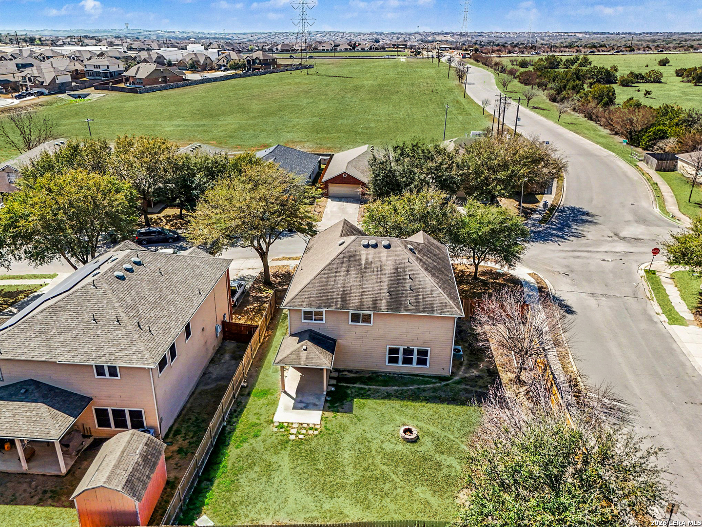 Stunning two-story corner-lot home offering 4 bedrooms, 2.5 baths, and a 2-car garage, filled with natural light and designed for everyday living and entertaining. The first floor welcomes you with an open-concept layout that flows from a roomy kitchen with dining area to a comfortable living room and a separate family room - plenty of space for gatherings or quiet evenings. Upstairs the primary suite is thoughtfully arranged with two closets: a walk-in adjoining the bathroom and an additional closet in the bedroom. The ensuite delivers a garden tub, glass-enclosed shower, and double vanity for a spa-like feel. Three additional bedrooms and a generously sized game/family room complete the second floor, giving children and guests their own space. Recent updates include the master bathroom flooring and newly tiled shower, plus an updated vanity; the exterior of the house has been freshly painted. The new fence, mature shade trees and a covered patio make the backyard ideal for entertaining. Mature trees in the front yard provide privacy and block the morning sun, boosting curb appeal. Located in the Schertz ISD and close to Randolph AFB and major roads, this home combines thoughtful design, practical updates, and a prime, commuter-friendly location.