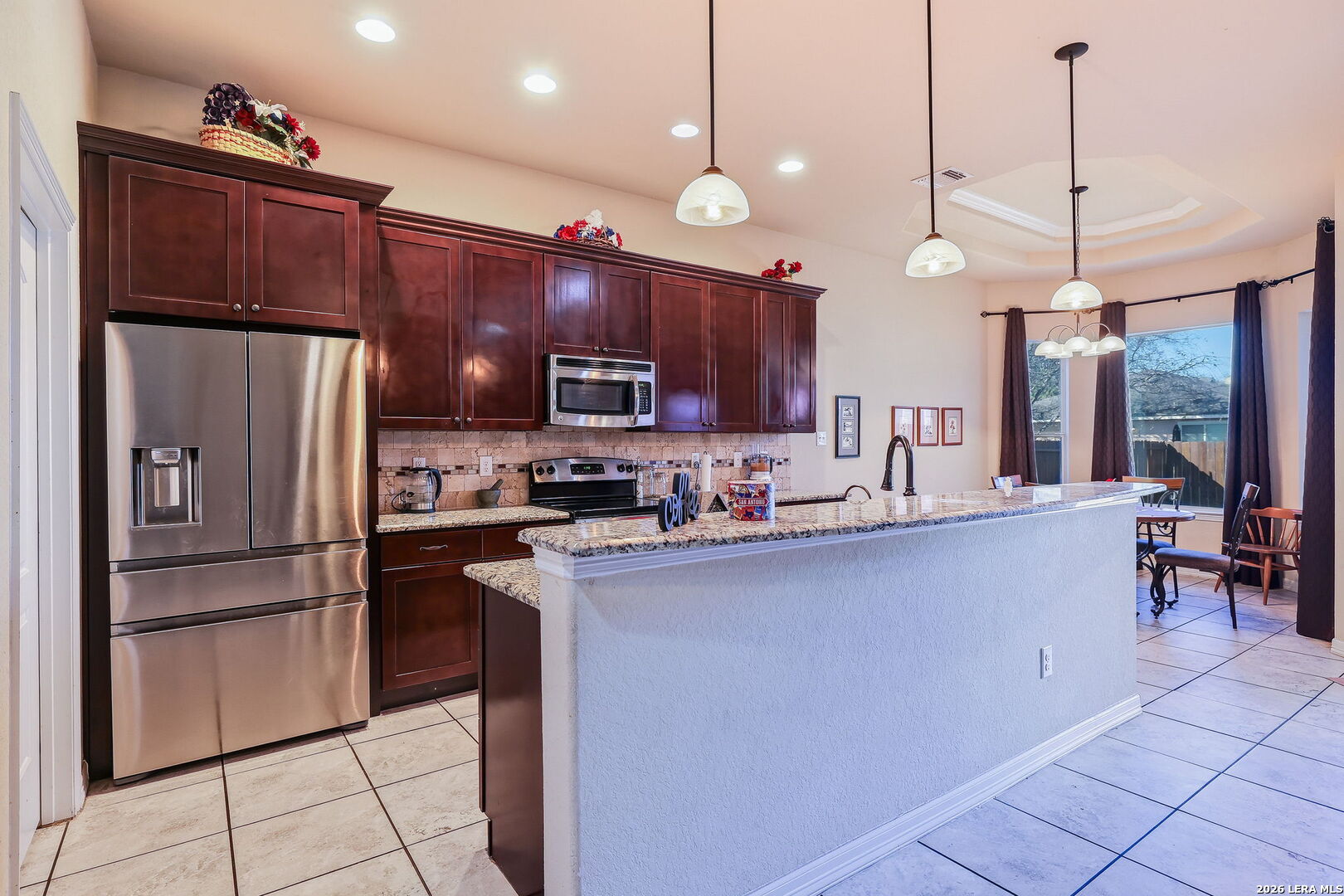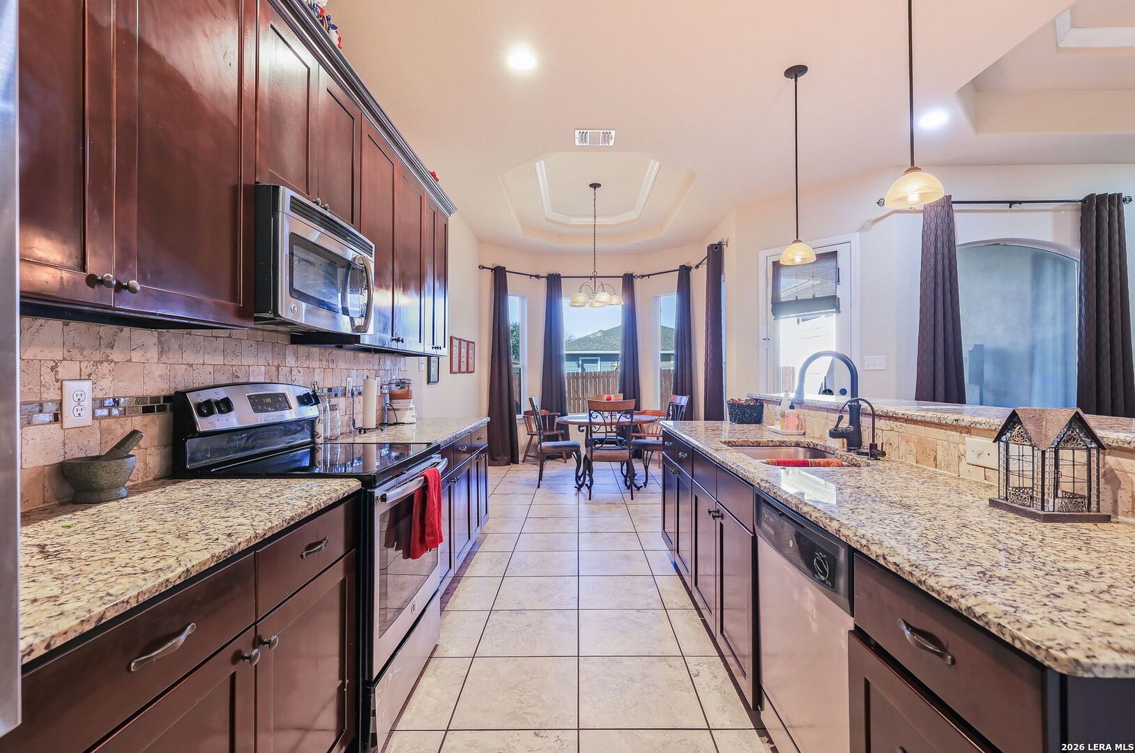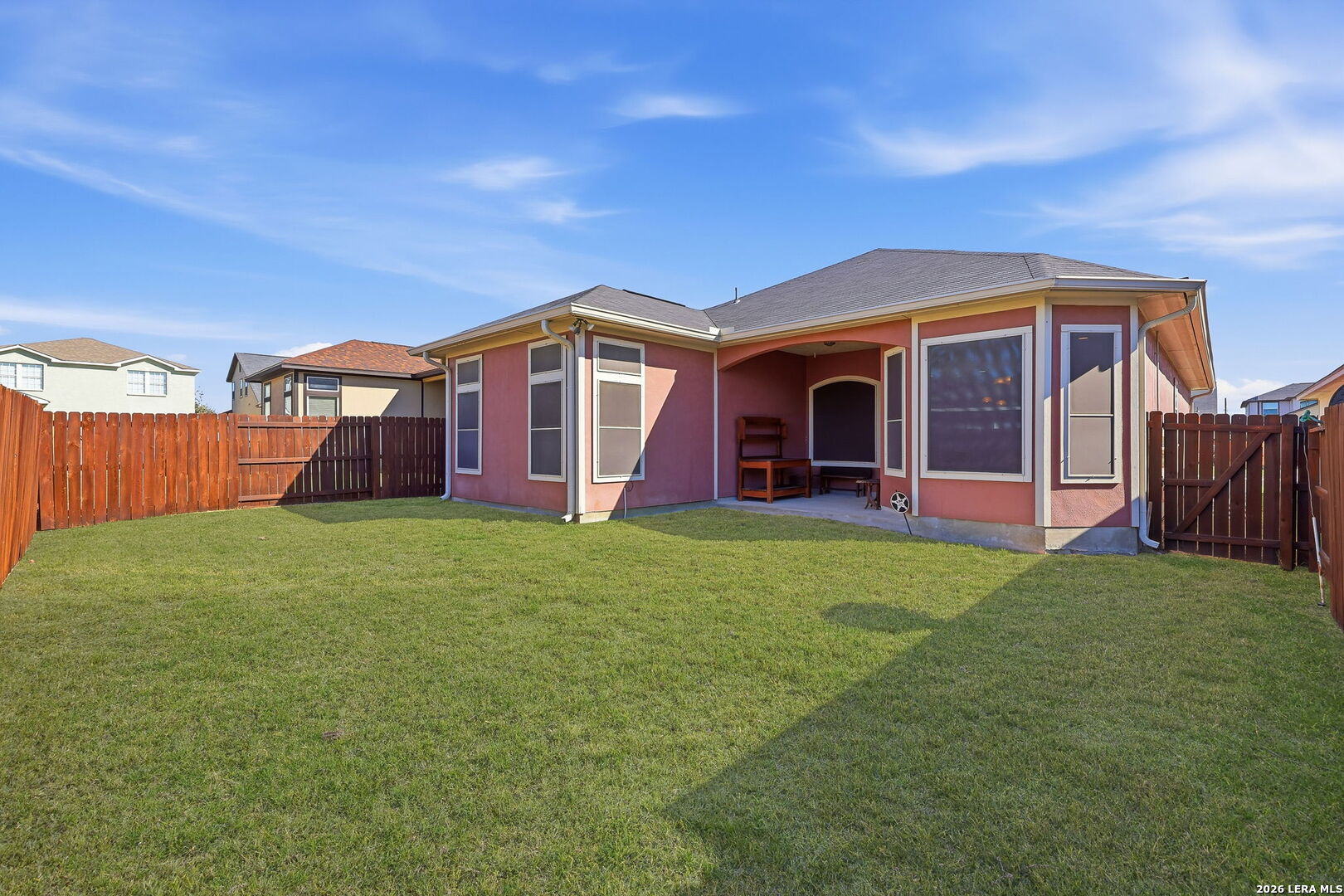 Beautiful single-story 3-bedroom, 2-bath home built in 2015 with a durable stucco finish on all four sides and gutters, offering 1,653 square feet of thoughtfully designed living space in the Key Largo subdivision. The open-concept layout seamlessly connects the living, kitchen, and dining areas-perfect for everyday living and entertaining. Tray ceilings in the living room, dining room, and primary bedroom add elegance and a spacious feel throughout. The kitchen features granite countertops, stainless steel appliances, an island for added prep and seating space, and a brand-new stove installed in 2026. The private primary suite provides a comfortable retreat, while secondary bedrooms offer flexibility for guests, a home office, or hobbies. A 2-car garage adds convenience and storage. Step outside to a covered back patio and backyard space ideal for relaxing or entertaining. With no HOA and a prime location near Randolph Air Force Base, Loop 1604, and IH-10, this move-in ready home offers easy access to shopping, dining, and major commuter routes-perfect for first-time buyers, downsizers, or anyone seeking convenient one-story living. Come see it now!