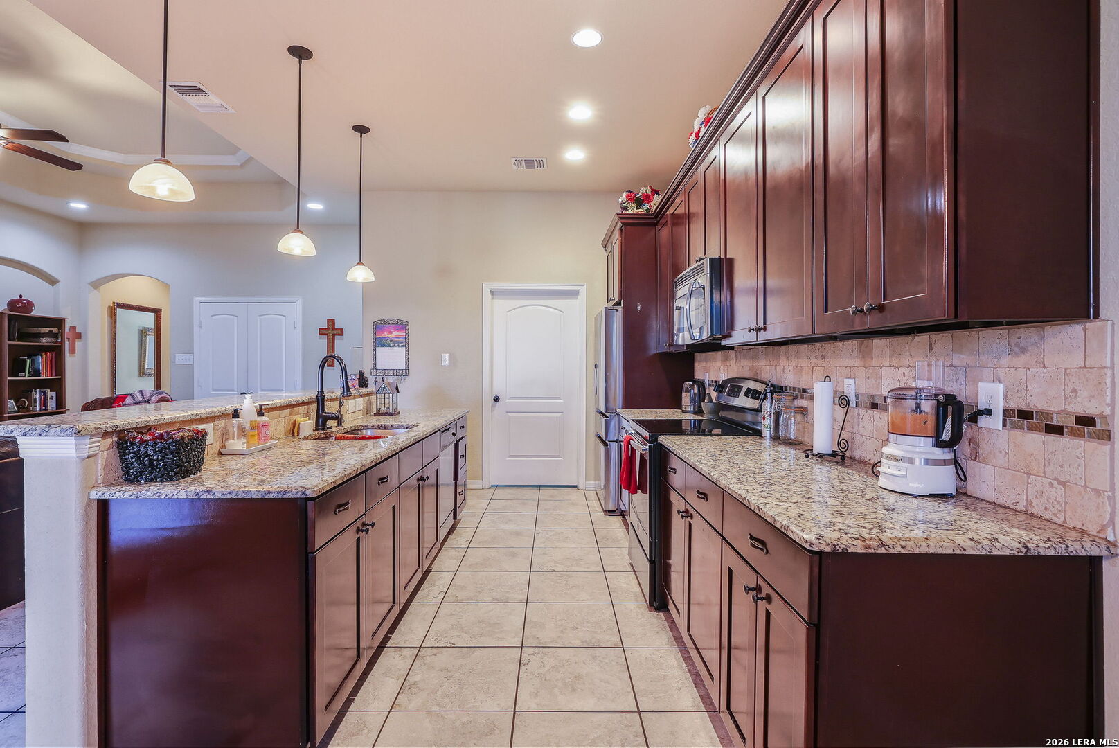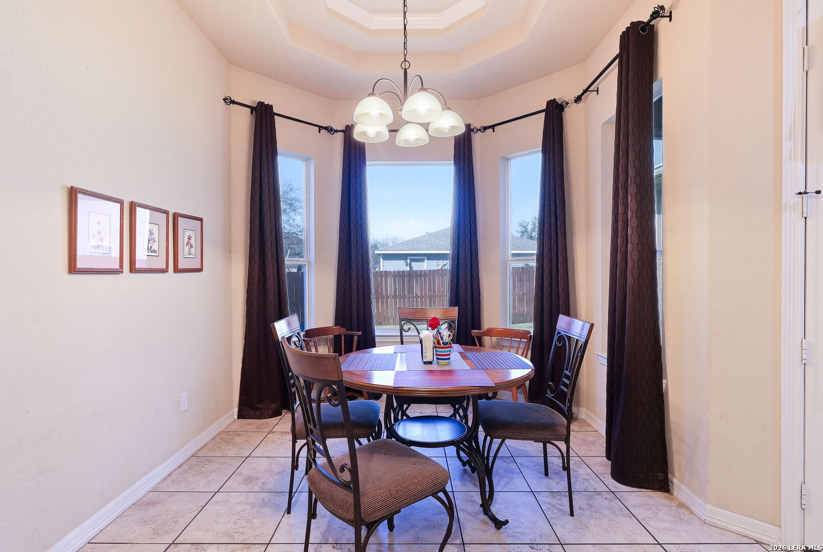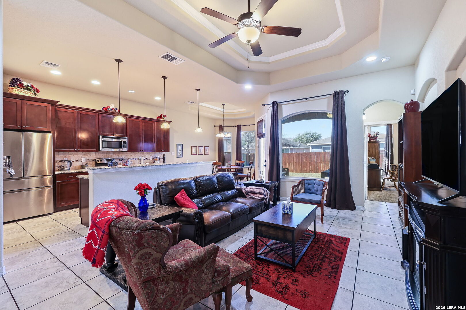 Beautiful single-story 3-bedroom, 2-bath home built in 2015 with a durable stucco finish on all four sides and gutters, offering 1,653 square feet of thoughtfully designed living space in the Key Largo subdivision. The open-concept layout seamlessly connects the living, kitchen, and dining areas-perfect for everyday living and entertaining. Tray ceilings in the living room, dining room, and primary bedroom add elegance and a spacious feel throughout. The kitchen features granite countertops, stainless steel appliances, an island for added prep and seating space, and a brand-new stove installed in 2026. The private primary suite provides a comfortable retreat, while secondary bedrooms offer flexibility for guests, a home office, or hobbies. A 2-car garage adds convenience and storage. Step outside to a covered back patio and backyard space ideal for relaxing or entertaining. With no HOA and a prime location near Randolph Air Force Base, Loop 1604, and IH-10, this move-in ready home offers easy access to shopping, dining, and major commuter routes-perfect for first-time buyers, downsizers, or anyone seeking convenient one-story living. Come see it now!