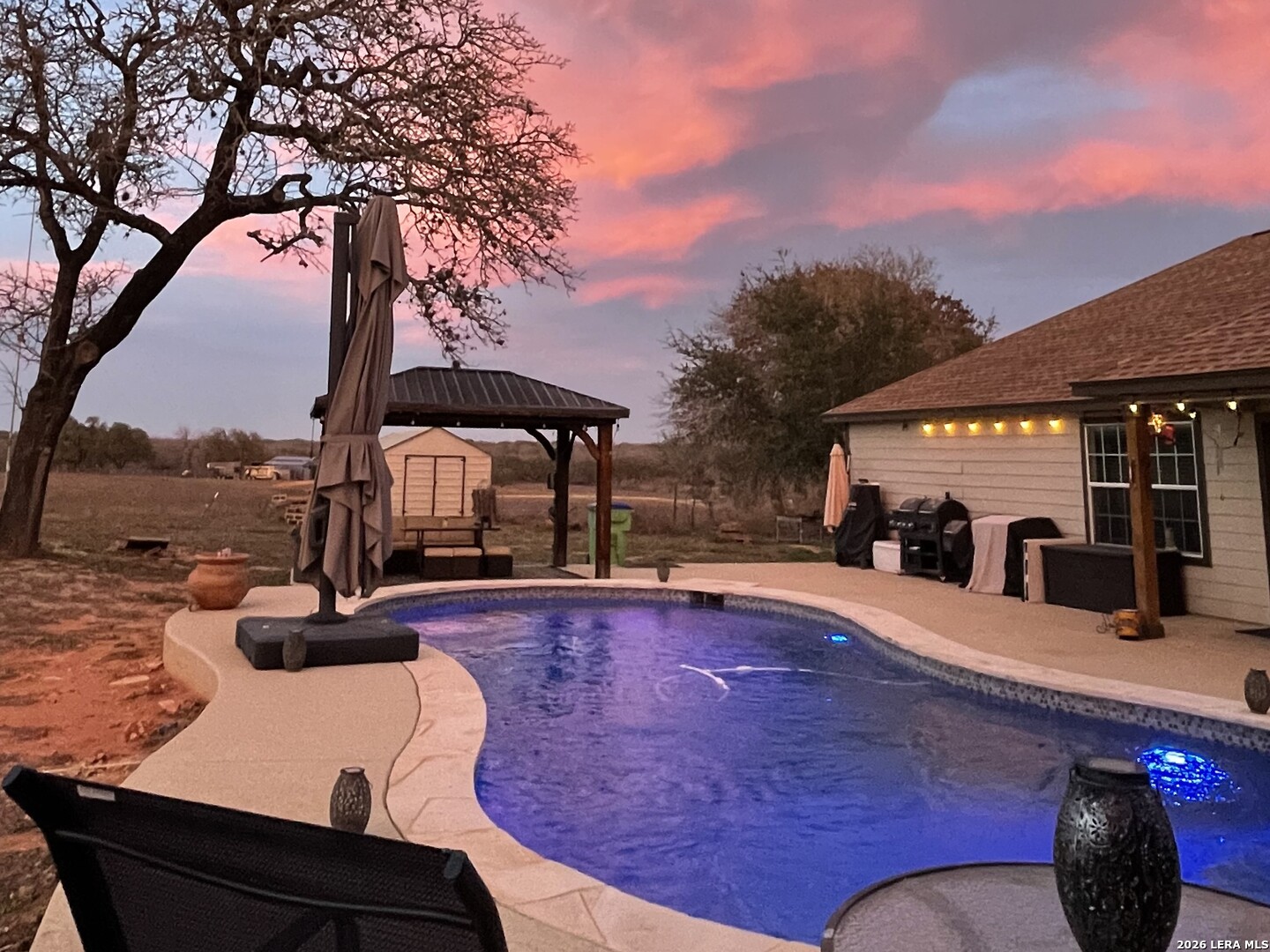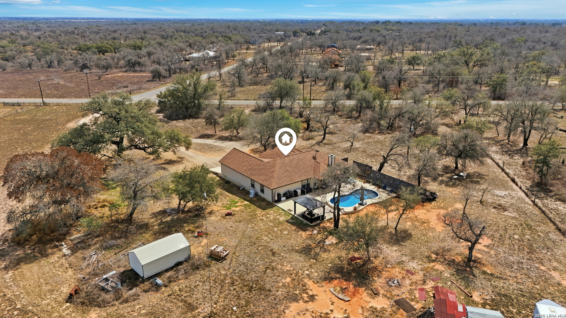 Situated on 10 private, UNRESTRICTED acres shaded by majestic oak trees in Clear Lake Ranches, 400 Clear Lake Drive offers the freedom, space, and versatility that true country living is all about. This 2010-built, 1,960 sq ft ranch-style home features three spacious bedrooms and an open-concept design that provides comfortable everyday living after a long day of work or play. Inside, you'll find granite countertops, tile flooring, and a wood-burning fireplace, perfect for cozy evenings during cooler Texas nights. The land is the real star of this property. With wide-open skies, breathtaking sunsets, and abundant wildlife, this acreage is ideal for hunting, livestock, recreational use, or simply enjoying your own private retreat. The property is unrestricted, giving you the flexibility to build, expand, bring animals, park equipment, or create the homestead you've been dreaming about. A chicken coop is currently home to four hens, offers fresh eggs and a head start toward sustainable living. There's ample space for additional outbuildings, gardens, workshops, trailers, or recreational vehicles. Outdoor living is equally inviting with a covered patio, gazebo, and in-ground pool, perfect for relaxing after working the land or entertaining. Recent improvements include a new mini-split outdoor condenser with UV filtration system, serviced every six months and backed by a transferable 15-year warranty. The exterior features durable Hardie Board (fiber cement) siding, fire-resistant, low maintenance, and built to last. Located in Poteet, known for its agricultural roots and annual Strawberry Festival, this property combines rural tranquility with a strong sense of community. Whether you're looking for a private hunting retreat, a working homestead, or a peaceful ranch lifestyle with room to grow, this property delivers the space, freedom, and opportunity that are increasingly hard to find.